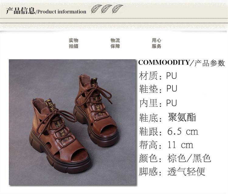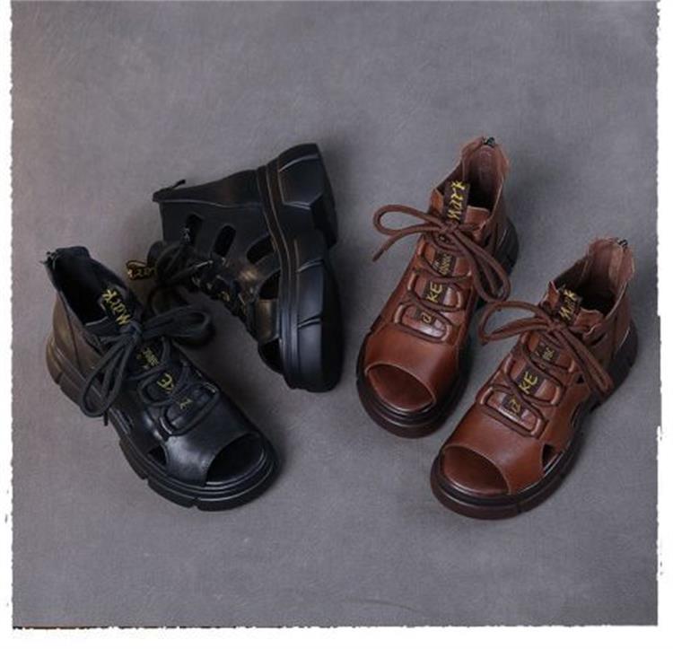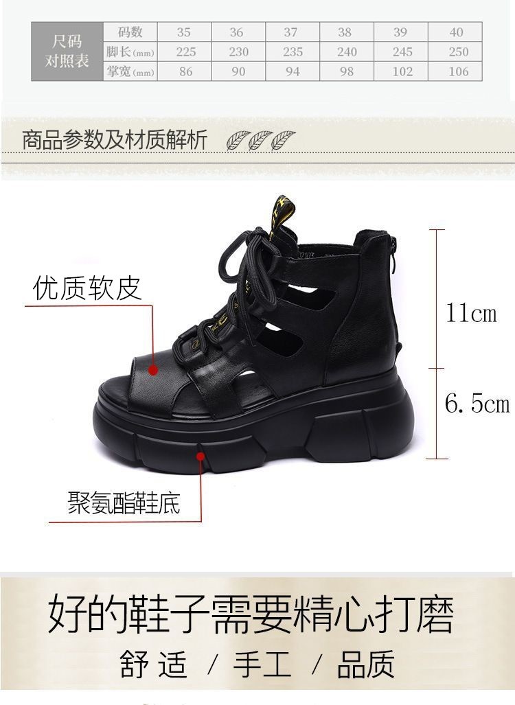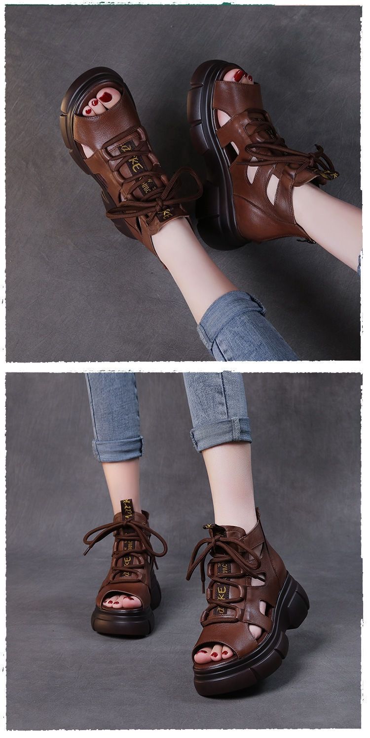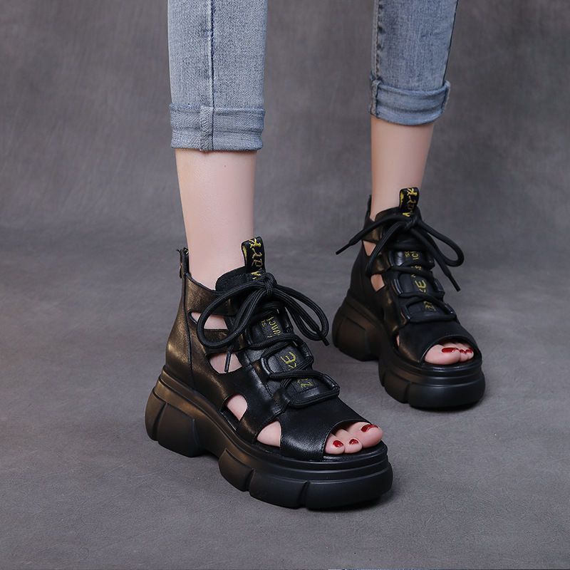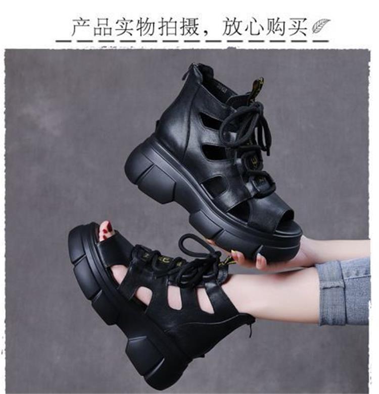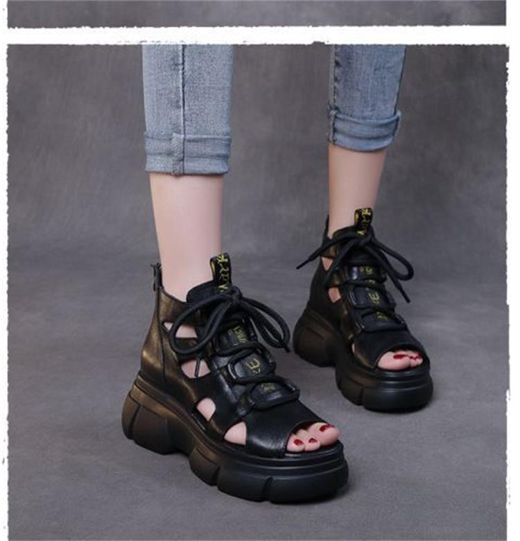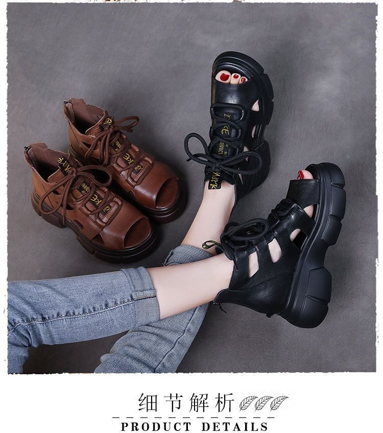 대외 무역 크로스보더 두꺼운 밑창 복고풍 부드러운 가죽 중공 여성 샌들 여름 플랫폼 밑창 중간 굽 물고기 입 레이스 업 플랫 샌들스토어 가기