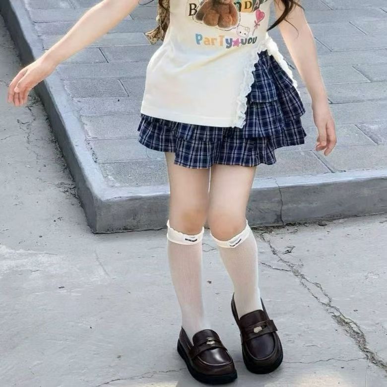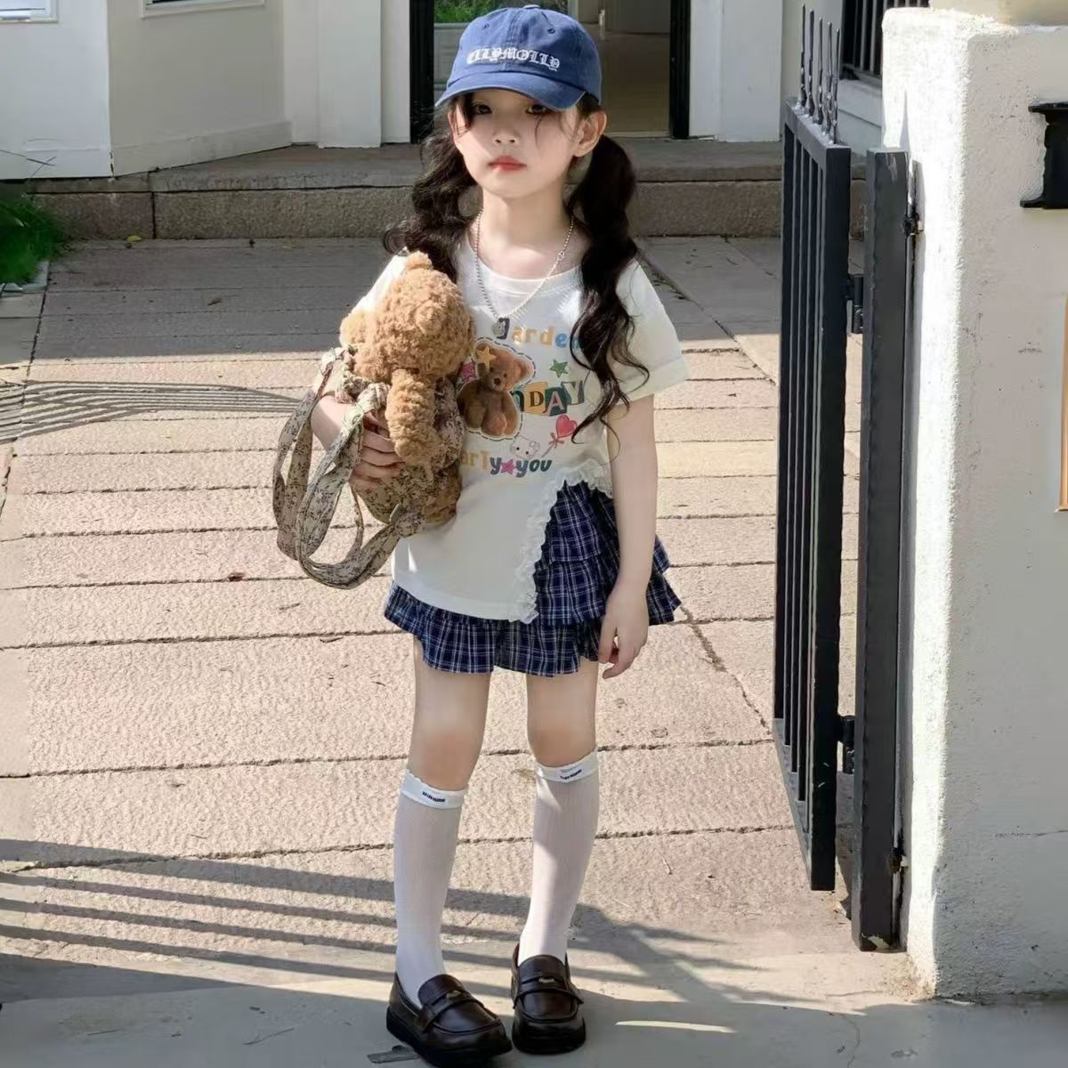 여자 여름 반팔 티셔츠 격자 무늬 스커트 투피스 세트 2025 새로운 스타일 어린이 스타일 반팔 탑과 스커트 유행스토어 가기