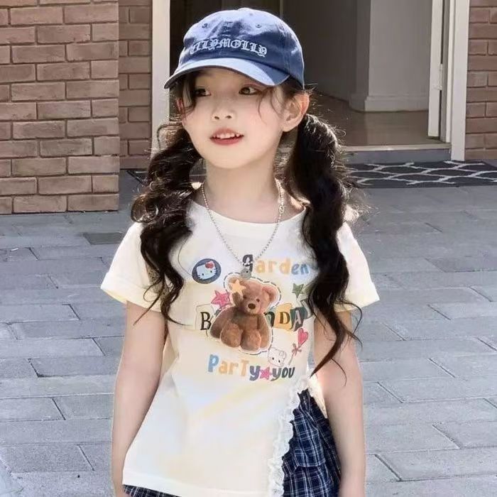 여자 여름 반팔 티셔츠 격자 무늬 스커트 투피스 세트 2025 새로운 스타일 어린이 스타일 반팔 탑과 스커트 유행