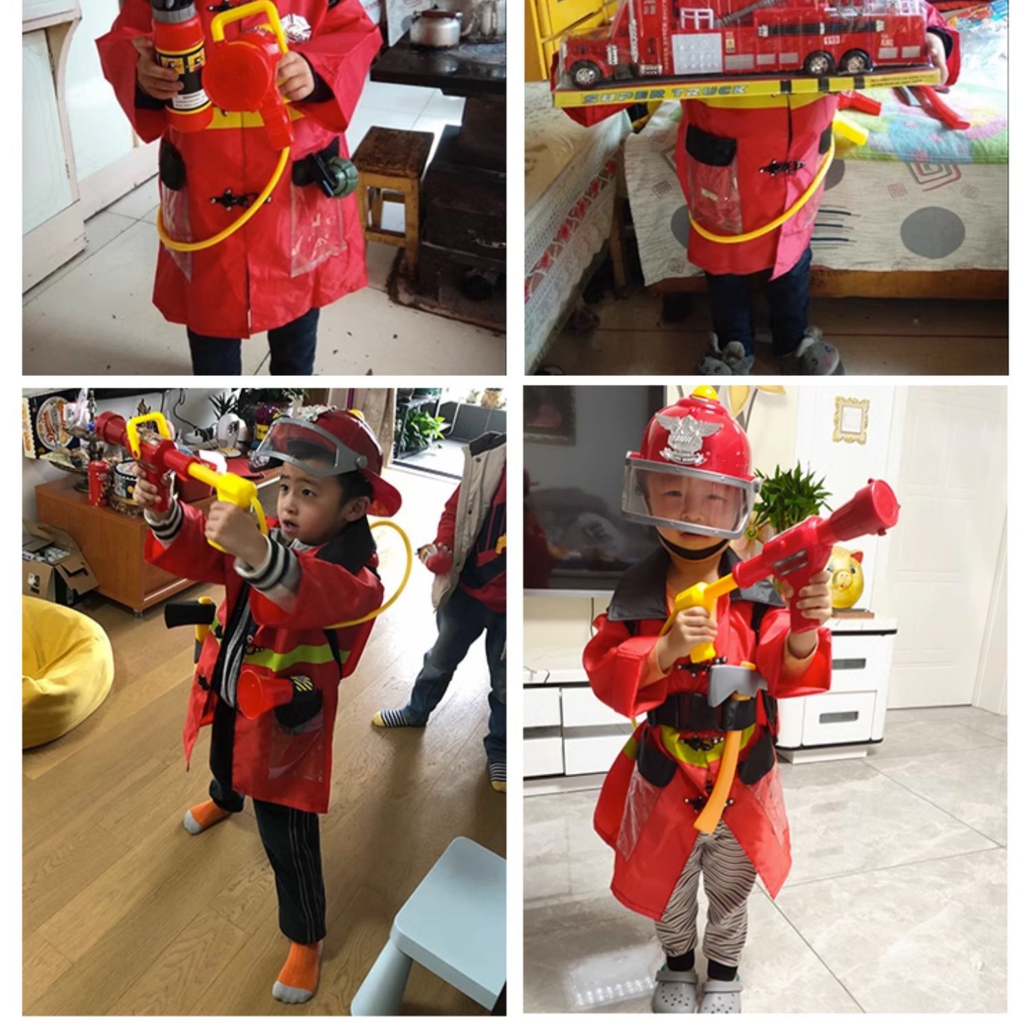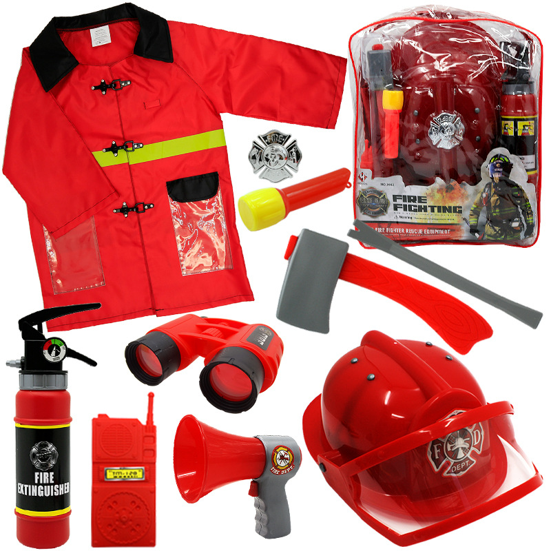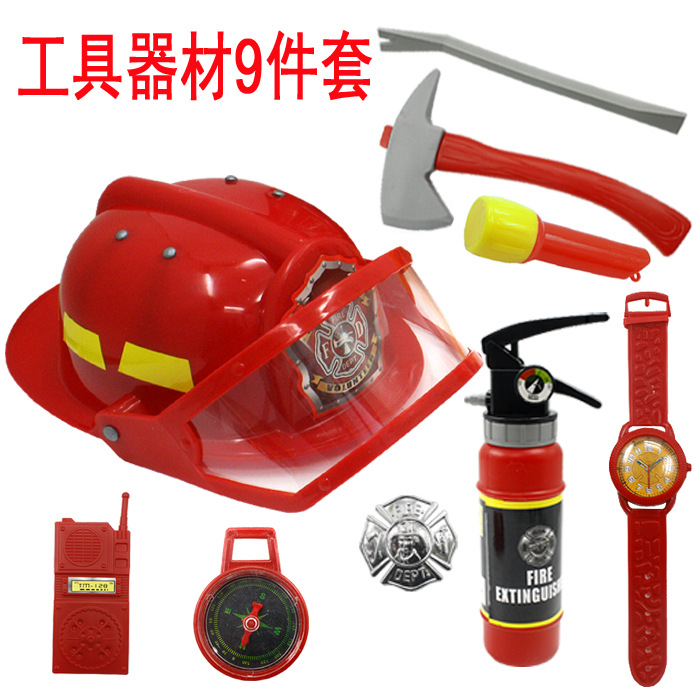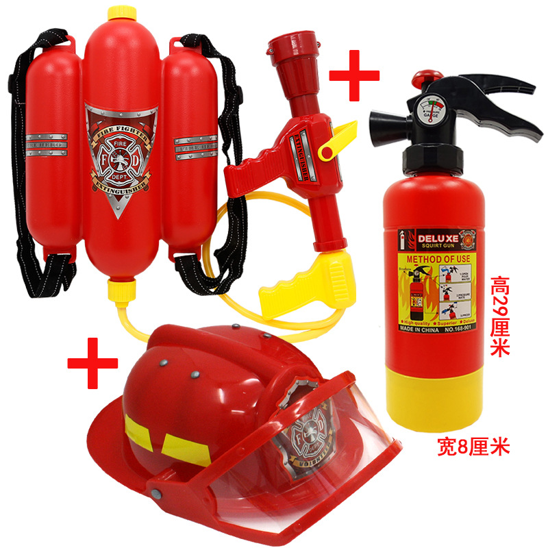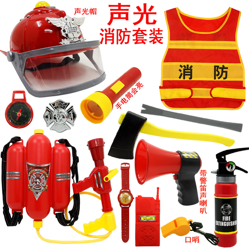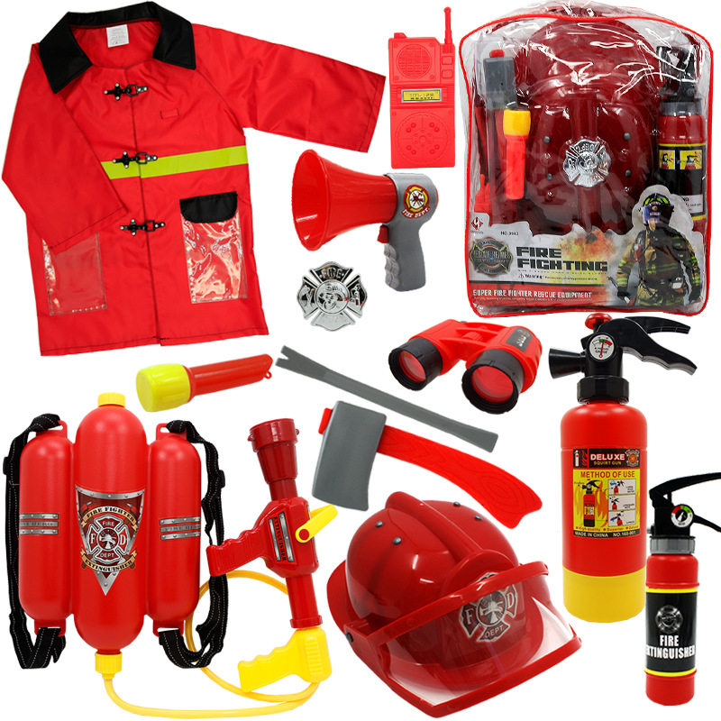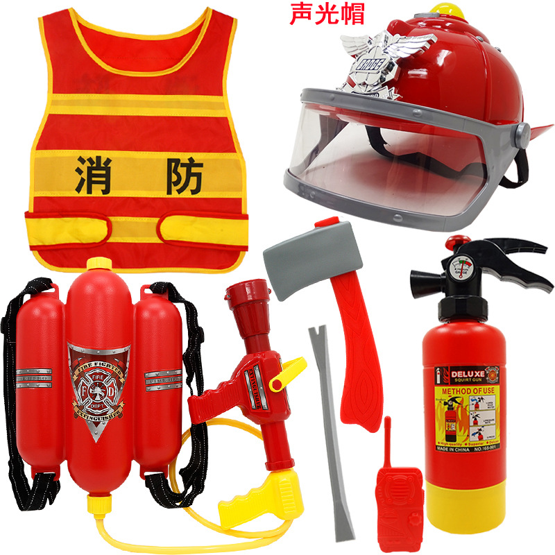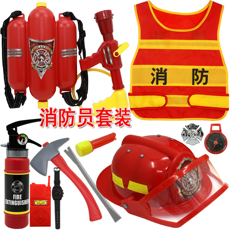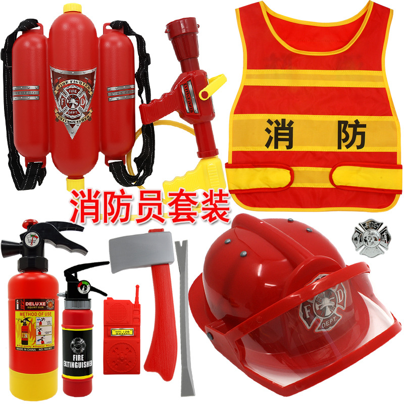 어린이 소방관 장난감 샘 세트 장비 유치원 역할 놀이 의상 소화기 조끼 모자 물총