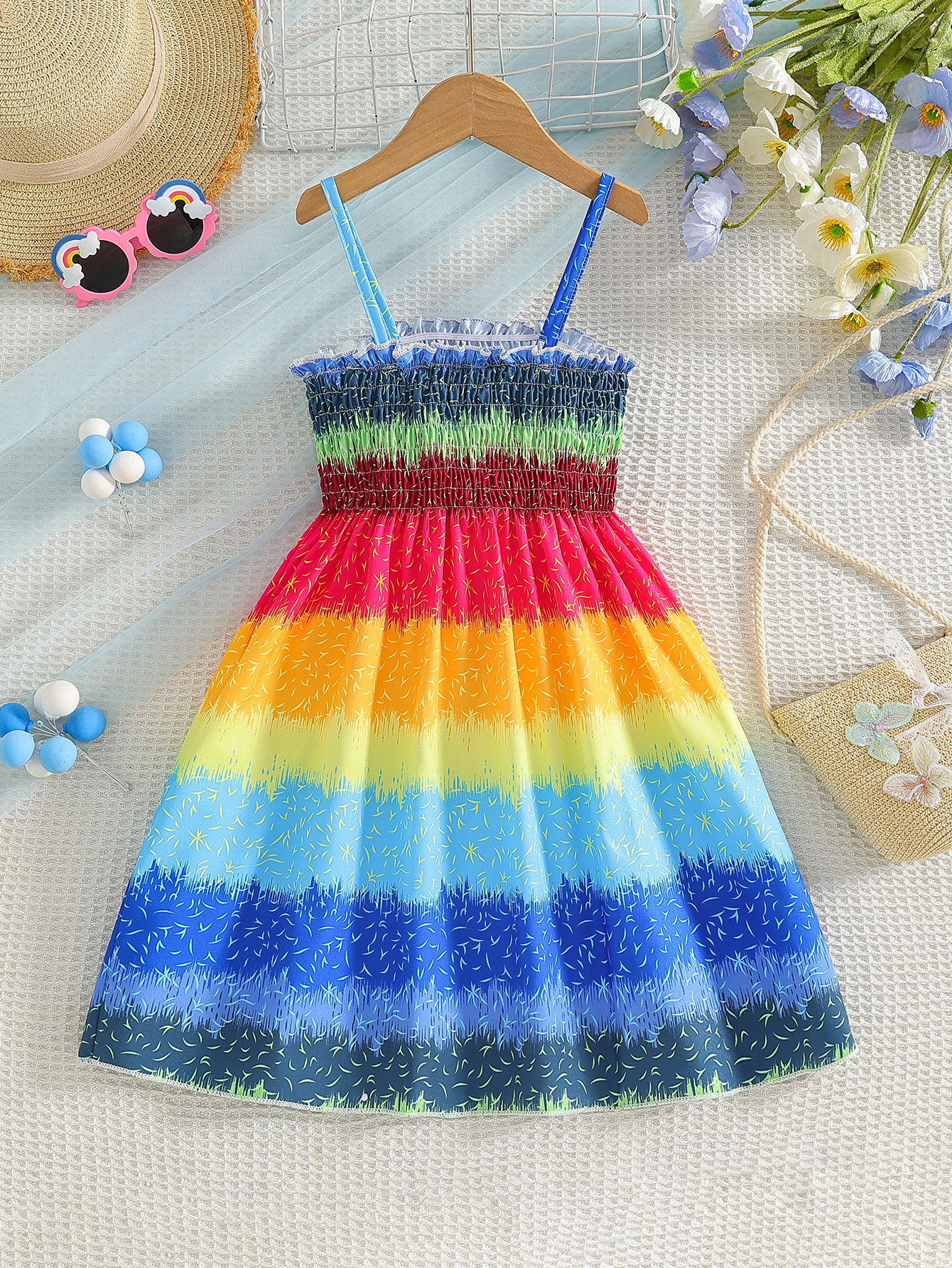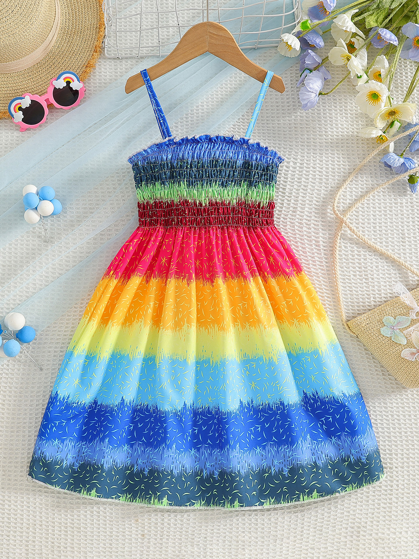 국경 간 소녀 서스펜더 드레스 레인보우 그라데이션 스플 라이스 보헤미안 해변 휴가 어린이 여름 롱 스커트