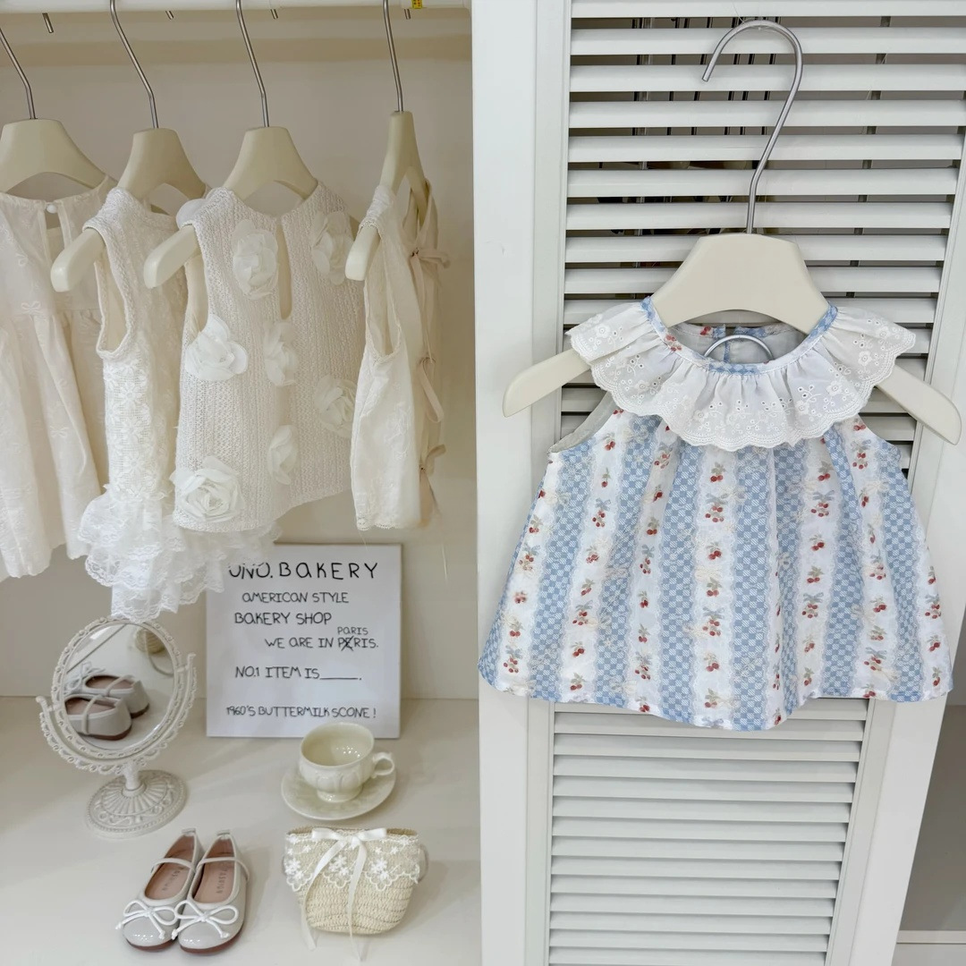 [Chongxingyuan] 오리지널 오뜨 꾸뛰르 여아 여름 블루 체리 세로 패턴 조끼 탑 캐주얼 바지 정장 트렌디스토어 가기