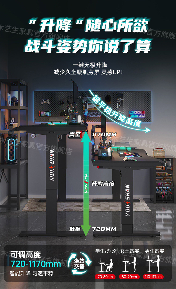 E-스포츠 테이블, 지능형 전동 리프트 테이블, 컴퓨터 테이블, 데스크탑 홈 스터디 테이블, 리프팅이 가능한 경쟁 게임 테이블스토어 가기