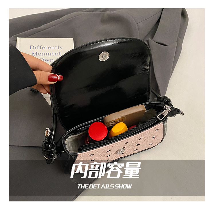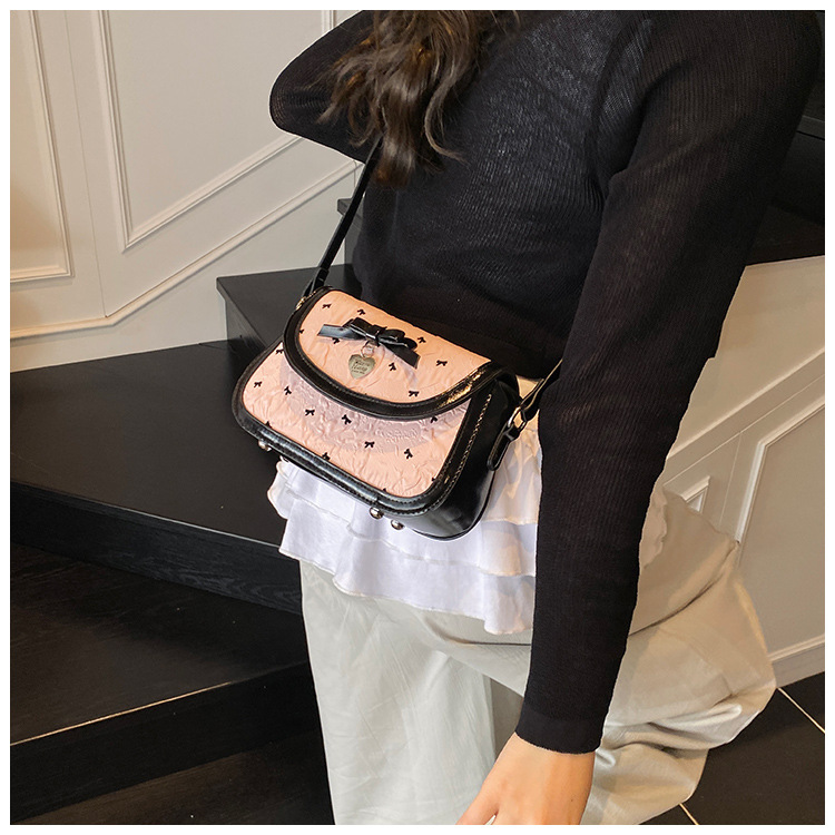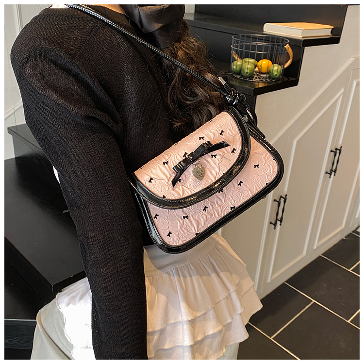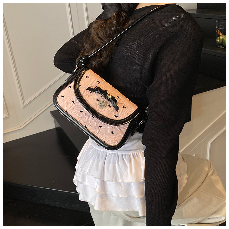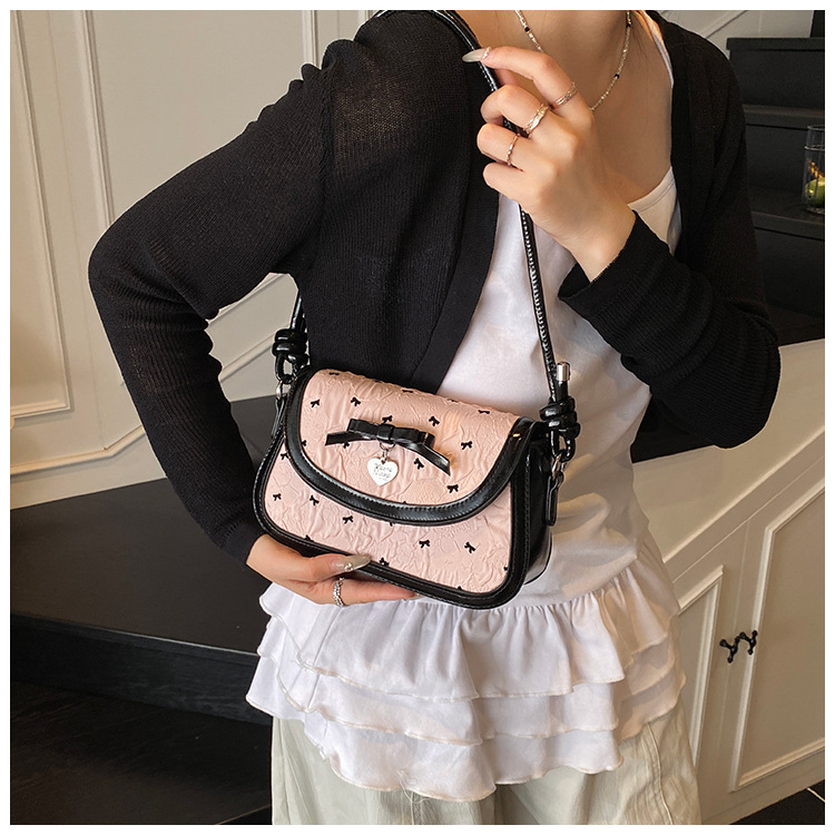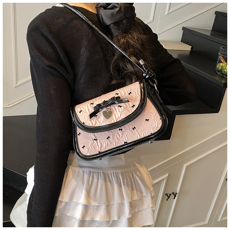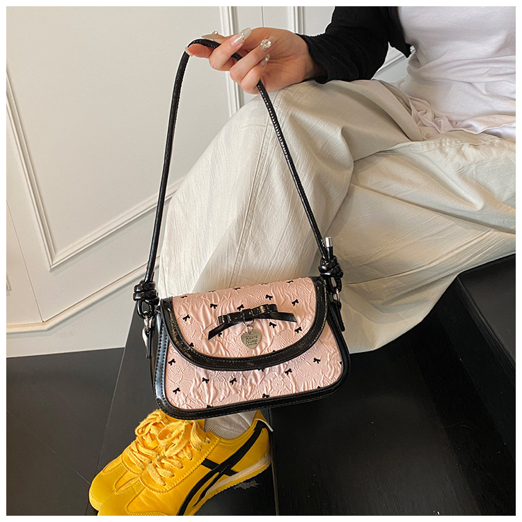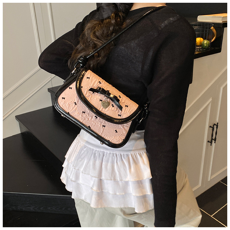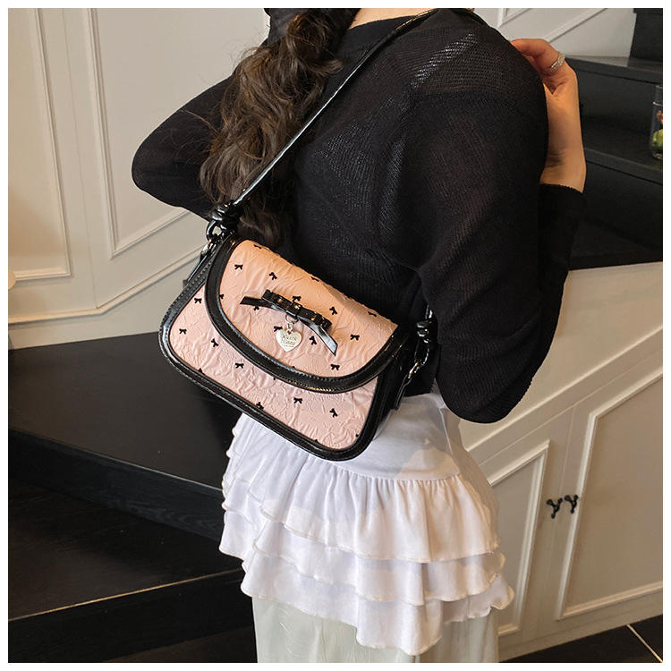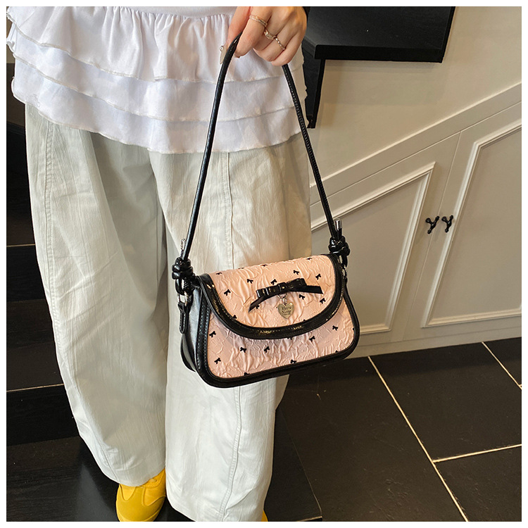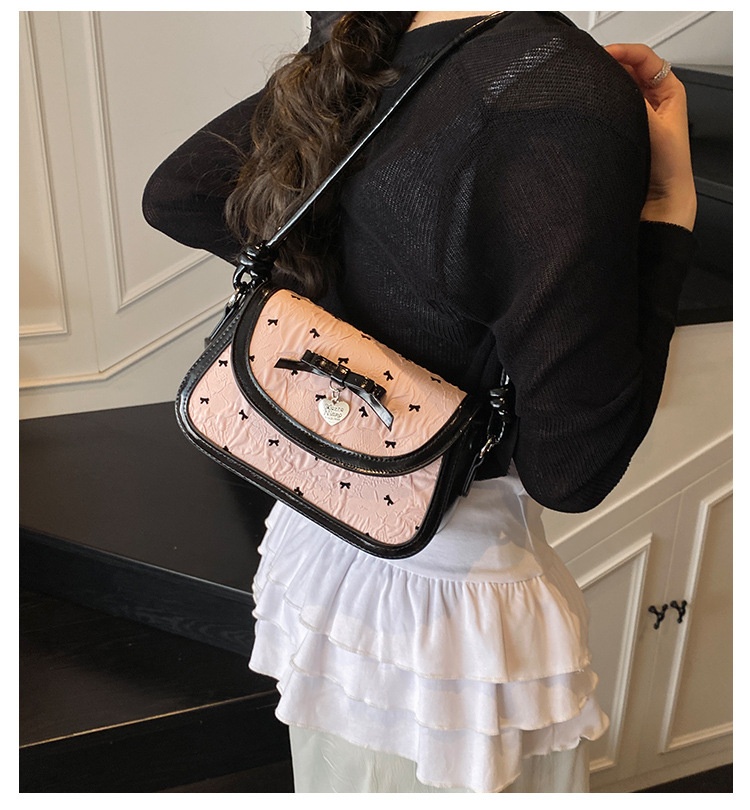 블랙과 핑크의 대비되는 리본 작은 가방 여성 2025 여름 새로운 어깨 겨드랑이 가방 세련된 폴카 도트 손 가방
