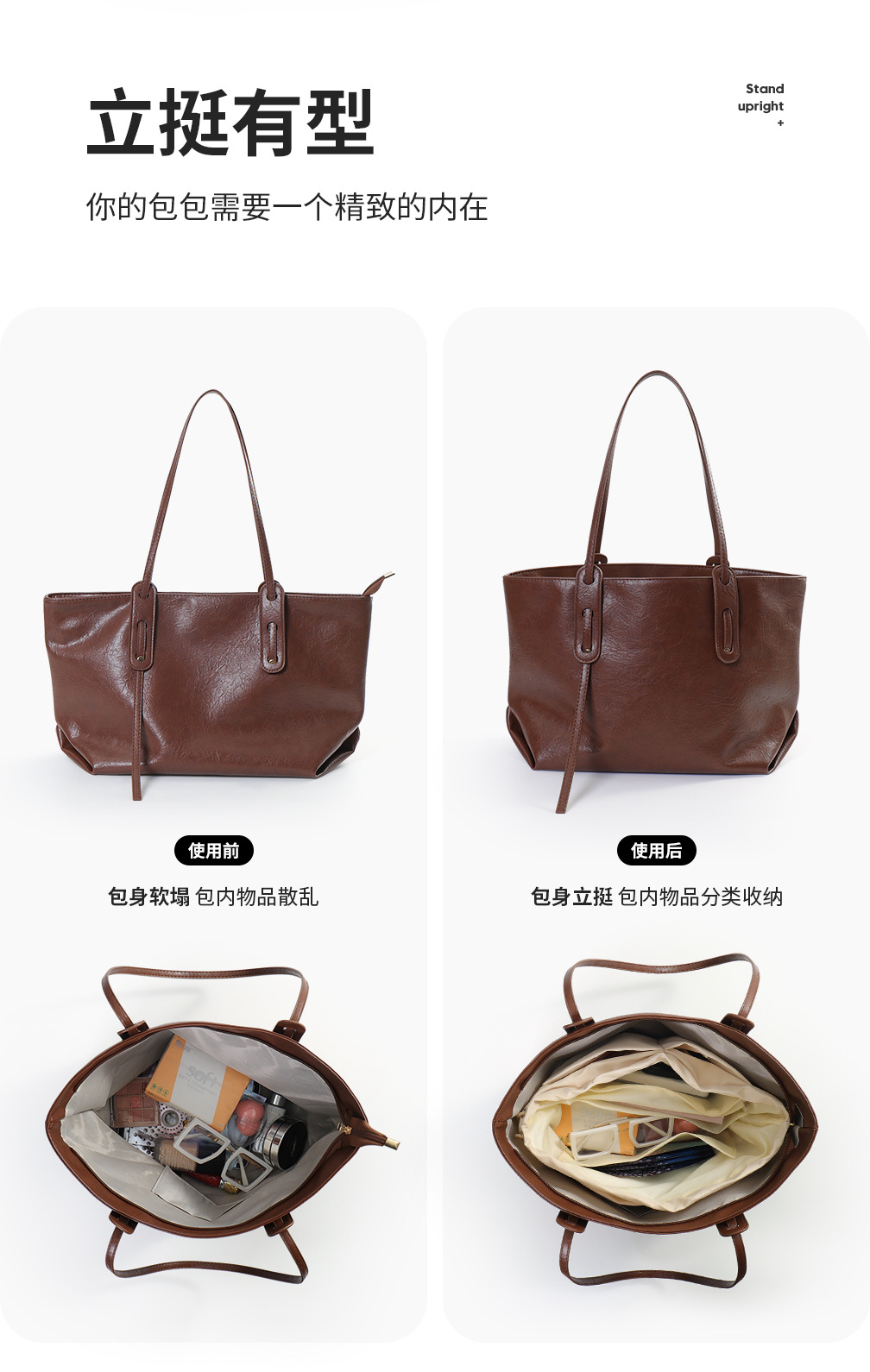 토트백에 적합, 중간 가방 라이너 수납, 북 토트, 초경량 안감, 새틴 칸막이, 내장 가방 내부 포켓