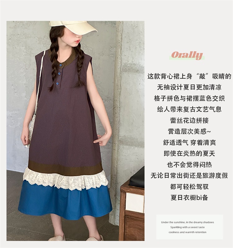 여자 드레스 2025 여름 새로운 어린이 숲 스타일 다층 레이스 대비 색 기질 큰 어린이 민소매 스커트
