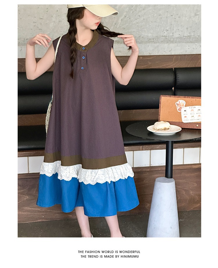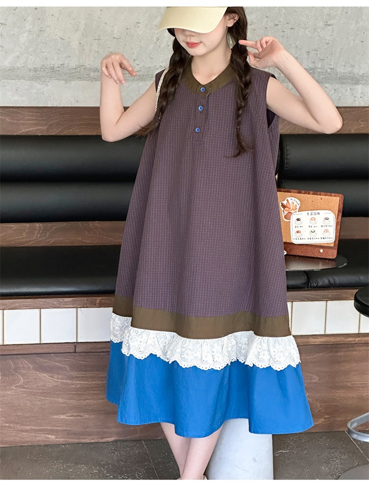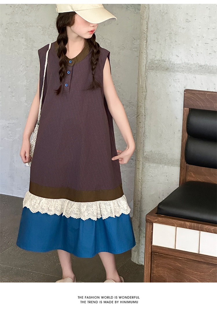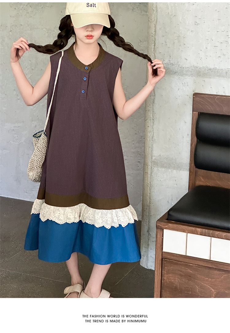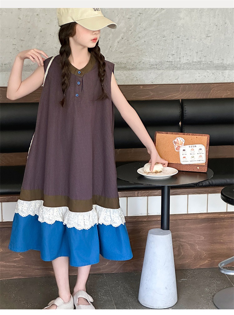 여자 드레스 2025 여름 새로운 어린이 숲 스타일 다층 레이스 대비 색 기질 큰 어린이 민소매 스커트스토어 가기