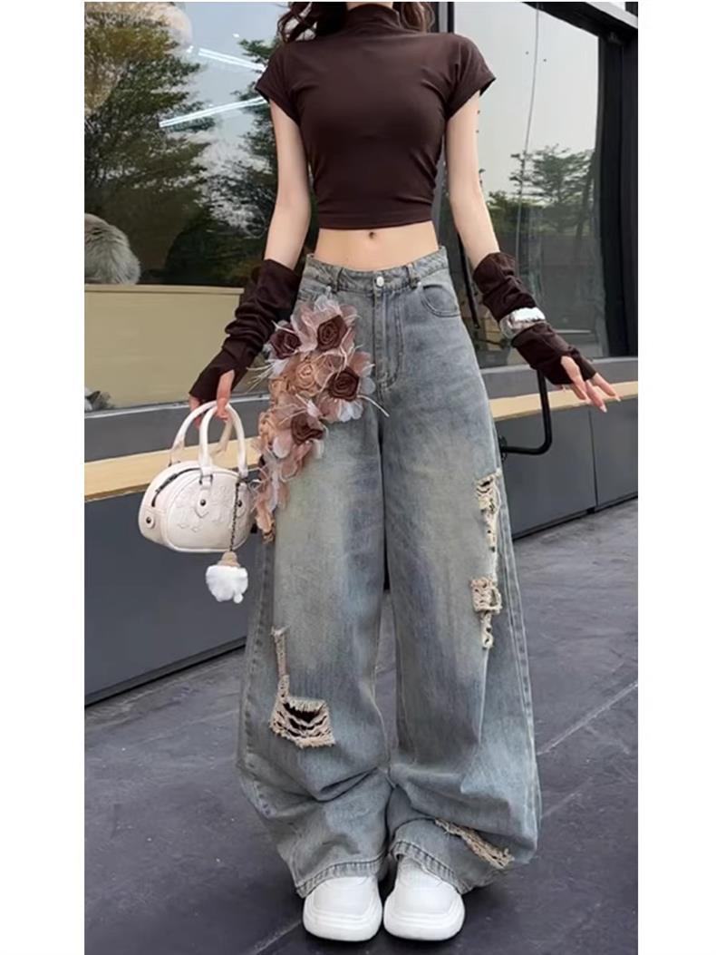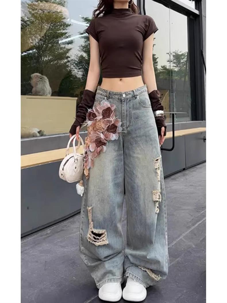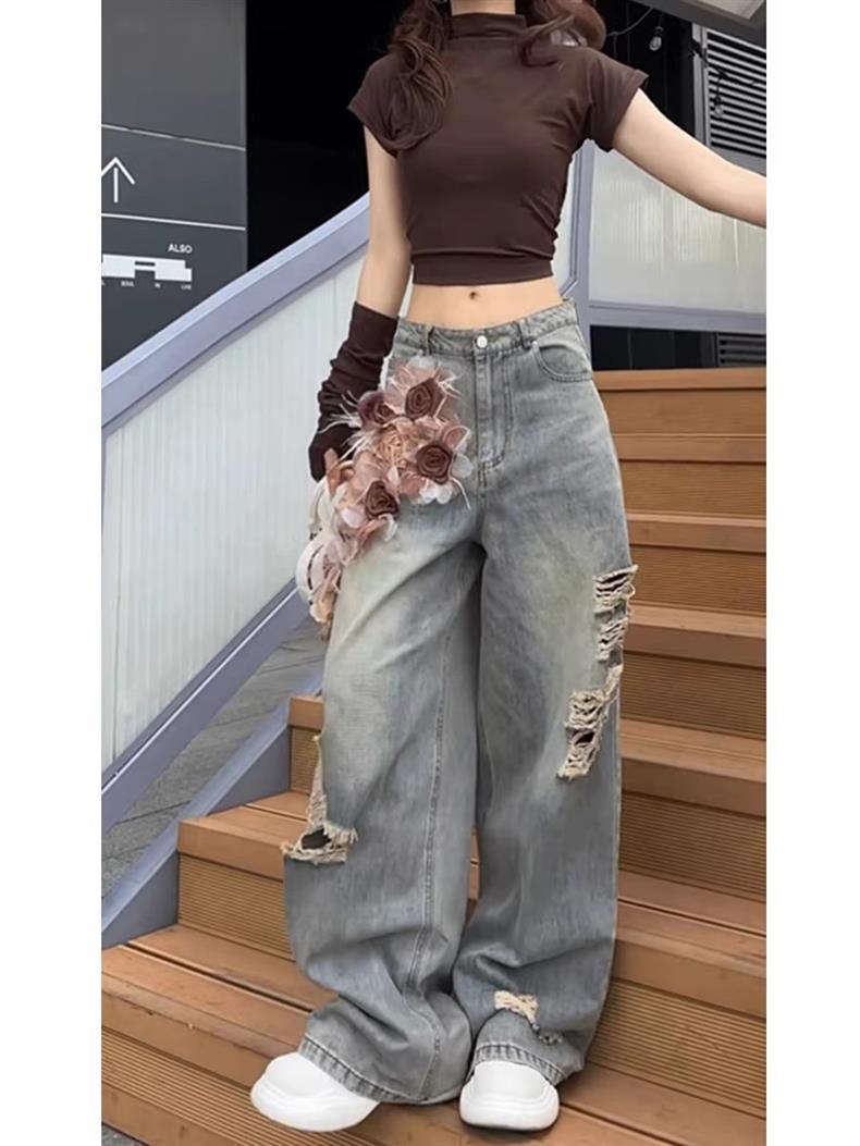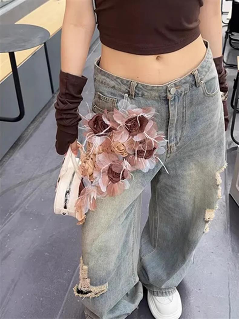 하이웨이스트 루즈 슬리밍 캐주얼 디자인 헤비듀티 입체 꽃 여성 여름 패션 팬츠 찢어진 데님 와이드 팬츠