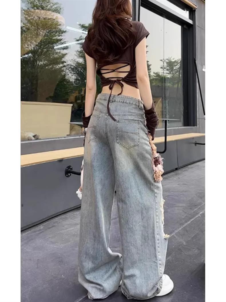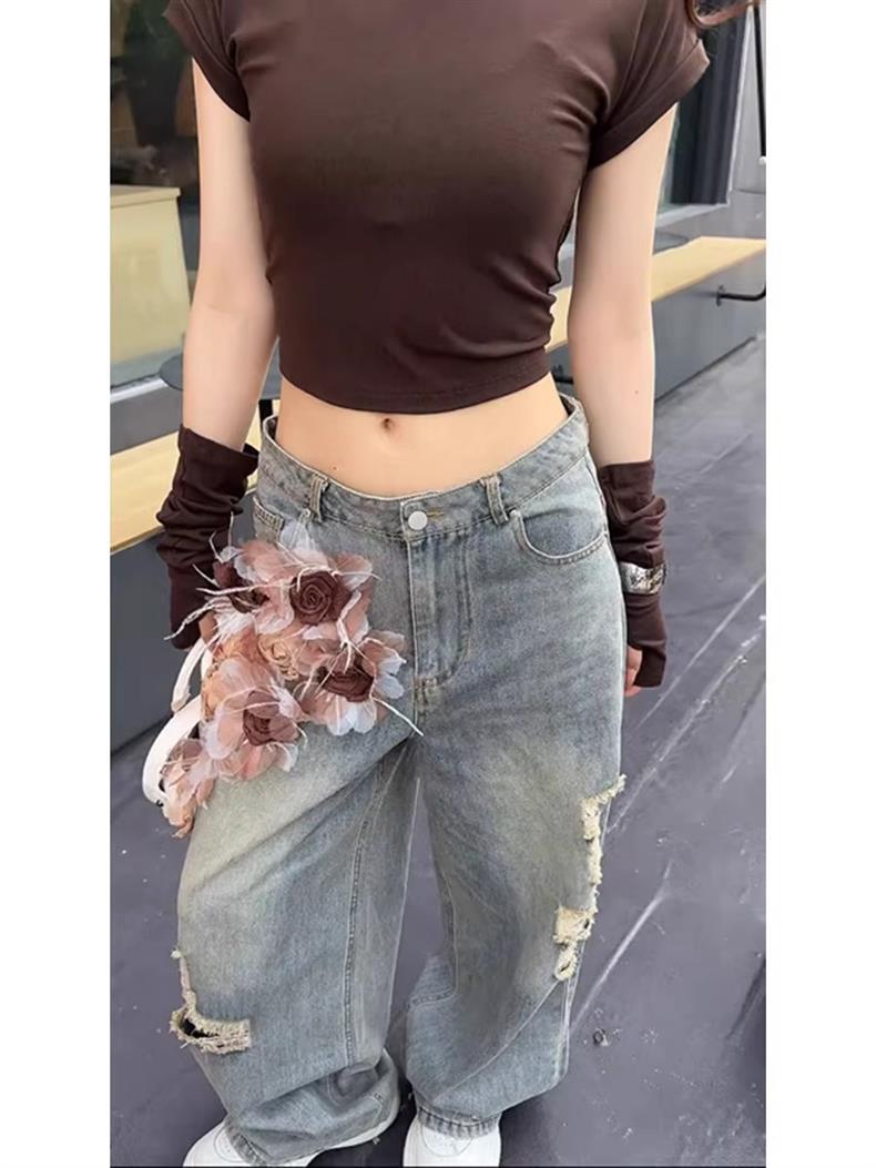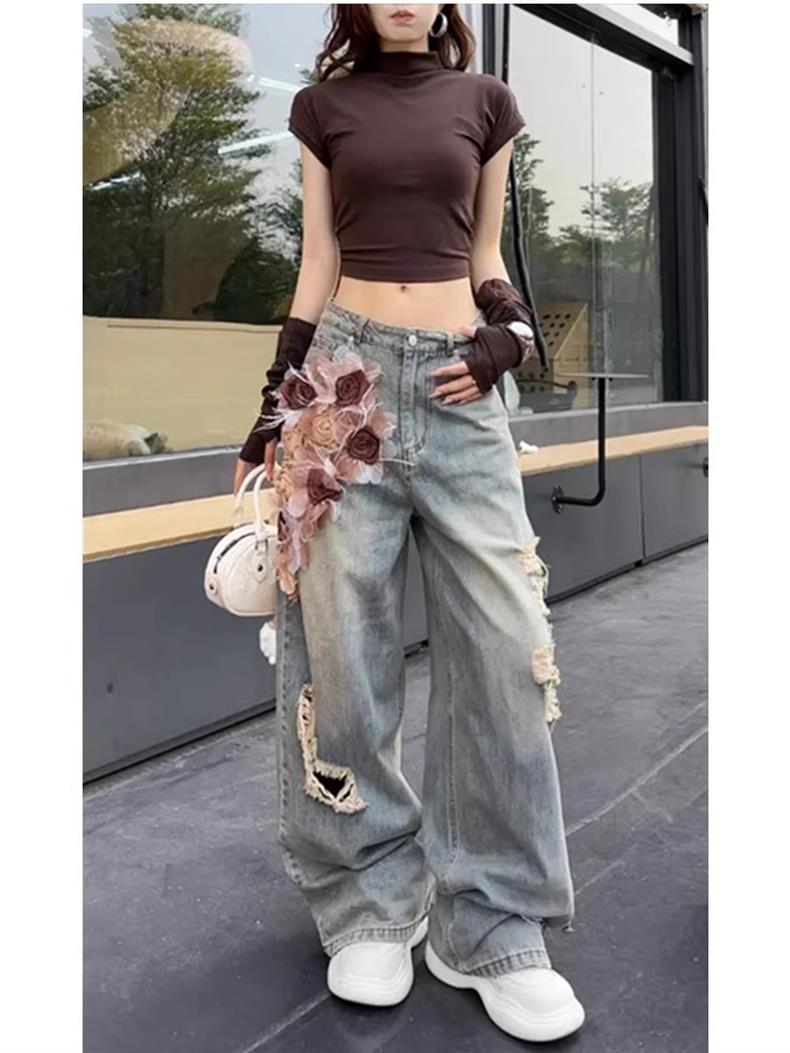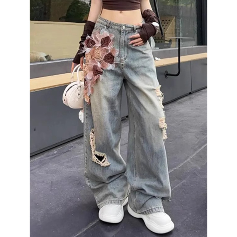 하이웨이스트 루즈 슬리밍 캐주얼 디자인 헤비듀티 입체 꽃 여성 여름 패션 팬츠 찢어진 데님 와이드 팬츠