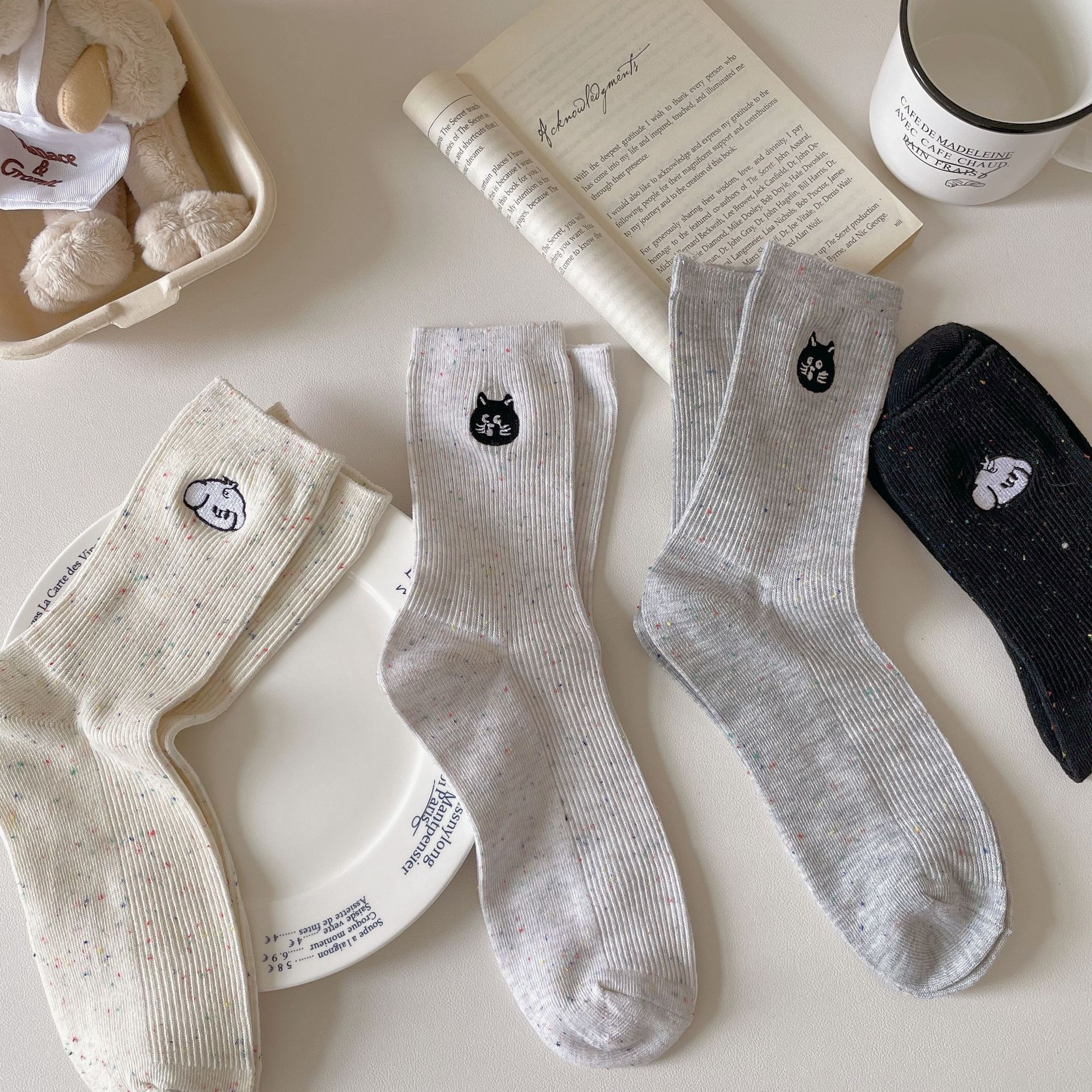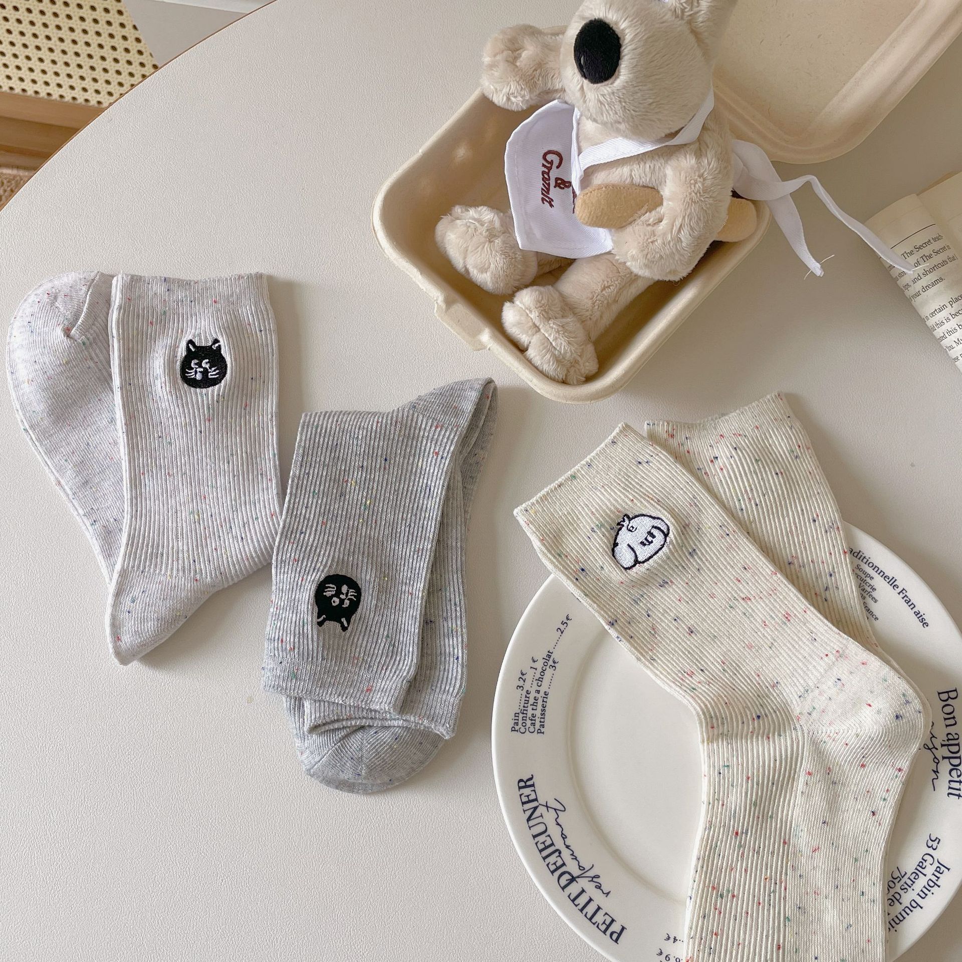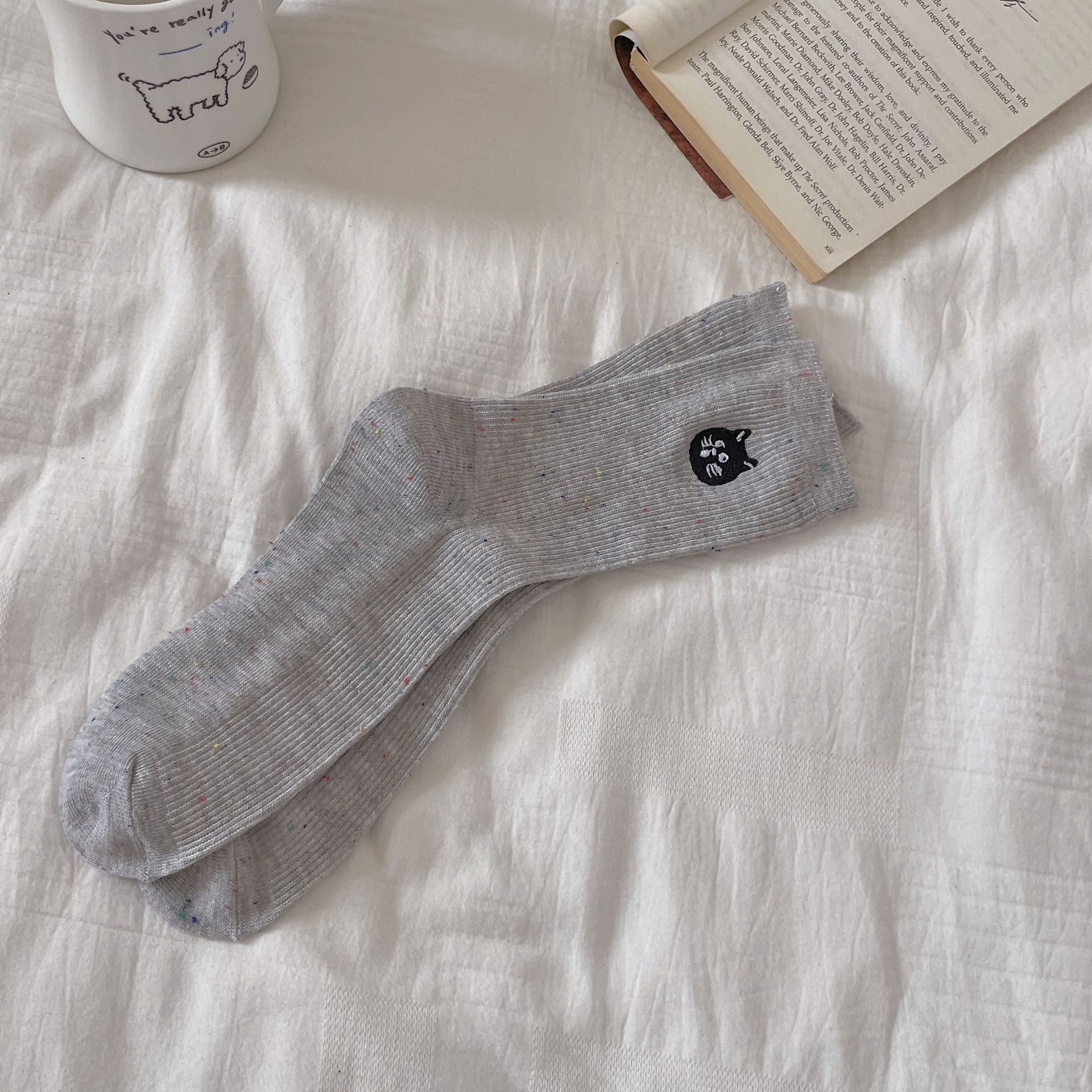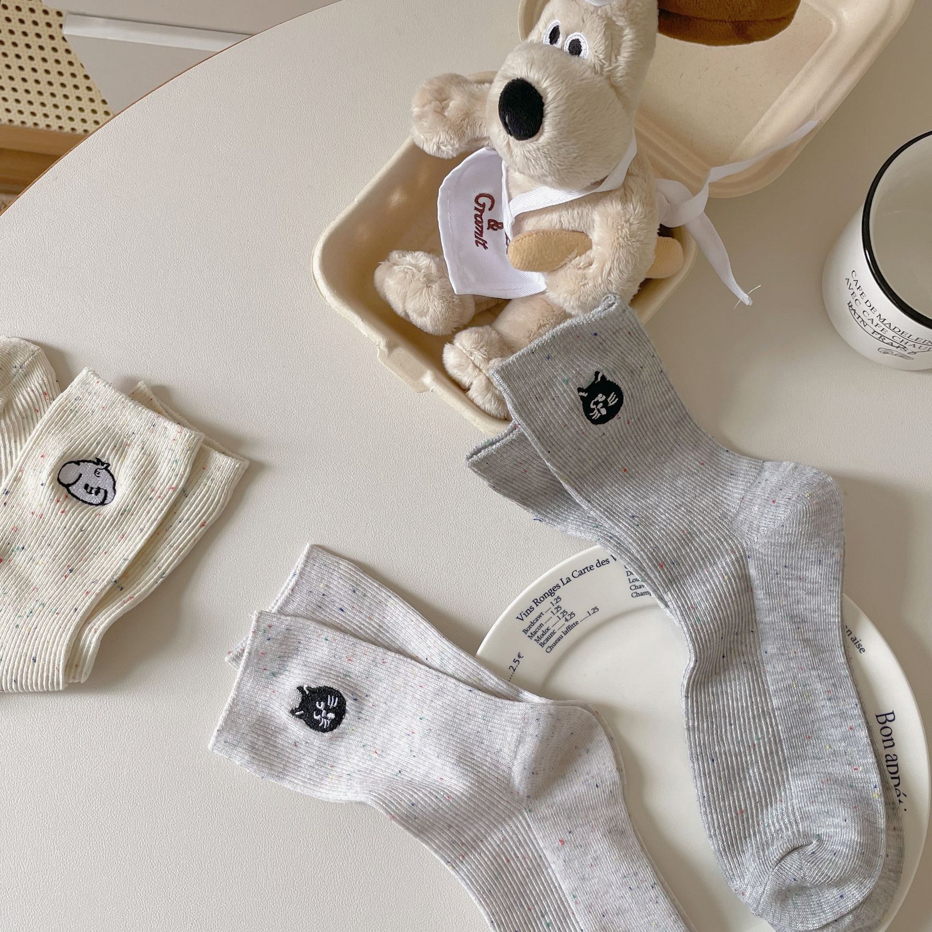 한국 아이디어 원사 봄과 여름 강아지 자수 귀여운 양말 남성과 여성 만화 중간 튜브 양말 푹신한 양말 여성 맞춤형면 양말