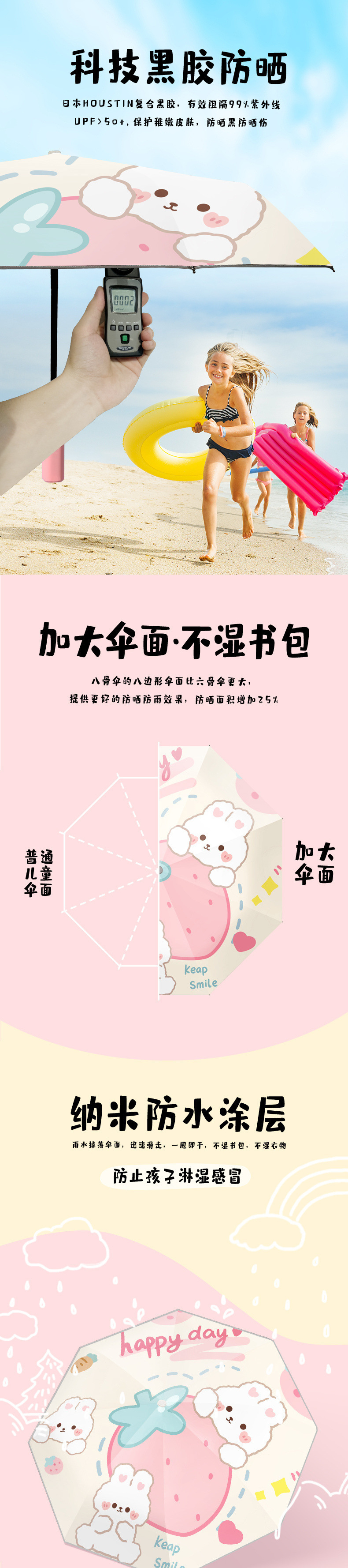 딸기 토끼 안전 자동 반동 방지 어린이 우산 소녀 학교 특수 우산 비 또는 빛 강한 접는 우산