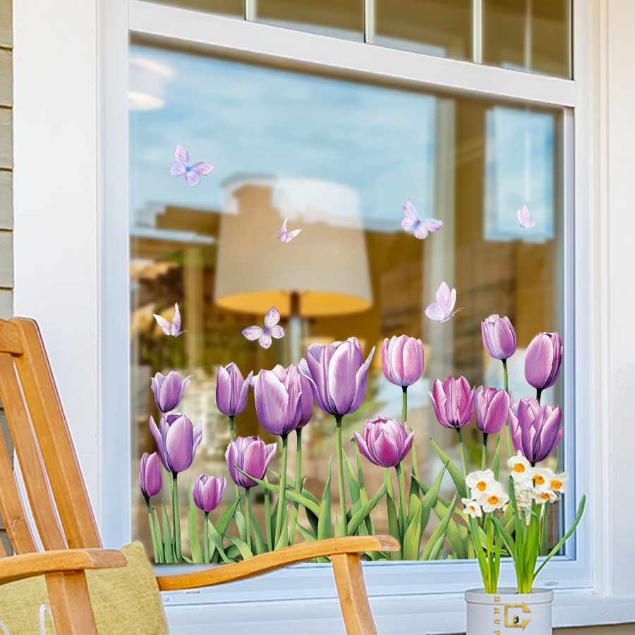 BR-UV3895E 보라색 튤립 나비 자체 접착 창 스티커 욕실 침실 미화 이동식 장식 스티커