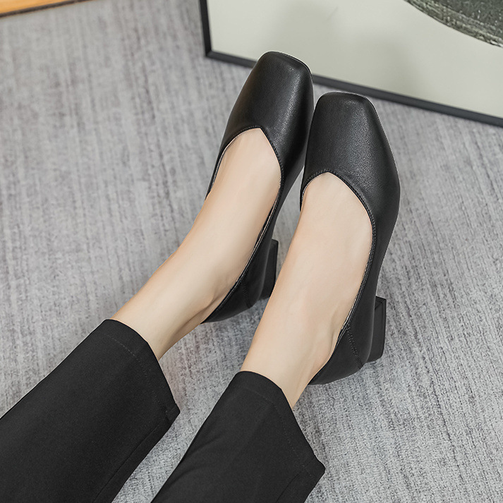 [3372명이 즐겨찾는] 여성용 스퀘어토 싱글슈즈, 두꺼운 굽, 천연가죽, 전문적인 기질, 스튜어디스 워크슈즈, 장시간 서 있어도 편안함
