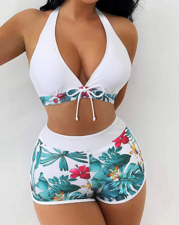아마존 대외 무역 비키니 2025 새로운 유럽과 미국의 패션 프린트 수영복 여성 하이 웨이스트 복서 비치 수영복