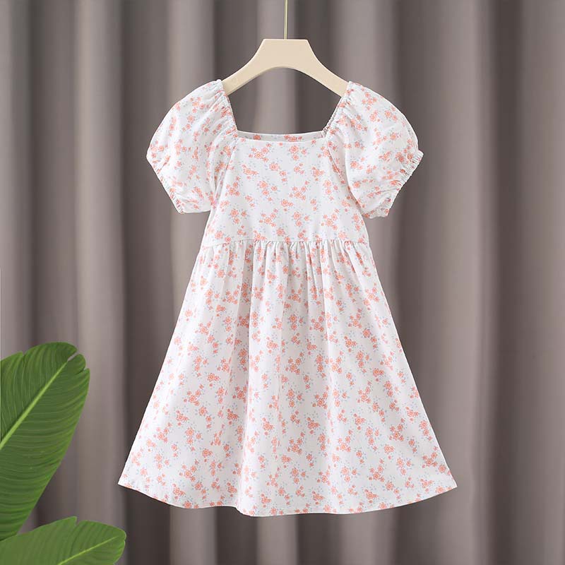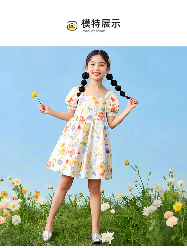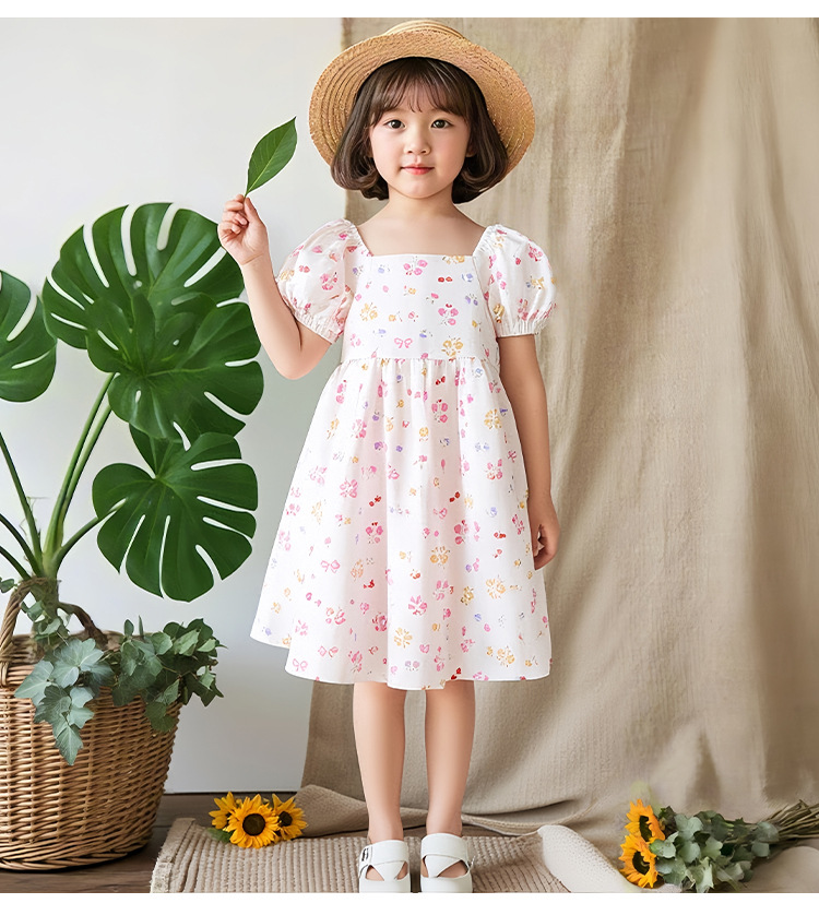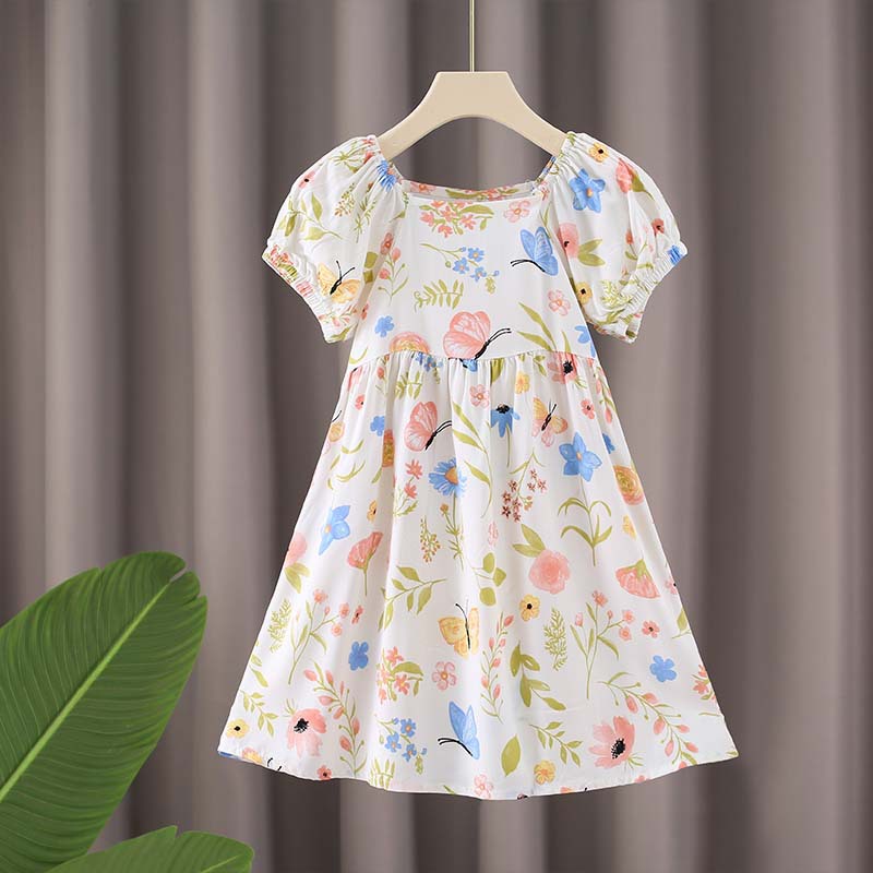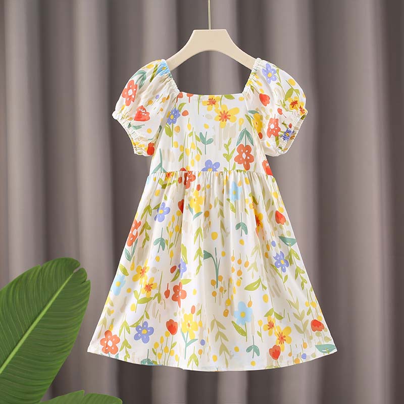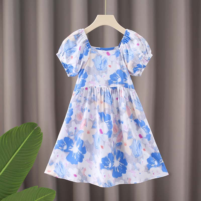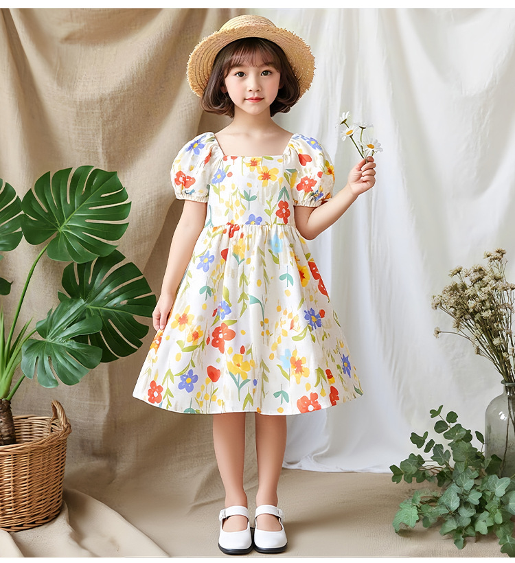 여자 면 실크 퍼프 슬리브 드레스 2025 여름 새로운 얇은 스타일 시원한 느슨한 중대형 어린이 꽃 무늬 스커트 유행스토어 가기