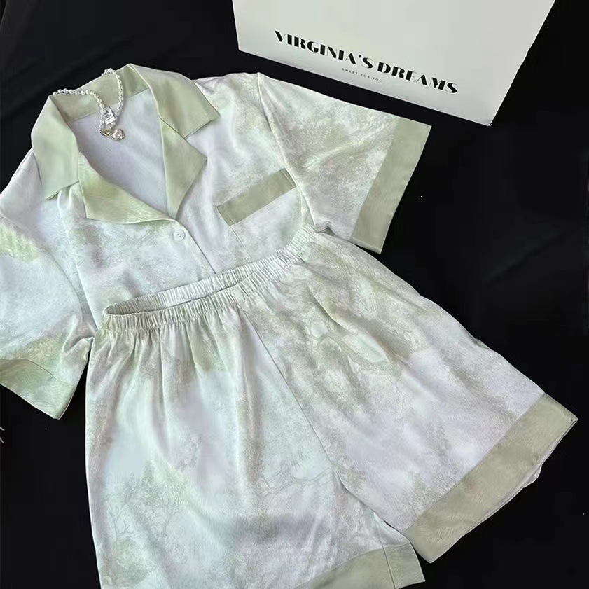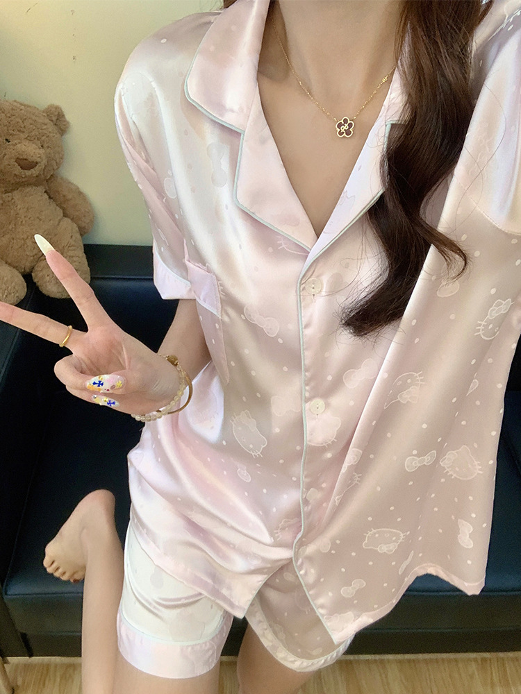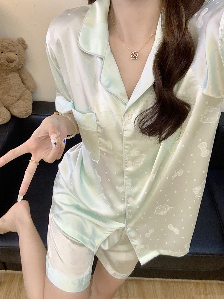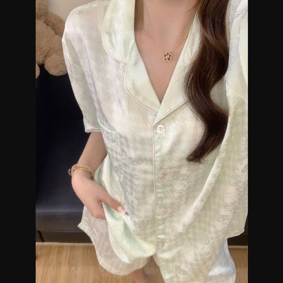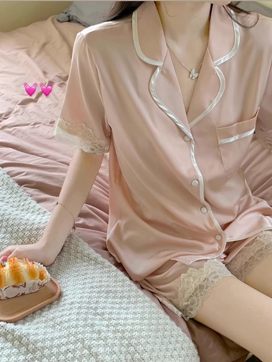 여성용 여름 잠옷 2025년형 아이스 실크 반바지 인스타그램 스타일 반팔 반바지 작은 카라 신상 홈웨어 도매