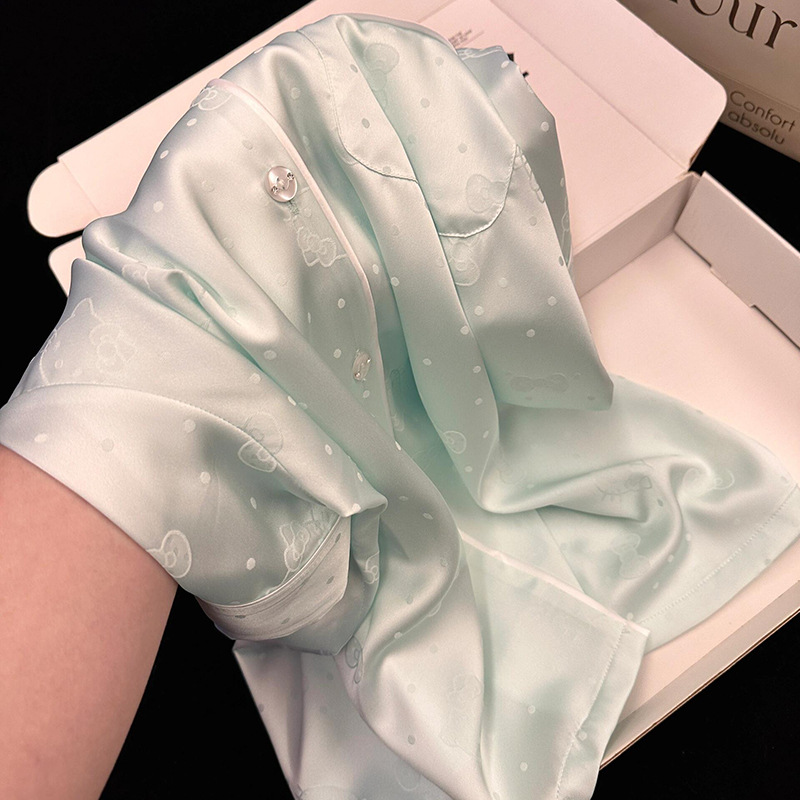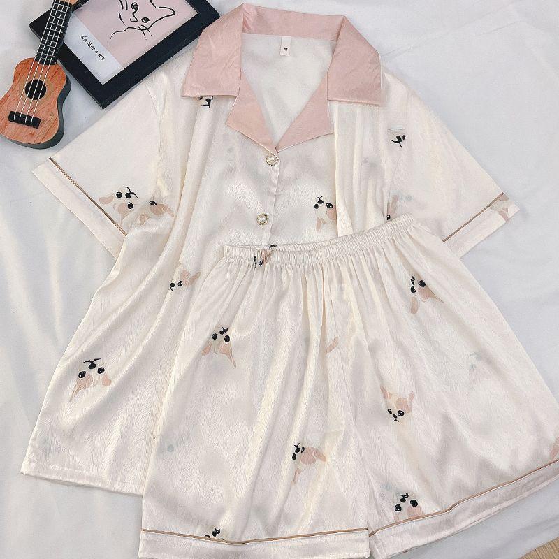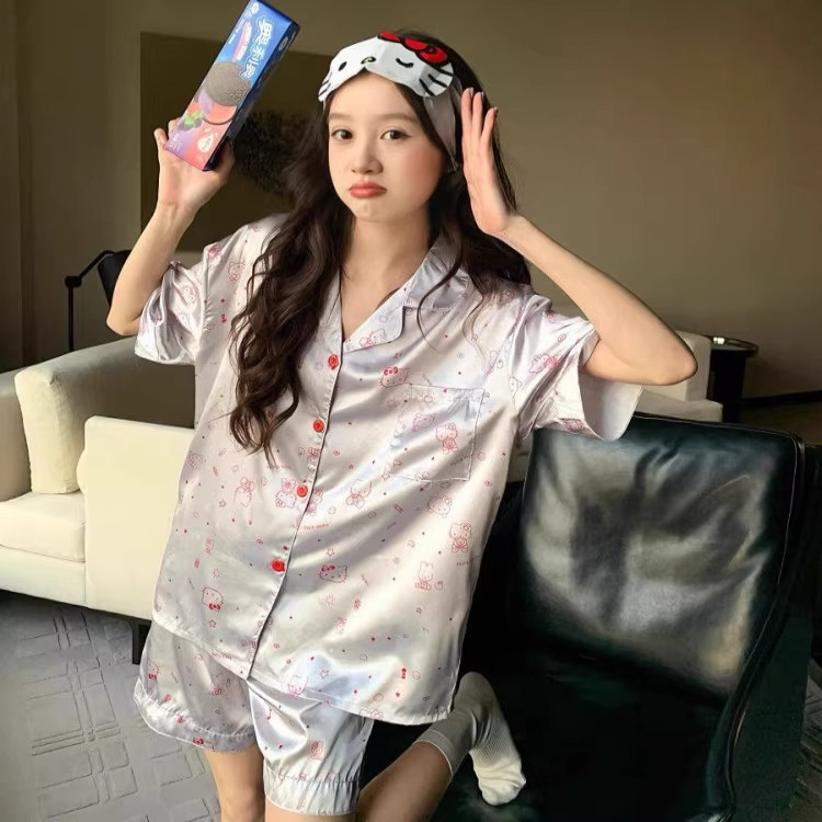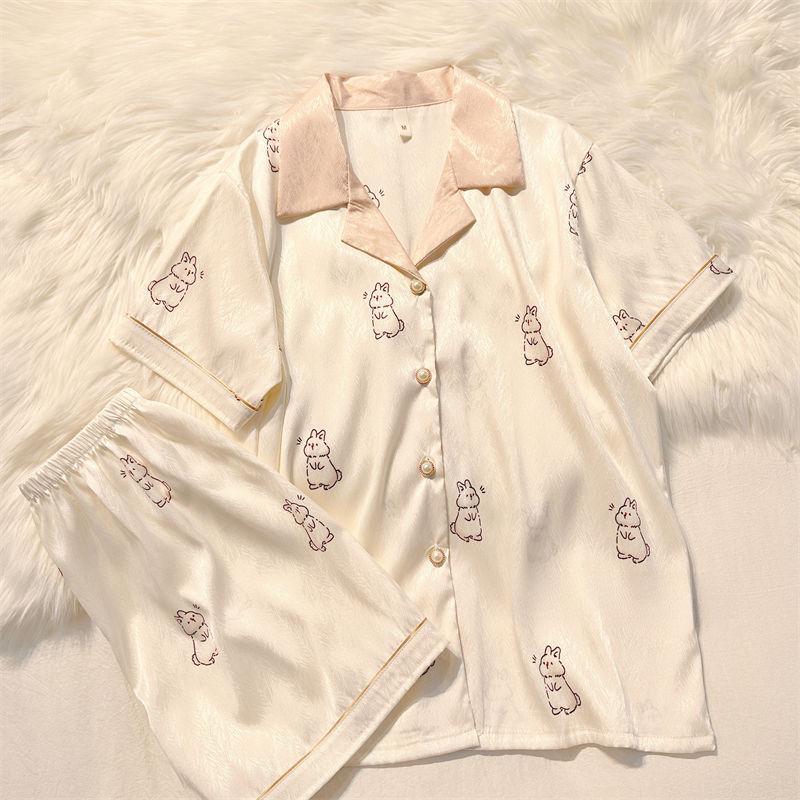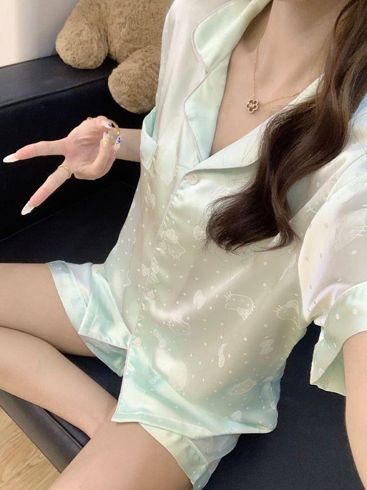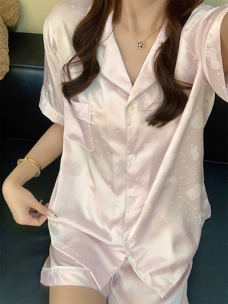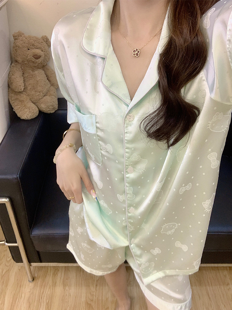 여성용 여름 잠옷 2025년형 아이스 실크 반바지 인스타그램 스타일 반팔 반바지 작은 카라 신상 홈웨어 도매