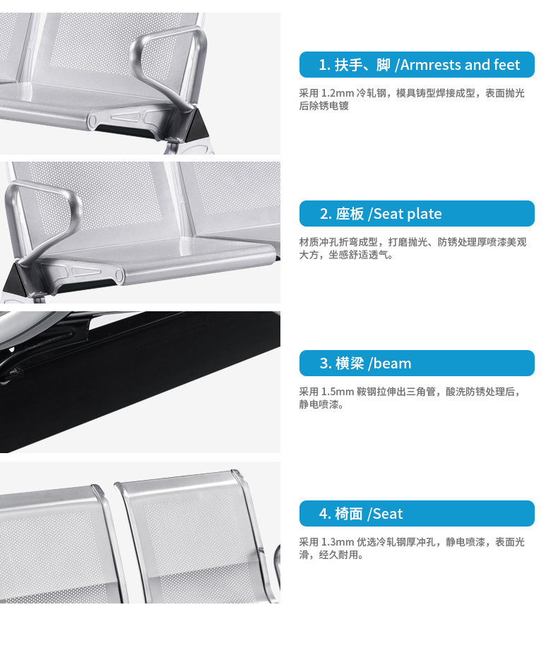연속 의자, 공항 의자, 강화 및 두꺼운 스테인레스 스틸 3인용 병원 긴 의자, 대기 의자, 연속 주입 의자, 대기 의자