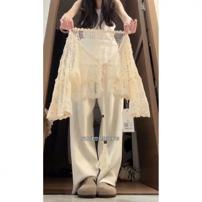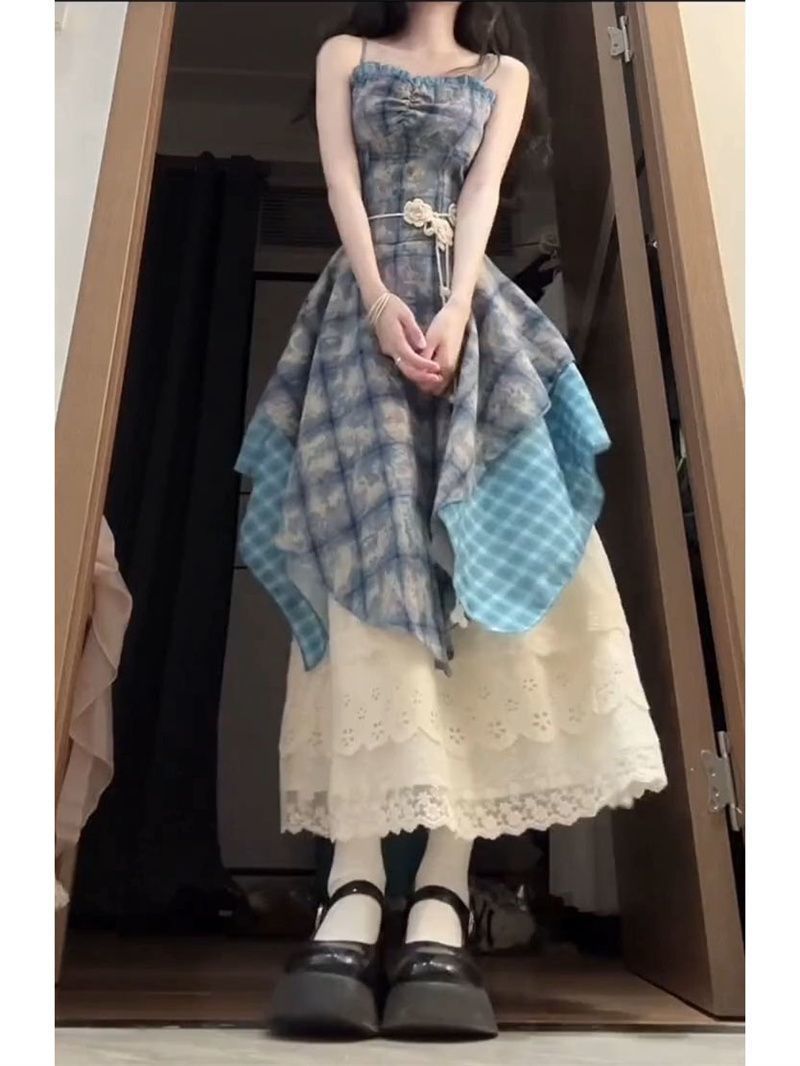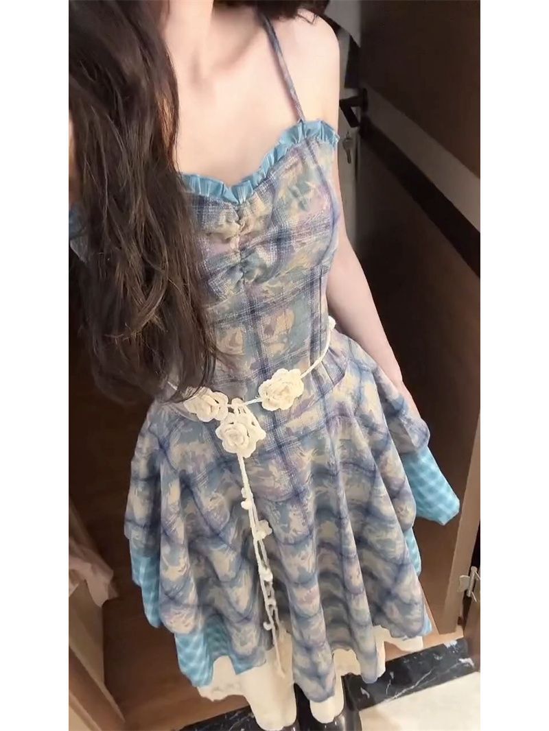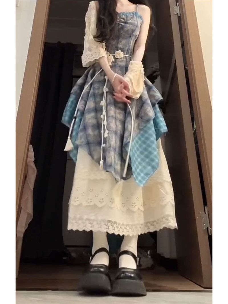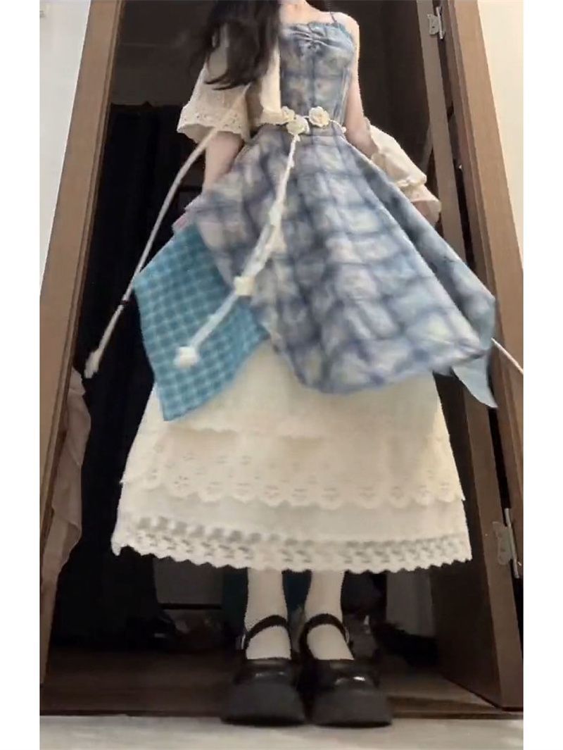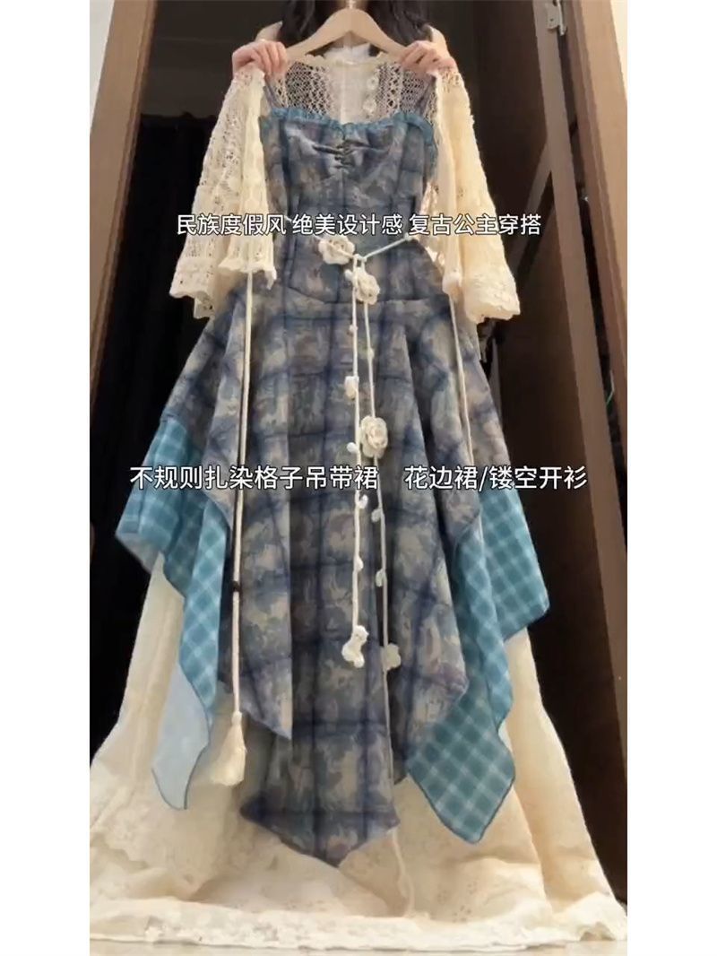 여학생을 위한 프렌치 레트로 불규칙 타이다이 핀치 웨이스트 체크 무늬 서스펜더 스커트 + 중공 자외선 차단 카디건 투피스 슈트스토어 가기