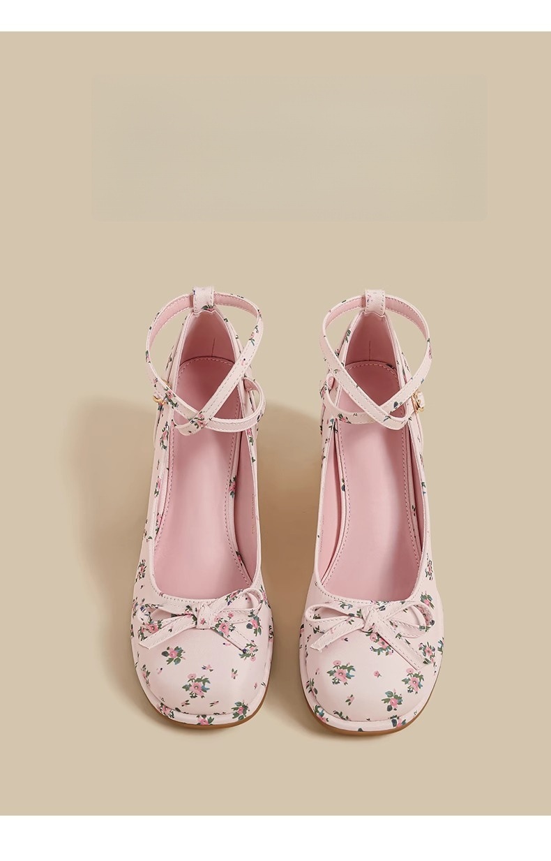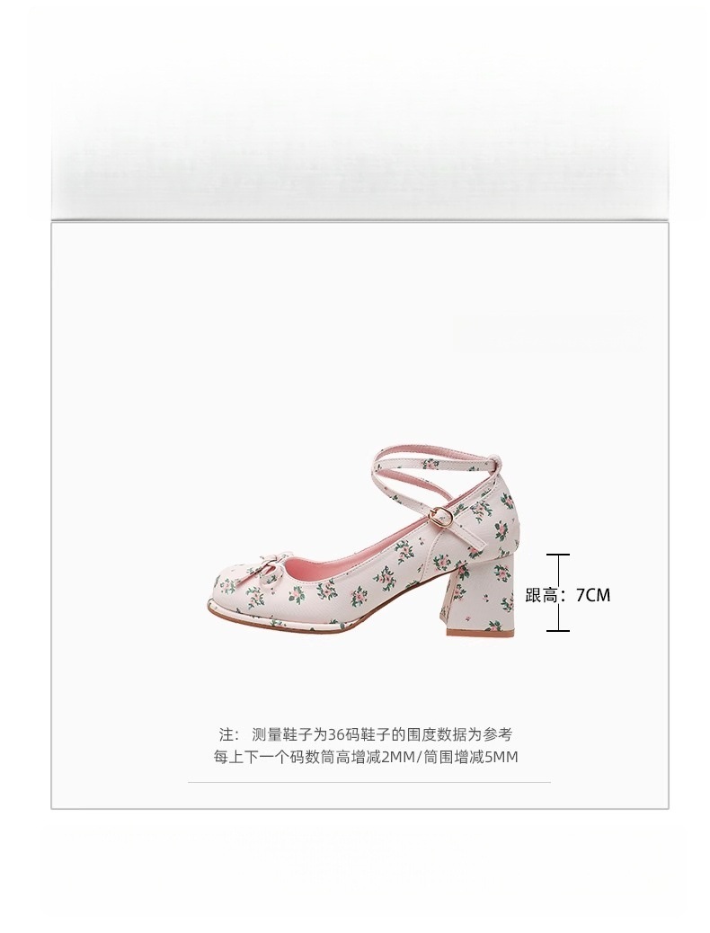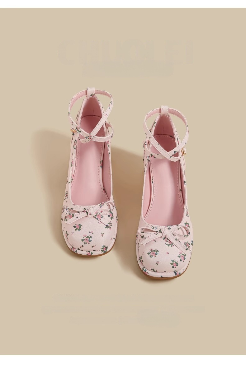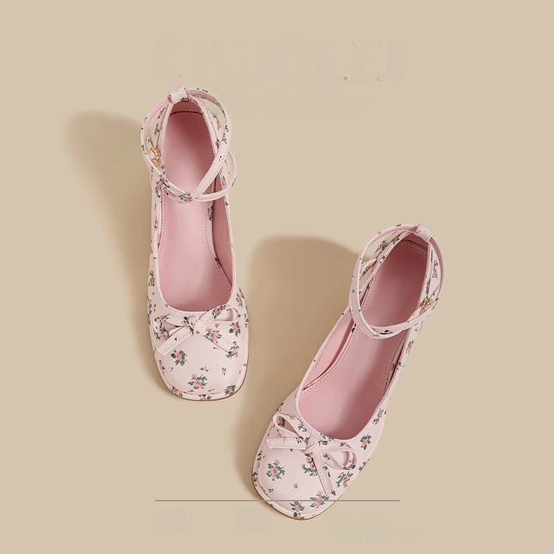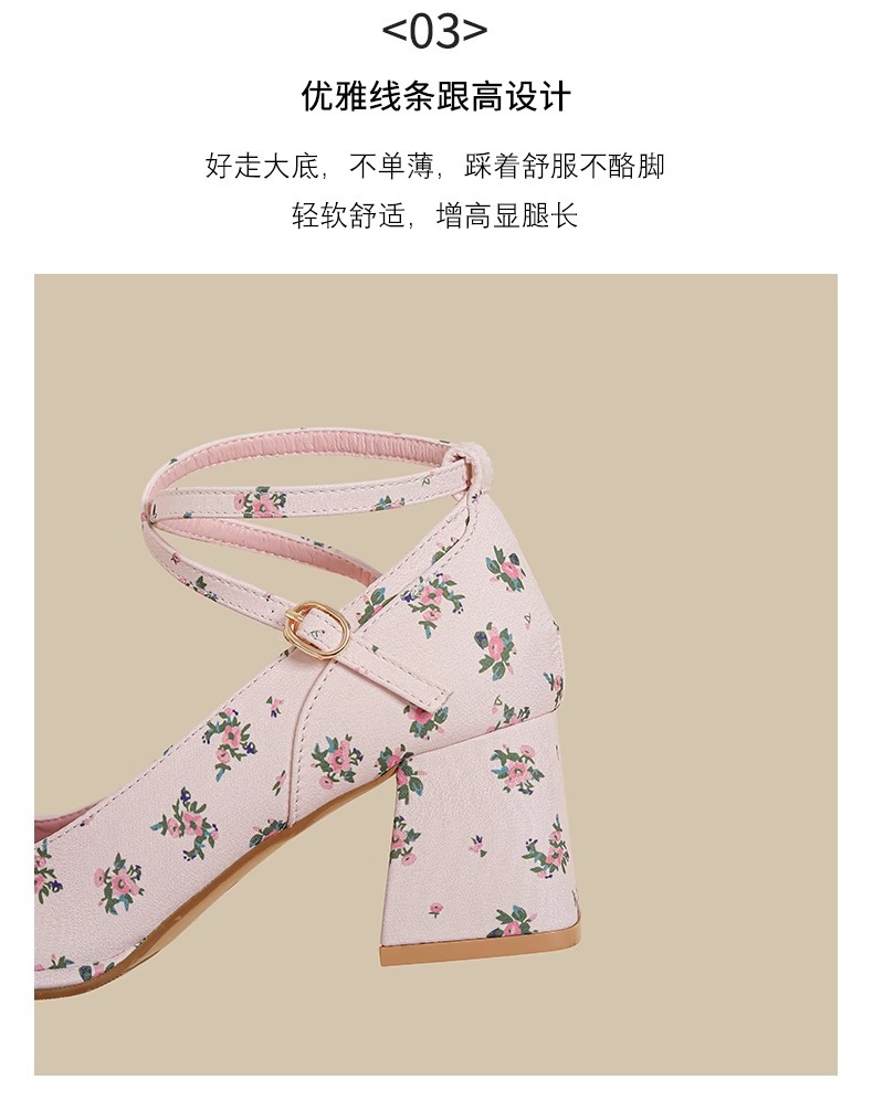 2025년 여름 신상 여성용 프렌치 스타일 펌프스 슈즈, 두꺼운 굽, 크로스 스트랩, 핑크 메리 제인 꽃무늬 작은 가죽 신발스토어 가기