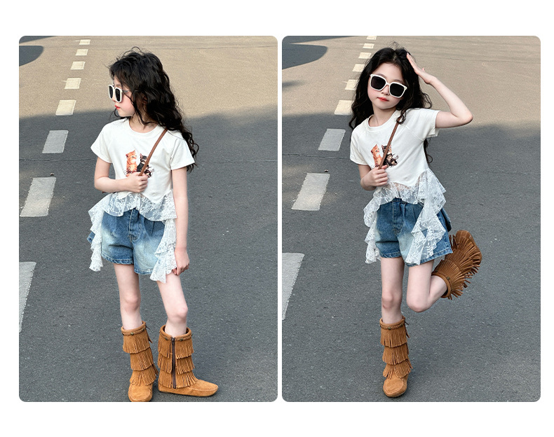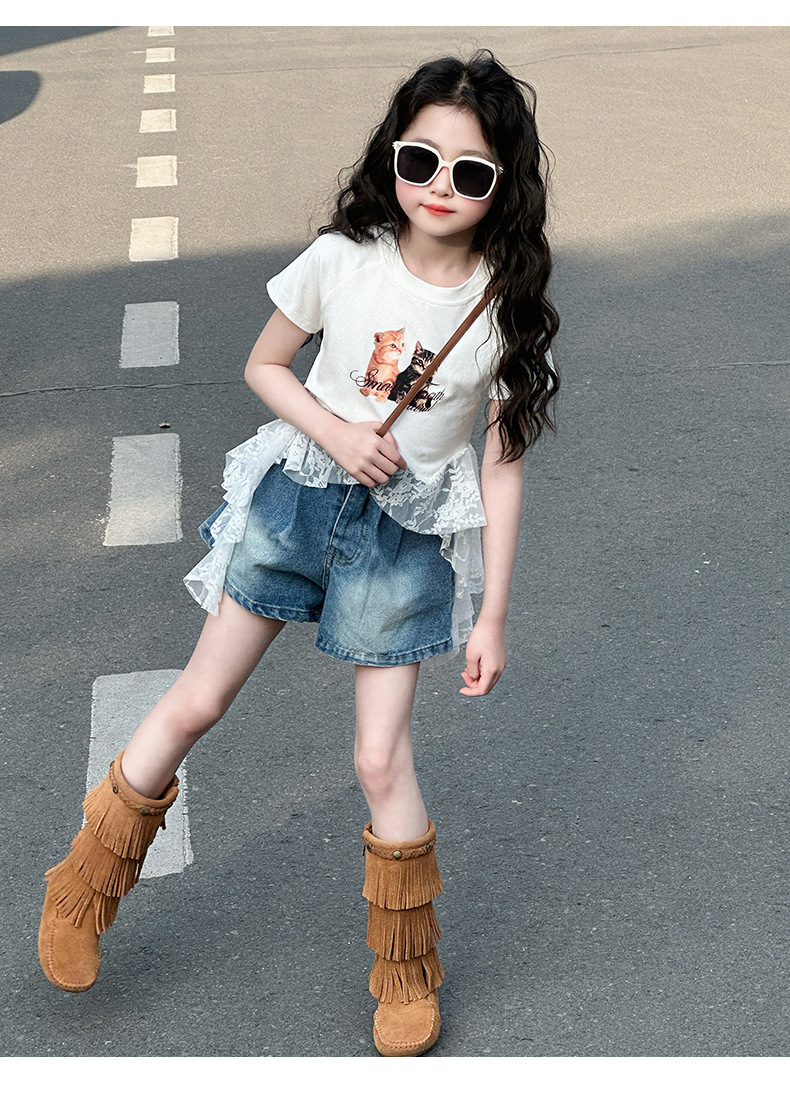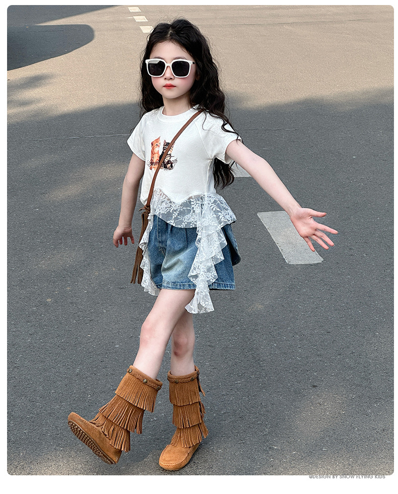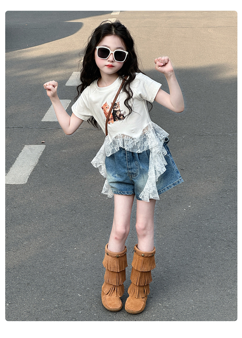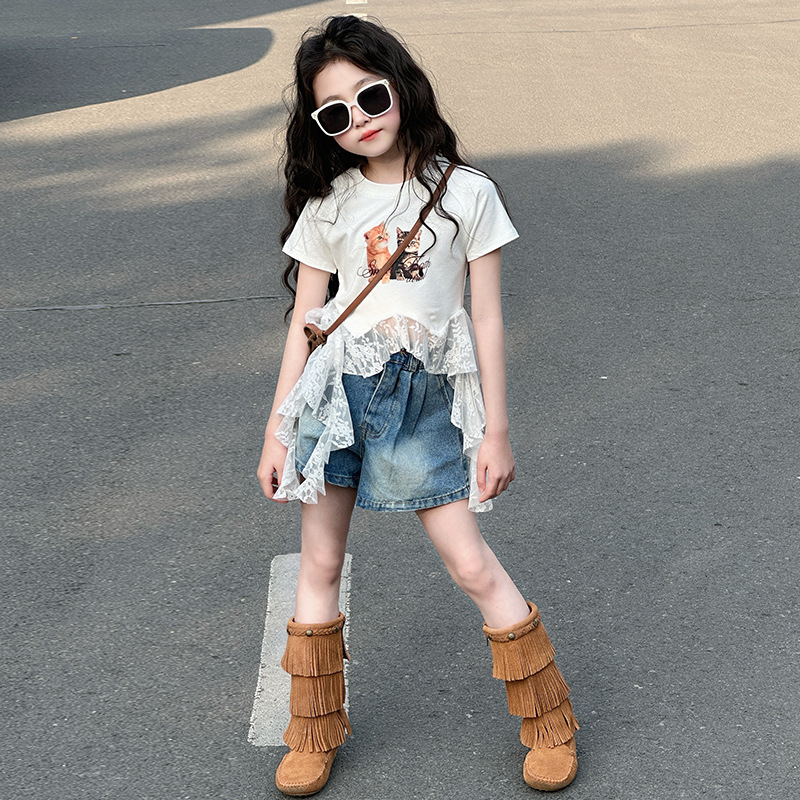 여아 여름 반팔 티셔츠 2025 새로운 스타일 아동 패션 레이스 스플라이싱 탑 중소형 아동용 하의 셔츠스토어 가기