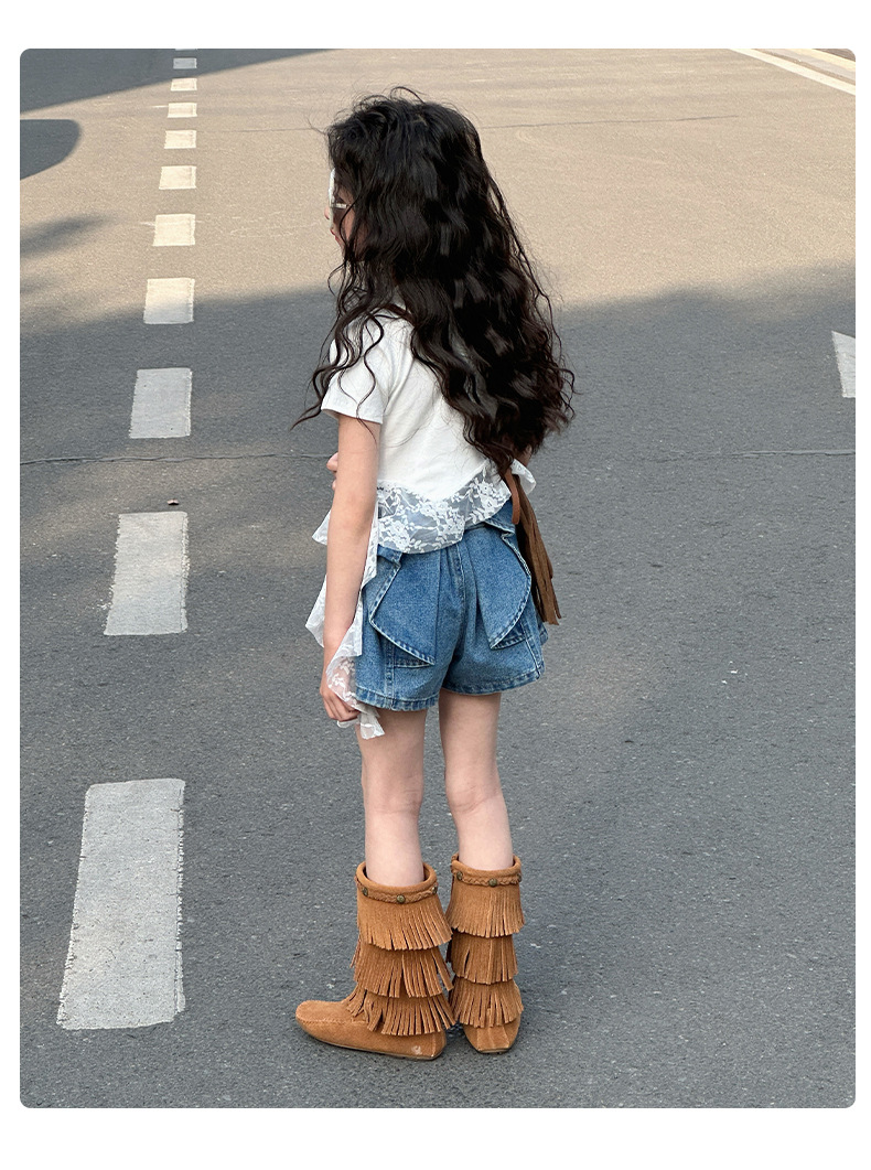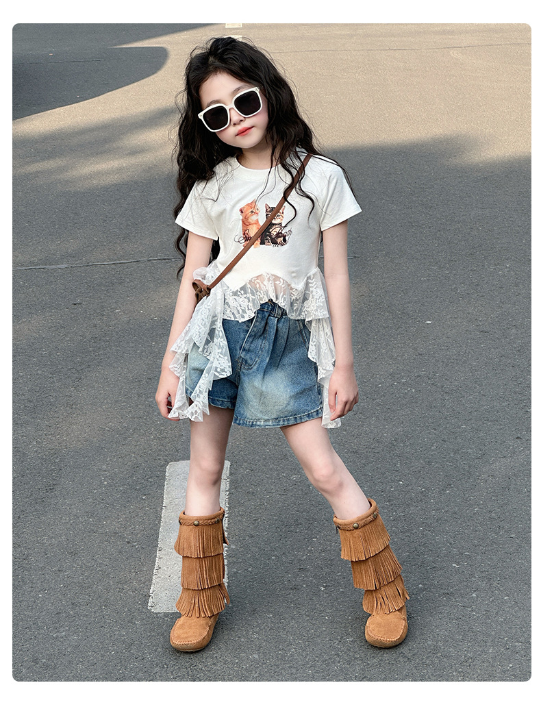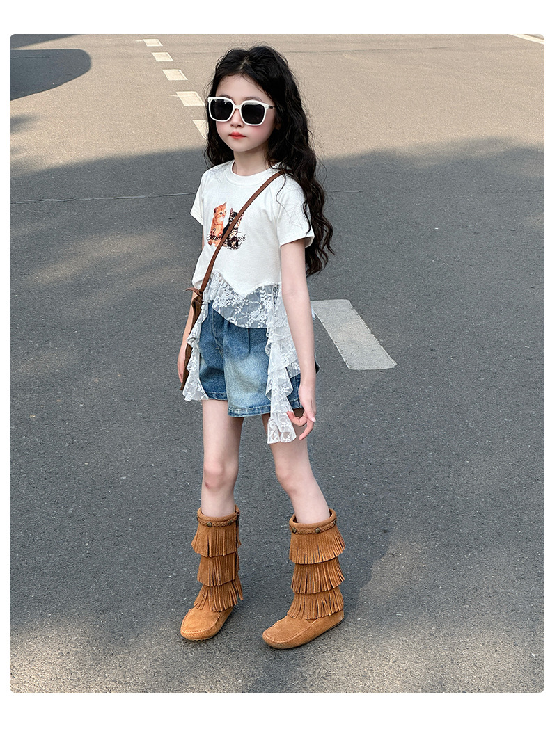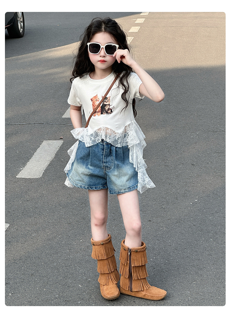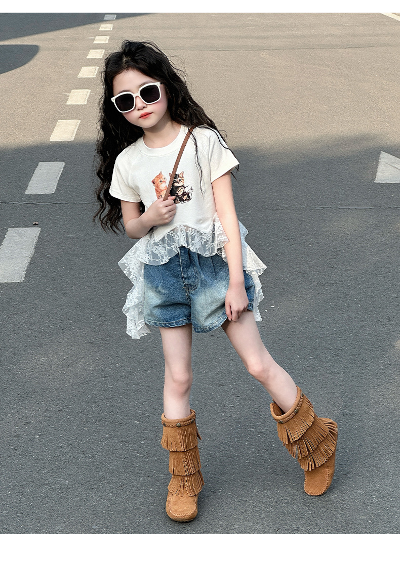 여아 여름 반팔 티셔츠 2025 새로운 스타일 아동 패션 레이스 스플라이싱 탑 중소형 아동용 하의 셔츠스토어 가기