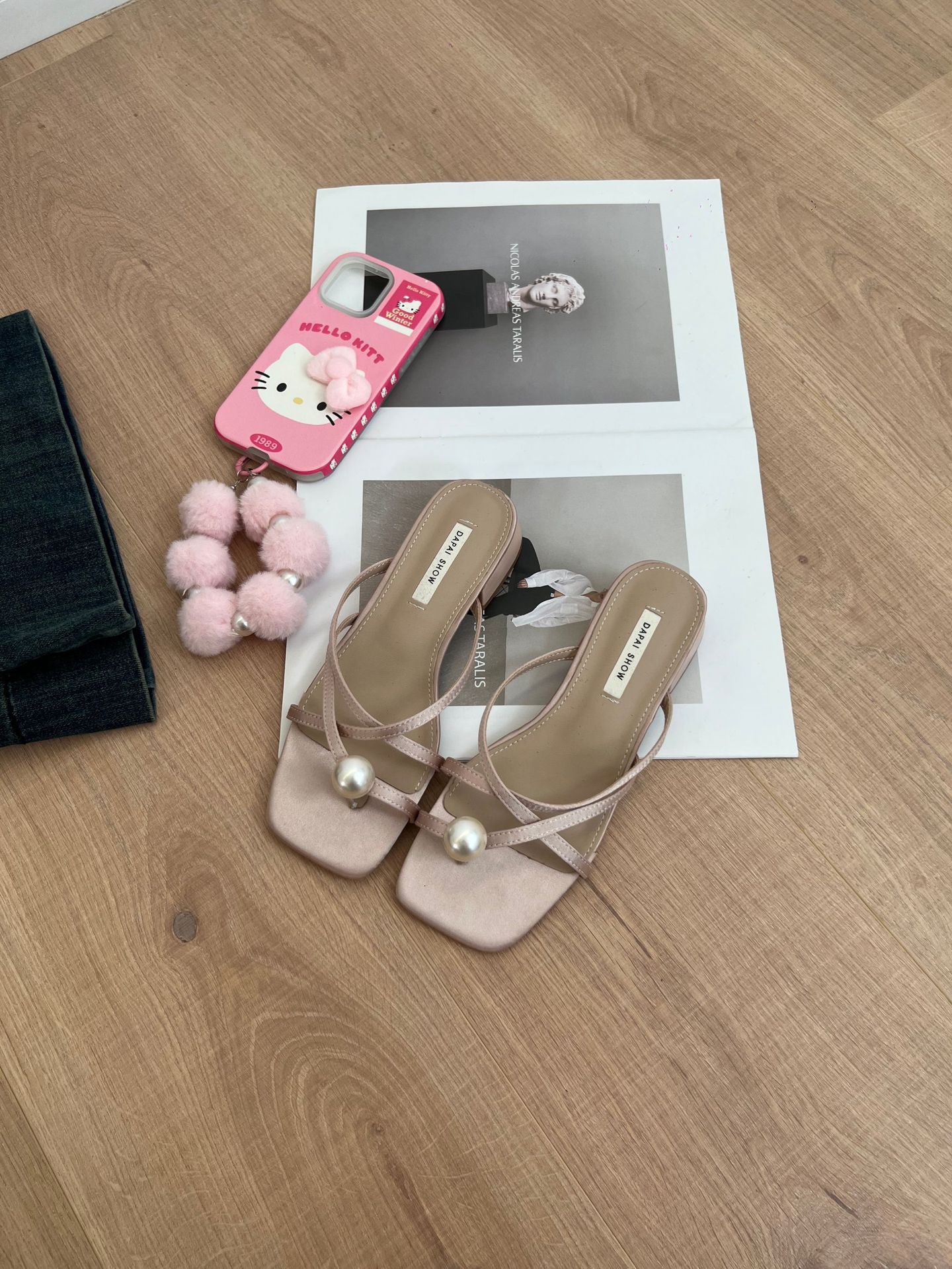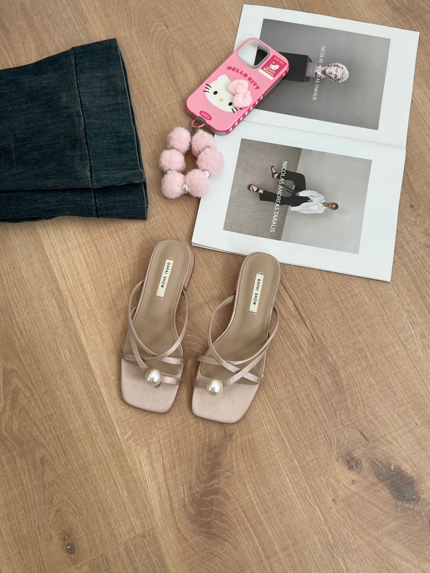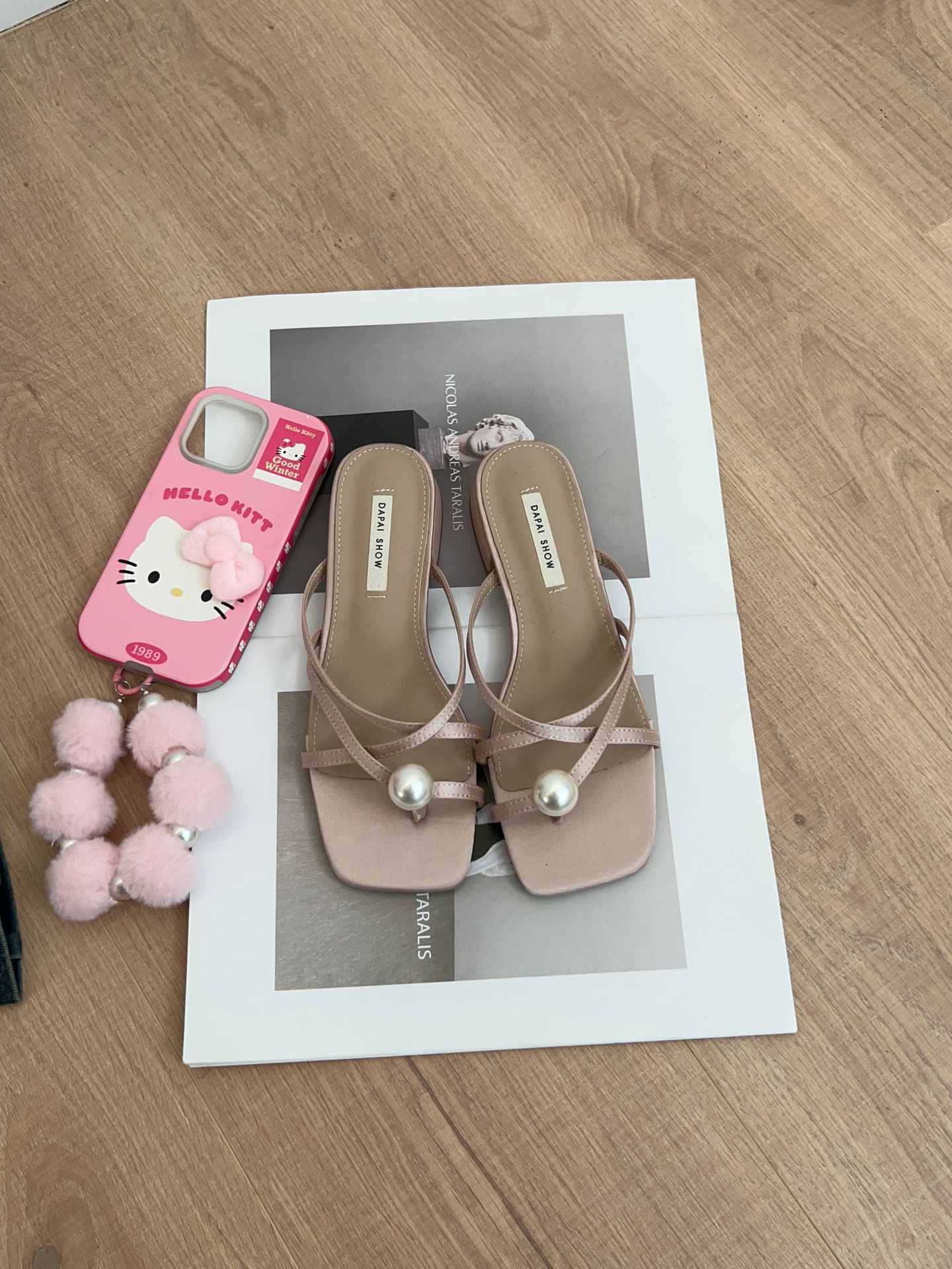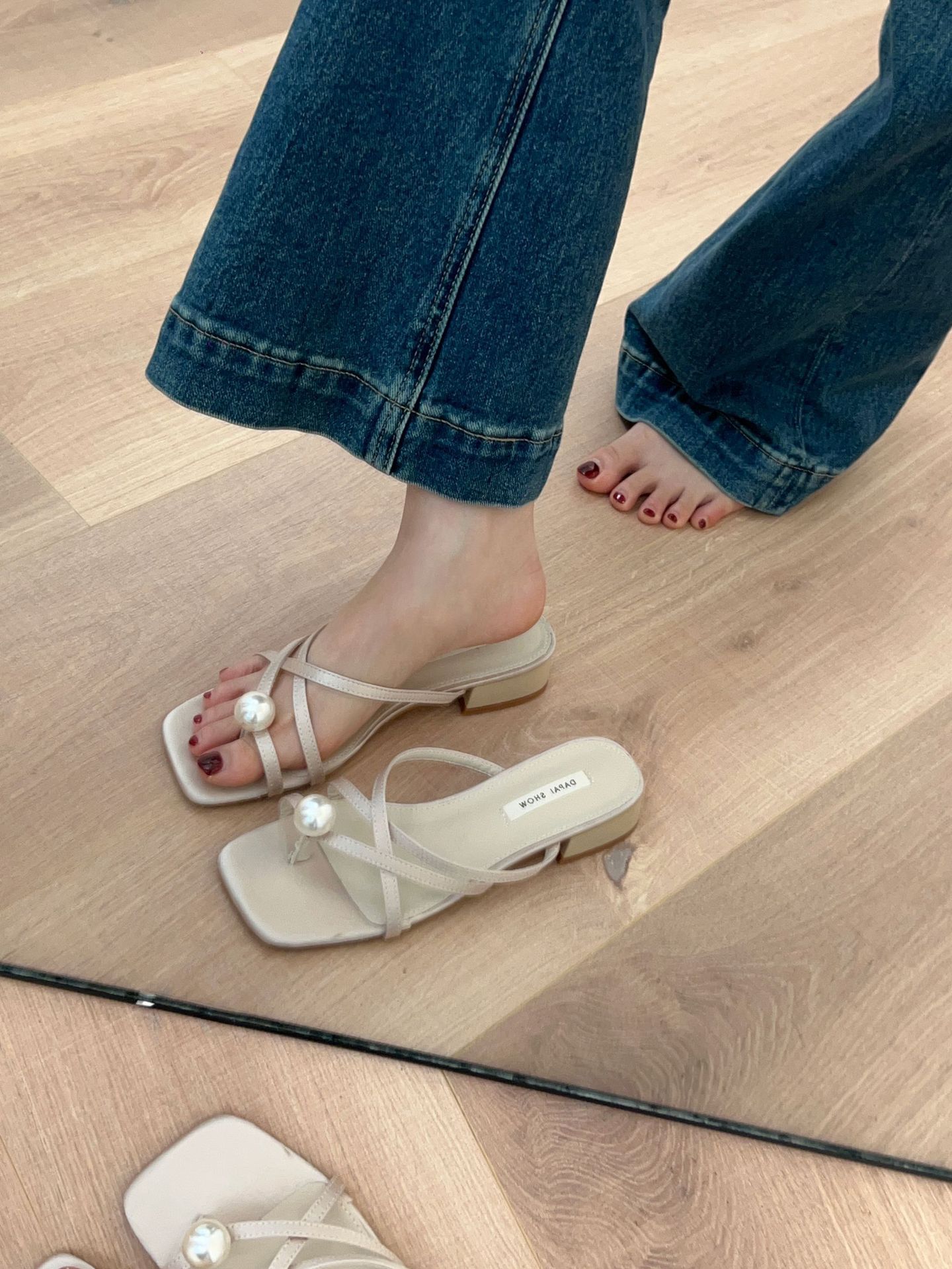 프렌치 이브닝 스타일 스커트, 슬리퍼, 오픈토 스퀘어토 하이힐 샌들, 여름 아우터용 진주 요정 슈즈스토어 가기