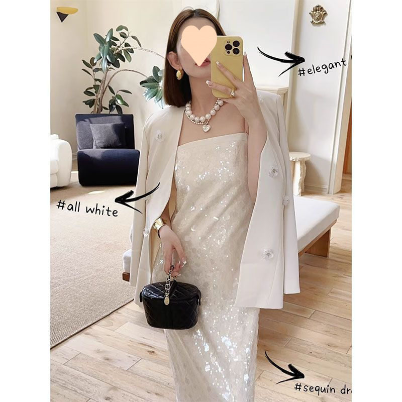 프렌치 니치 서스펜더 스팽글 드레스 슈트 드레스 고급 질감 파티 기질 생일 파티 미디 스커트
