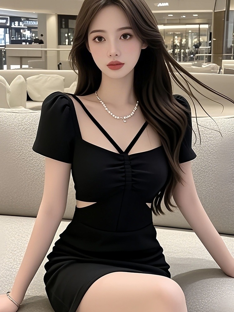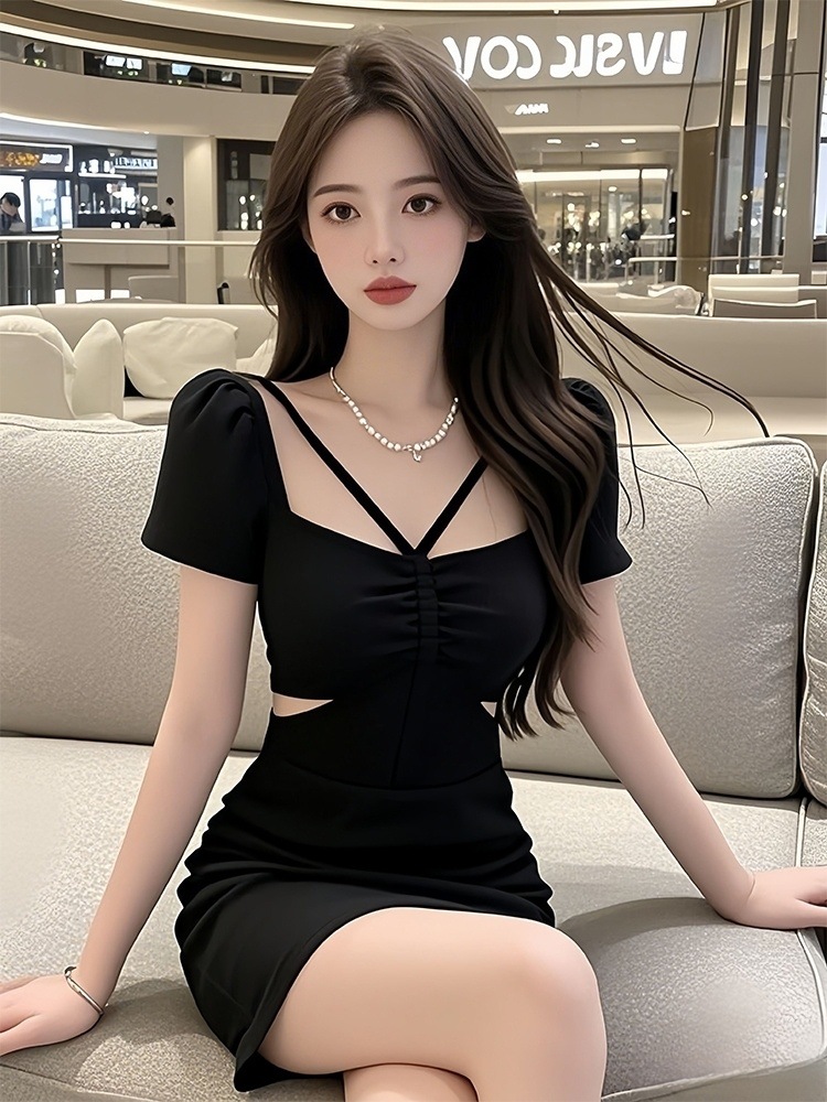 黑色方领包臀连衣裙女2025新款今年流行爆款春夏独特性感露腰裙子