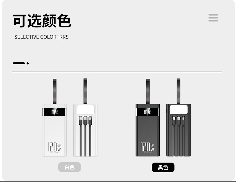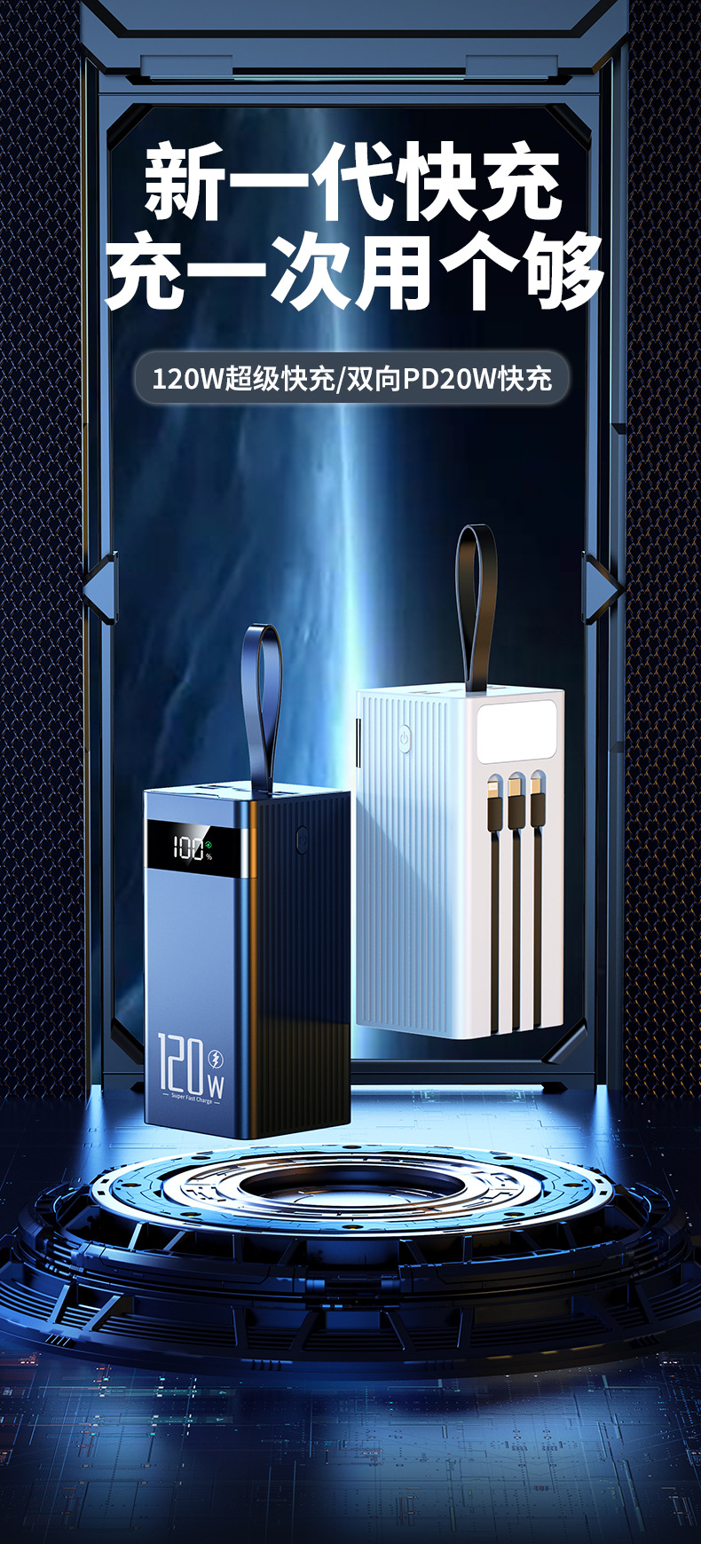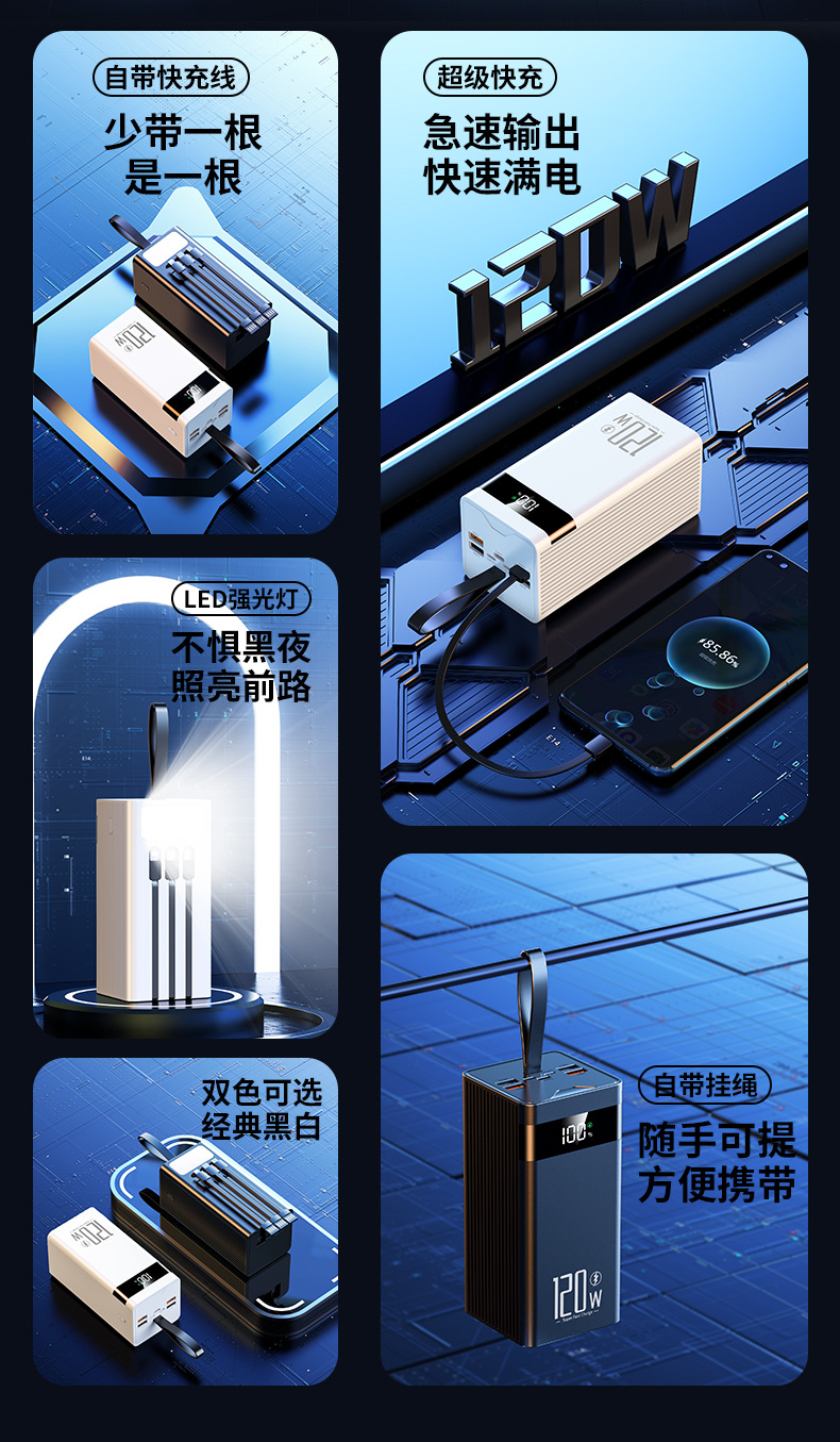 120W 초고속 충전 50000mAh 보조베터리 초대용량 케이블 조명 포함 야외 모바일 전원 공급 장치스토어 가기