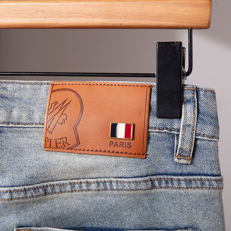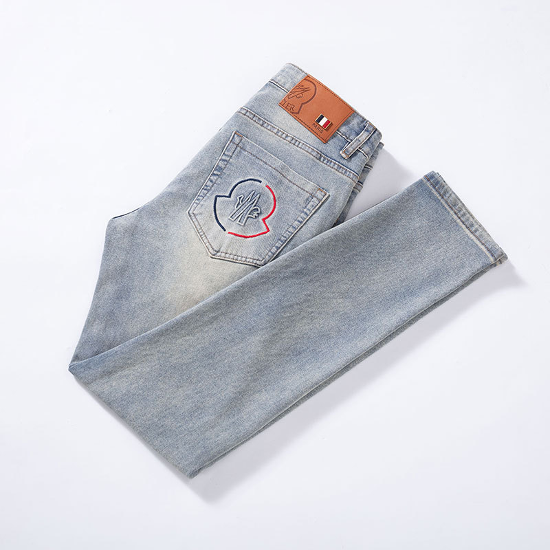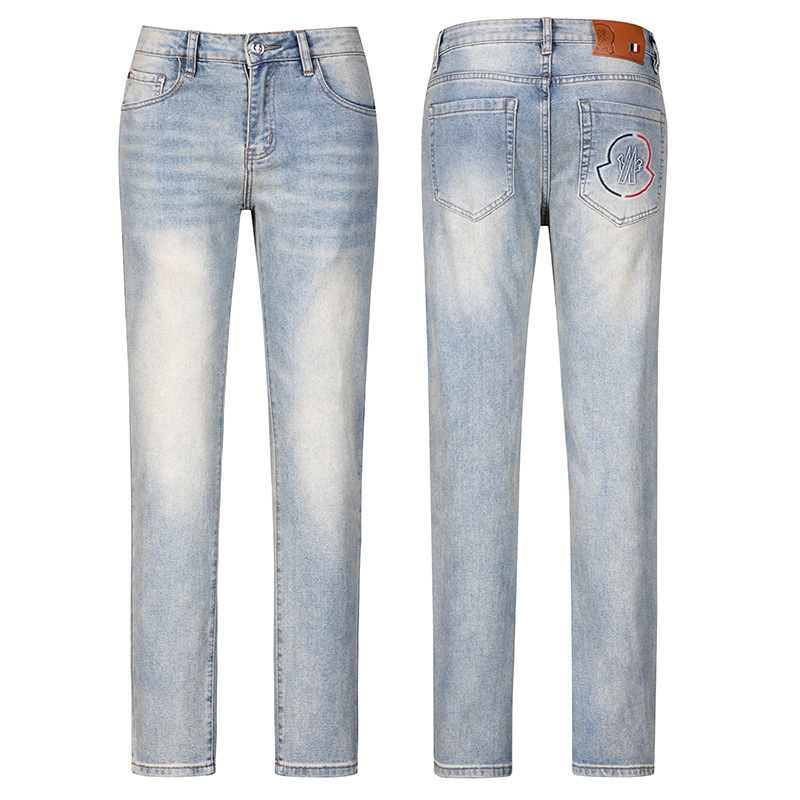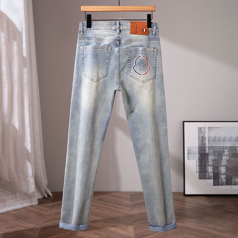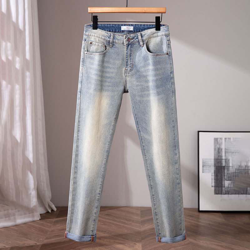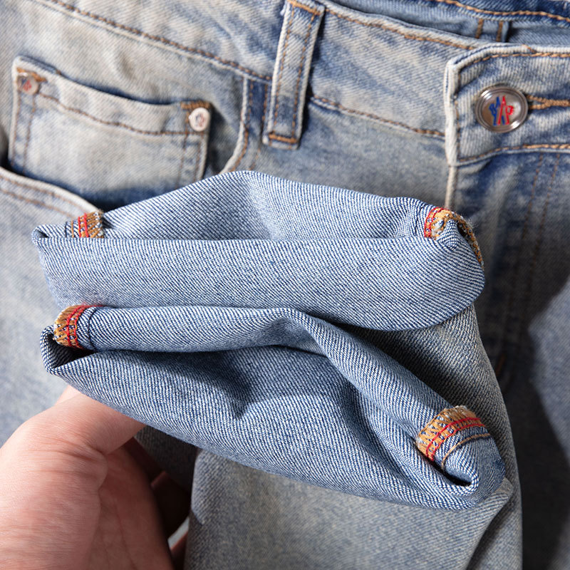 광저우 신탕 청바지 남성 한국 스타일 슬림핏 작은 발 크로스보더 대외 무역 유럽 제품 스트레치 프린트 라이트 블루 1:1 바지스토어 가기