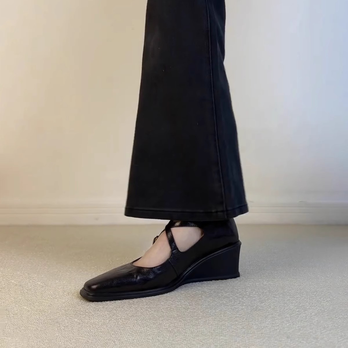 재고 있음 ~ 여성용 웨지 힐 더블 브레스트 펌프스 슈즈, 복고풍 스타일의 스퀘어 토 캐주얼 소형 가죽 슈즈, 키가 큰 메리 제인 슈즈