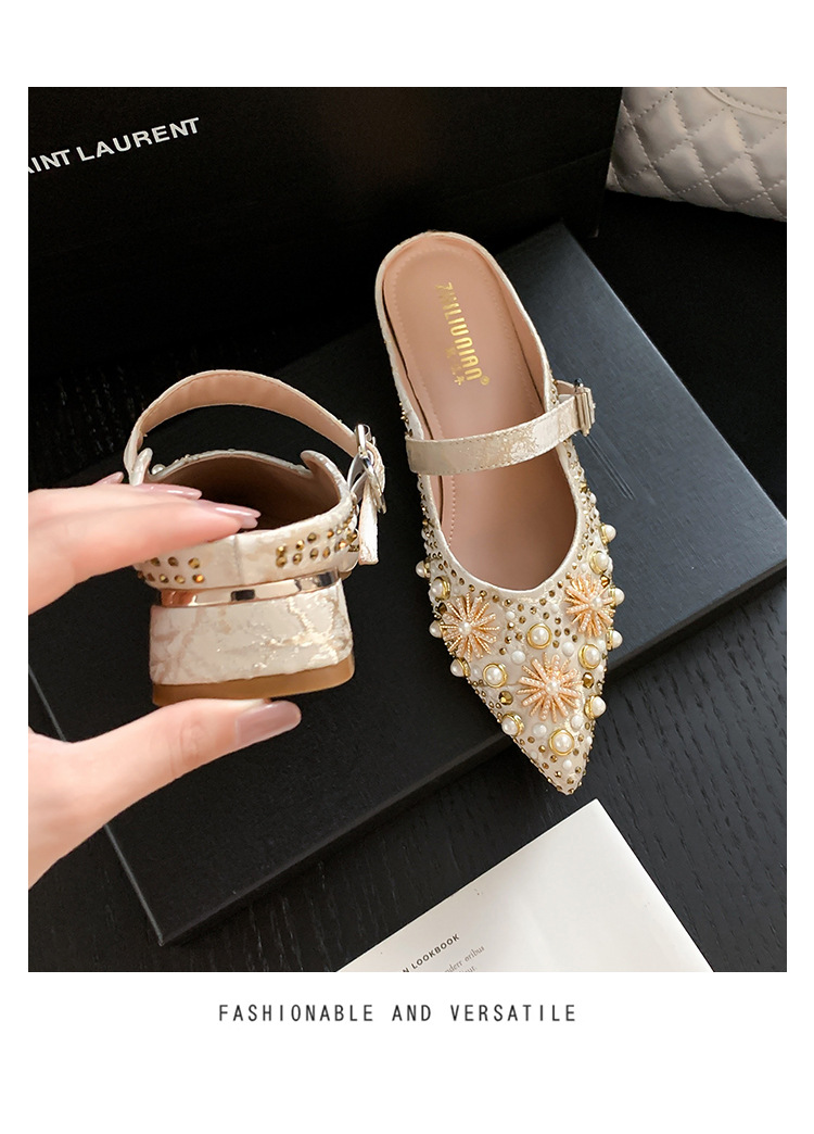 666-T4 중국 스타일 2025 여름 신작 뾰족한 신발 두꺼운 굽 중간 굽 라인스톤 여성 신발 패션 바오터우 하프 슬리퍼