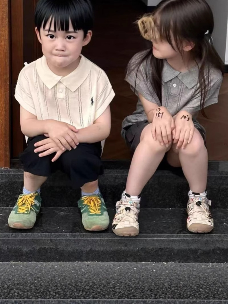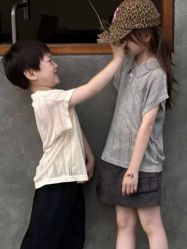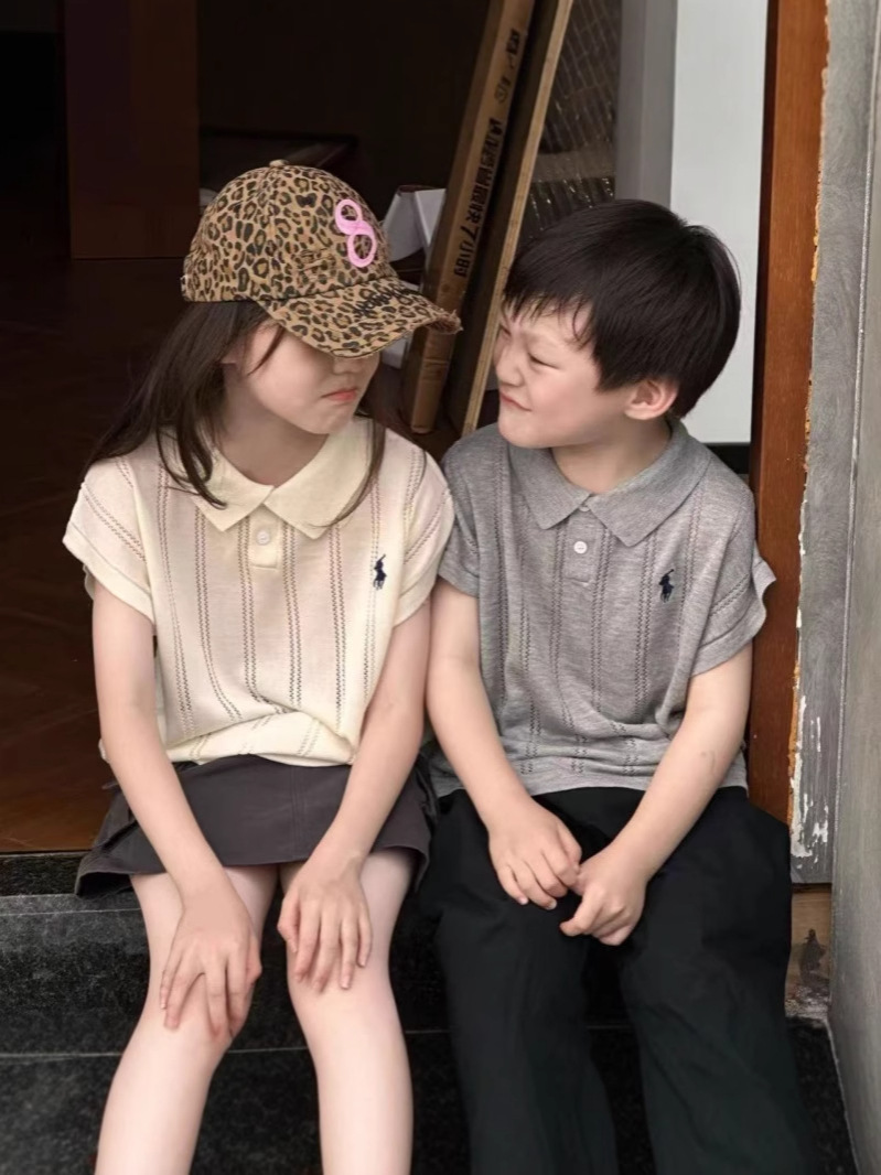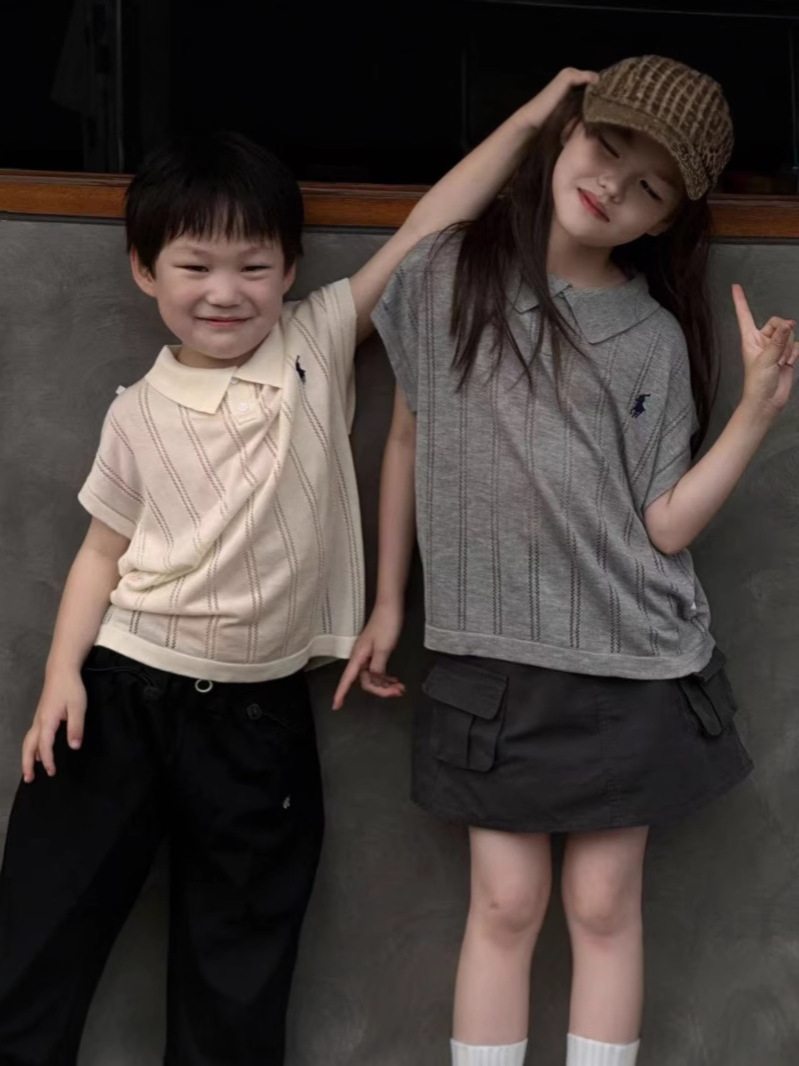 여름 신작 아동복 복고풍 폴로 칼라 자수 스웨터 비행기 소매 반팔 슬림 탑
