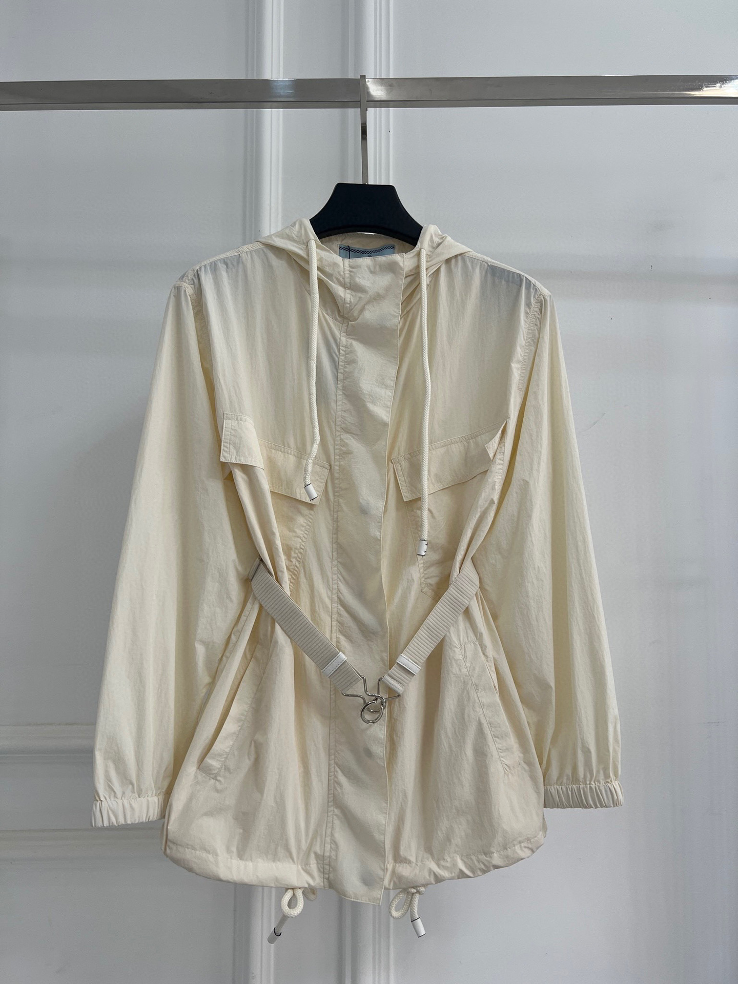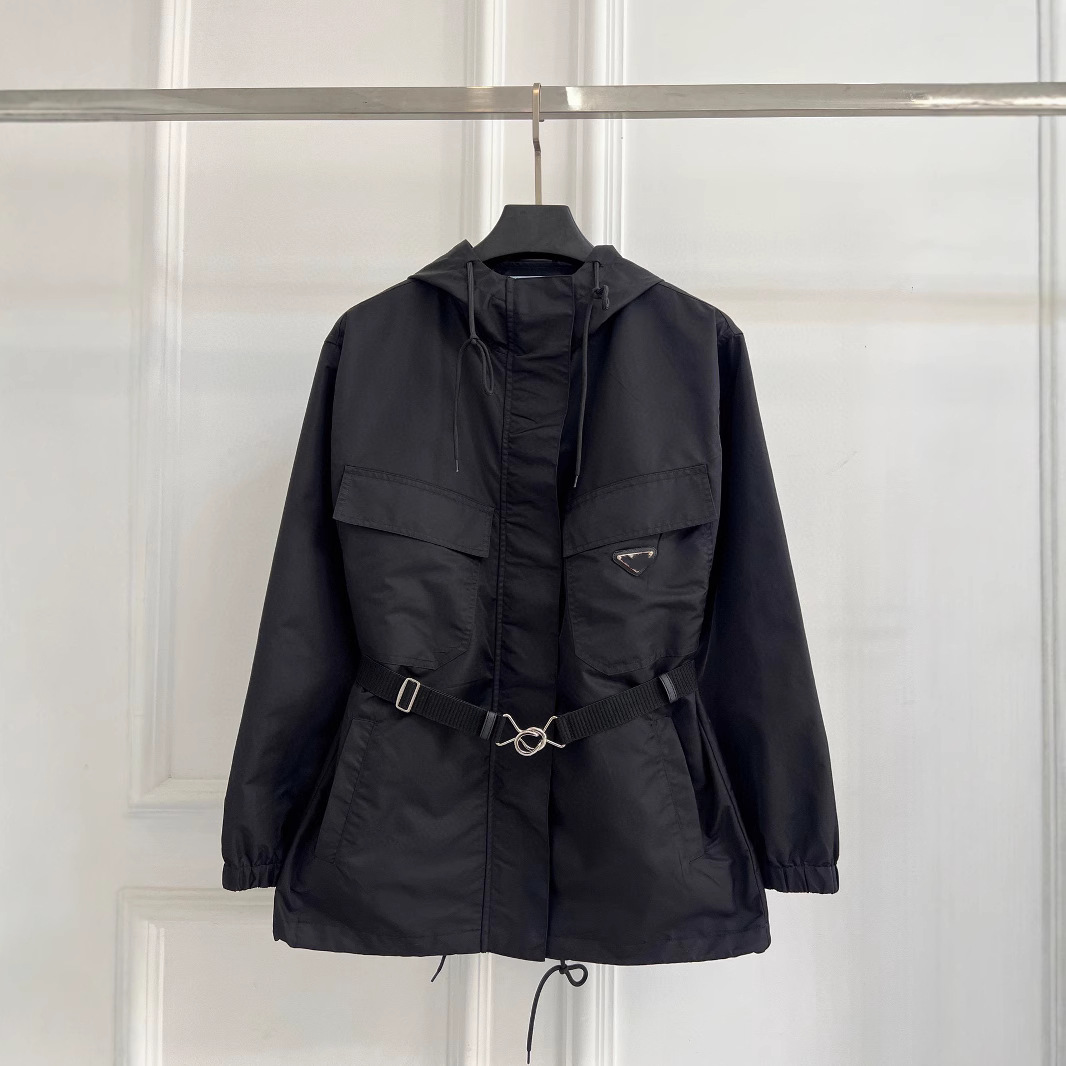 봄 신작 삼각형 메탈 중간 길이 대형 포켓 허리 후드 윈드 브레이커 코트 여성용 재킷 탑