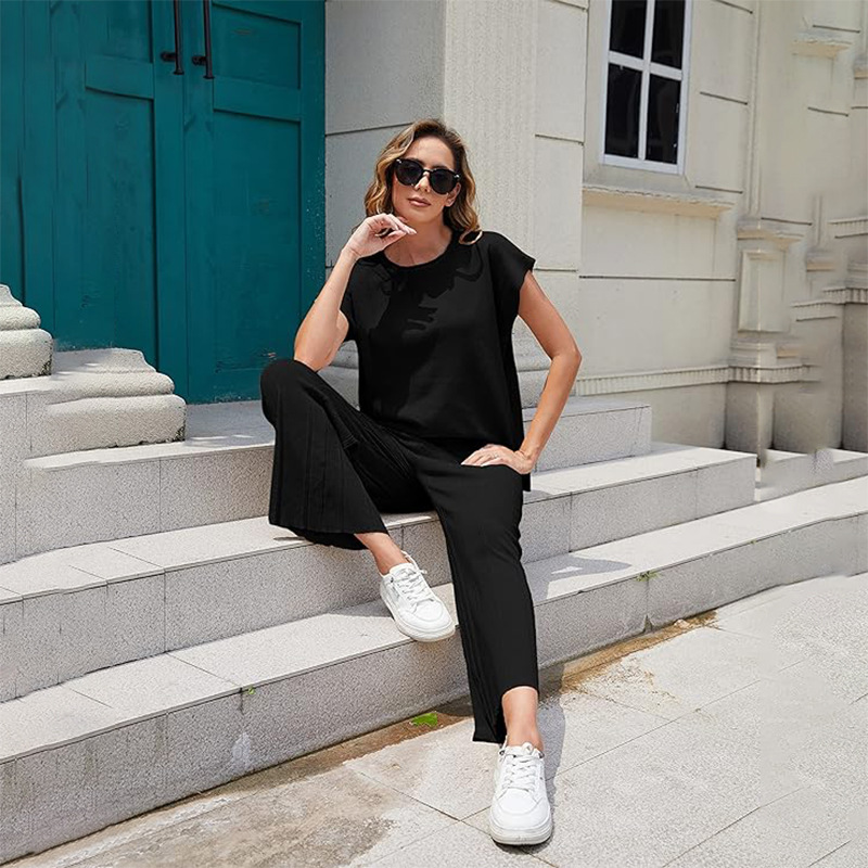 유럽과 미국의 국경 간 숙녀 2 피스 캐주얼 니트 와이드 레그 팬츠 세트 해변 휴가 Amazon 의류스토어 가기