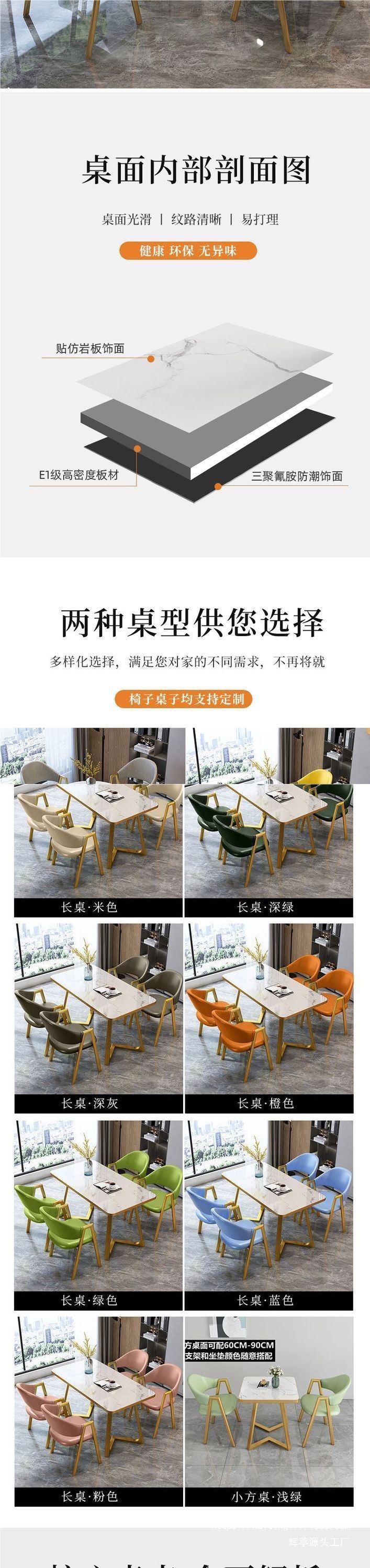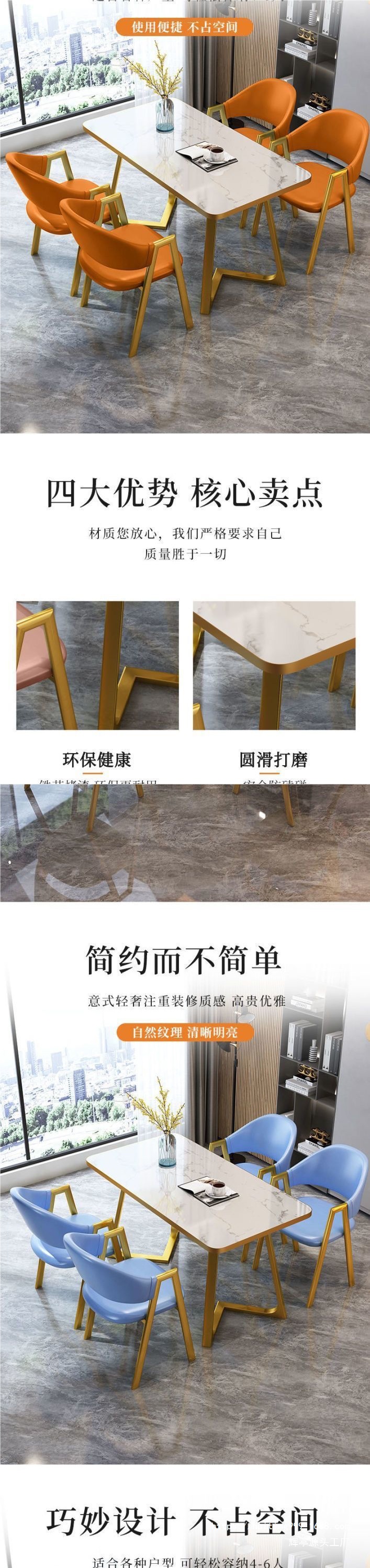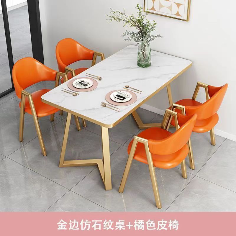 • 골드 엣지 모조석 패턴 + 오렌지색 가죽 의자 4개