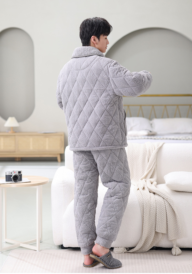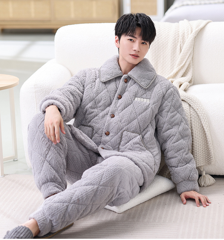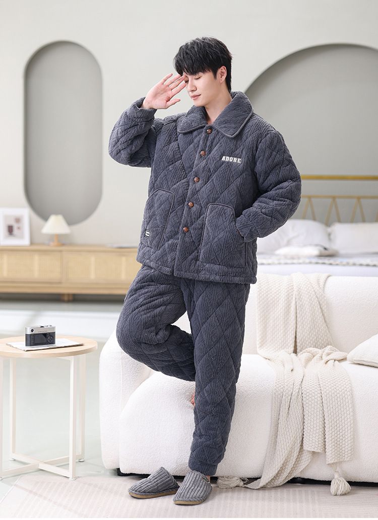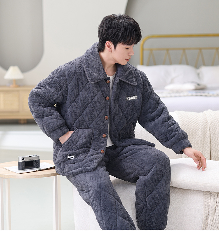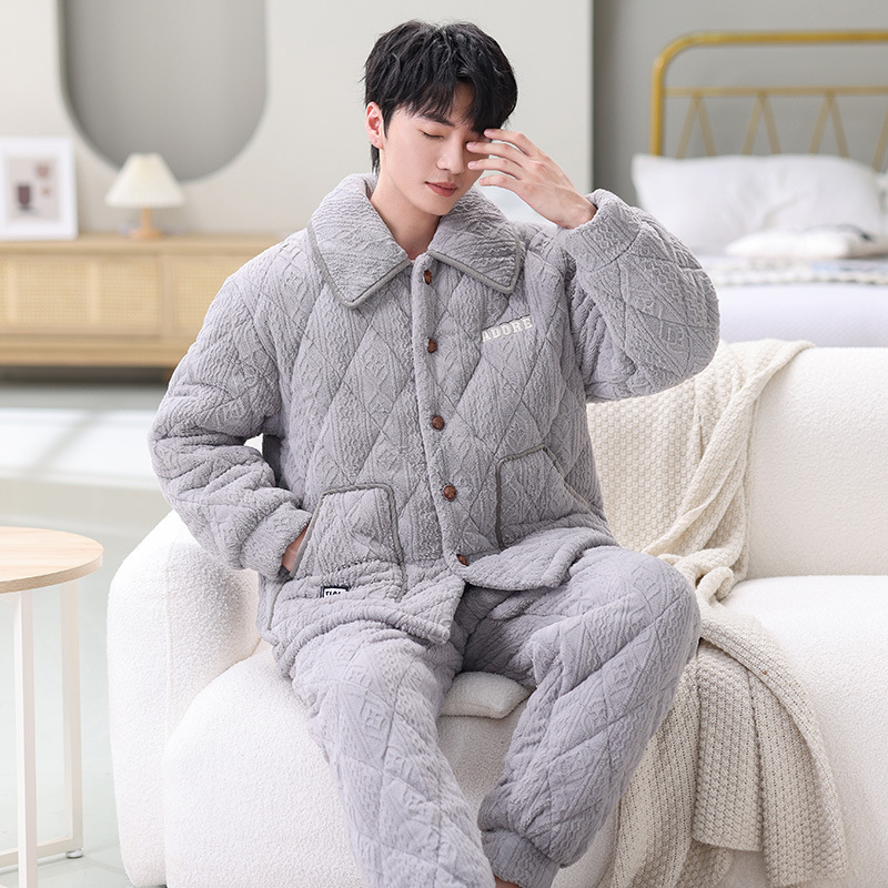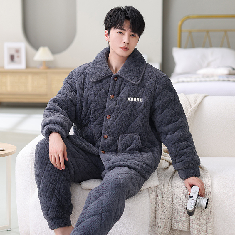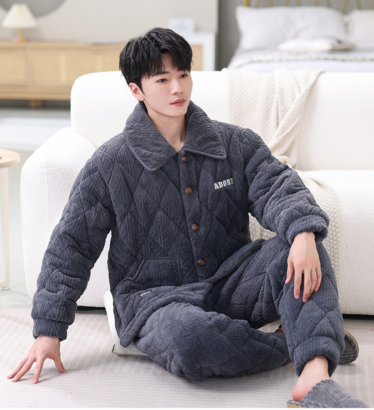남성용 대형 3겹 누비 두꺼운 따뜻한 잠옷, 벨벳 가정복, 긴 소매, 외부 착용 가능, 드롭 배송스토어 가기