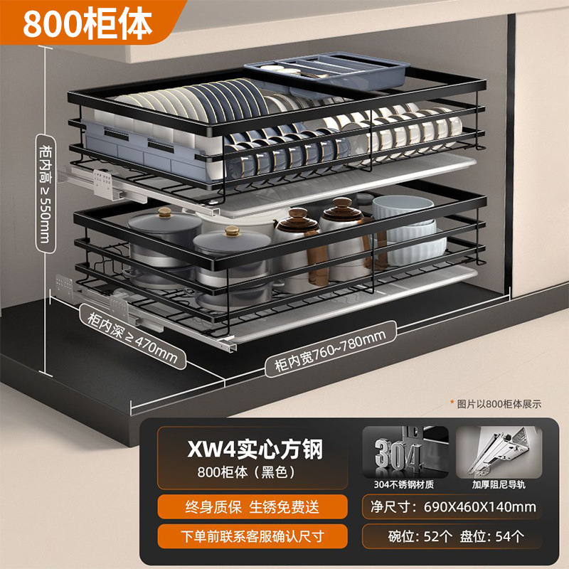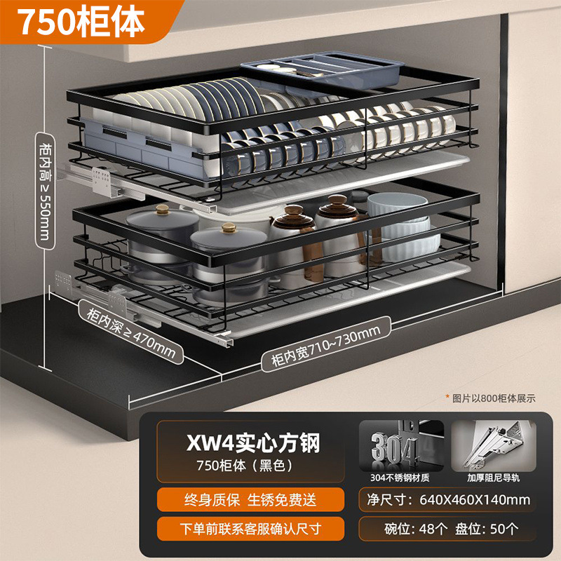 • 피아노 블랙 SUS304 스테인레스 스틸-47cm 깊이-720 캐비닛 더블 레이어 접시 바구니