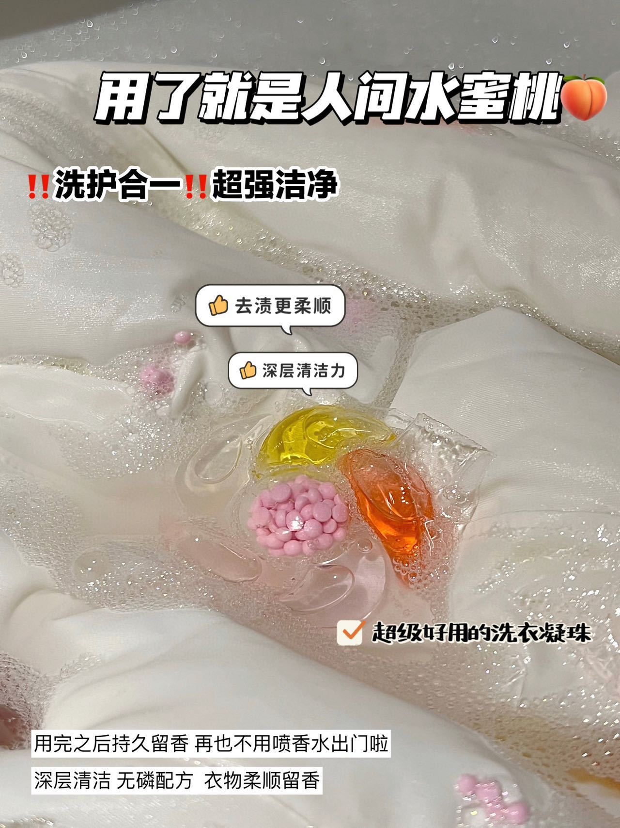 Gri Jing 6D 세탁 비즈 백도 복숭아 꿀 향기 오염 제거 및 얼룩 제거 오래 지속되는 향기 부드러운 멀티 효과 세탁 비즈