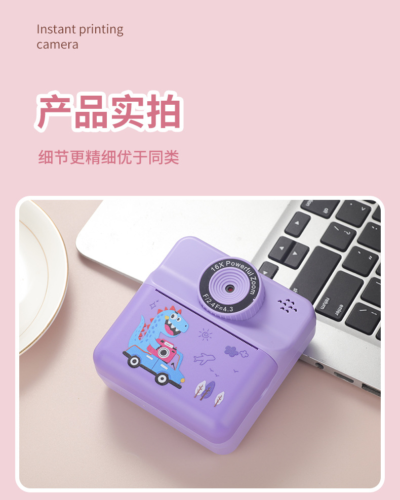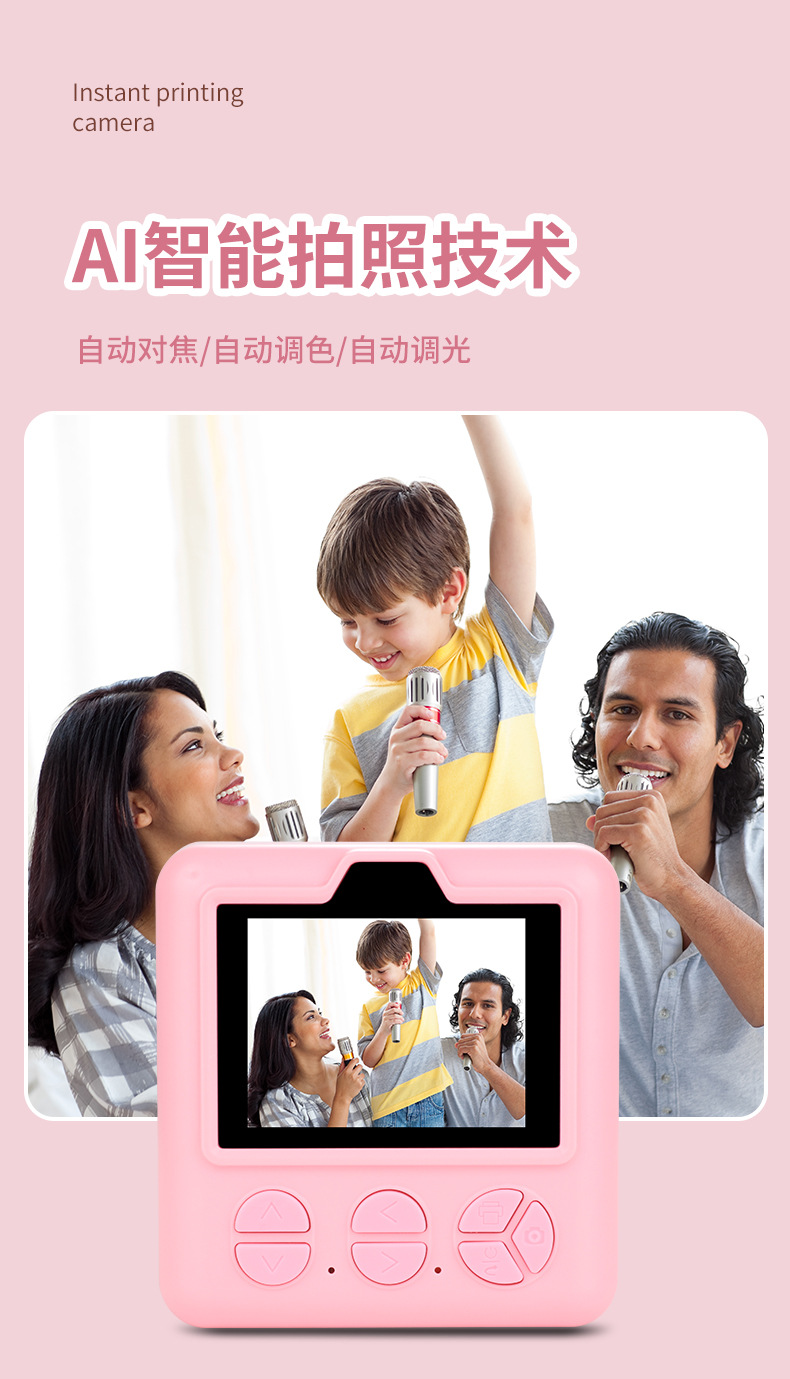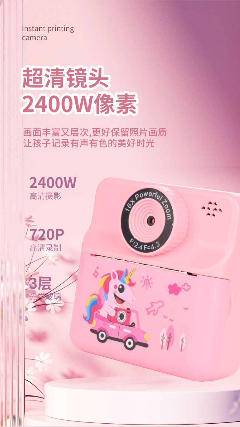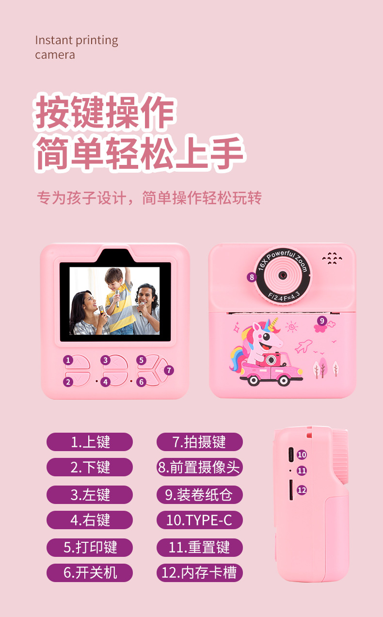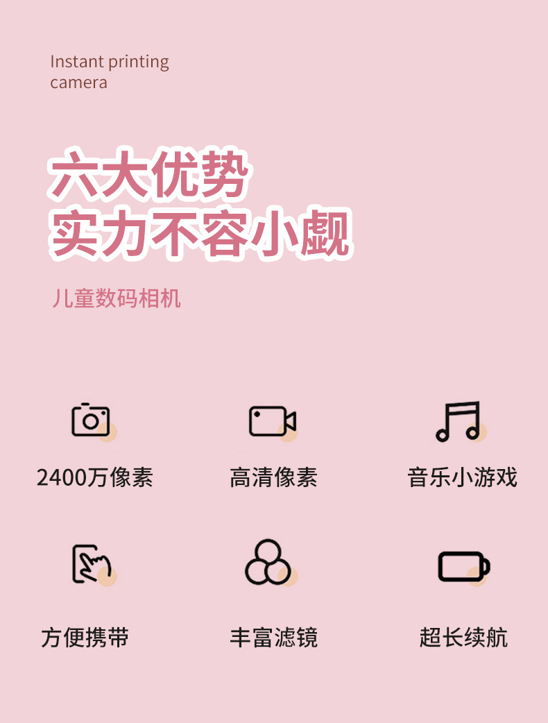 本产品儿童手机H18,主要特点是可以立拍立打印相片功能,大屏幕2.4寸,可以拍照,录像,大头贴变化,玩小游戏等功能,支持32G内存卡,配件有说明书,充电线,挂绳,天地盒子和打印纸。