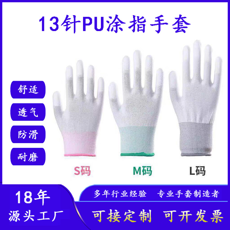 PU 코팅 손가락 장갑 도매 흰색 13 바늘 PU 줄무늬 딥 고무 보호 작업 정전기 방지 노동 보호 장갑