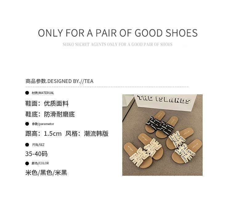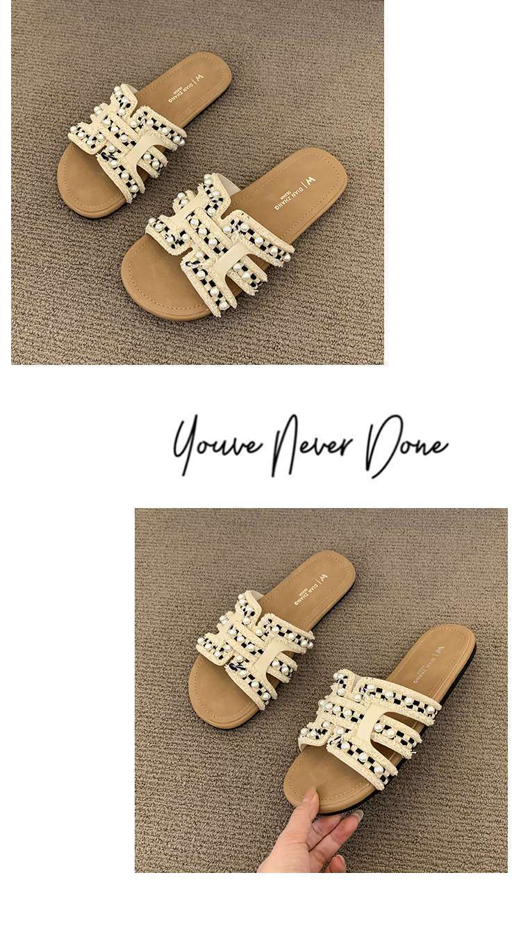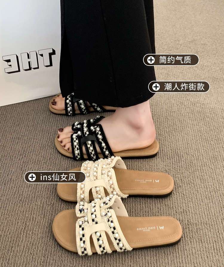패셔너블하고 다재다능한 소프트솔 펄 비치 샌들, 한국식 작은 향기 플랫 슬리퍼, 여성 아우터웨어 2025 가을 여름 신스타일