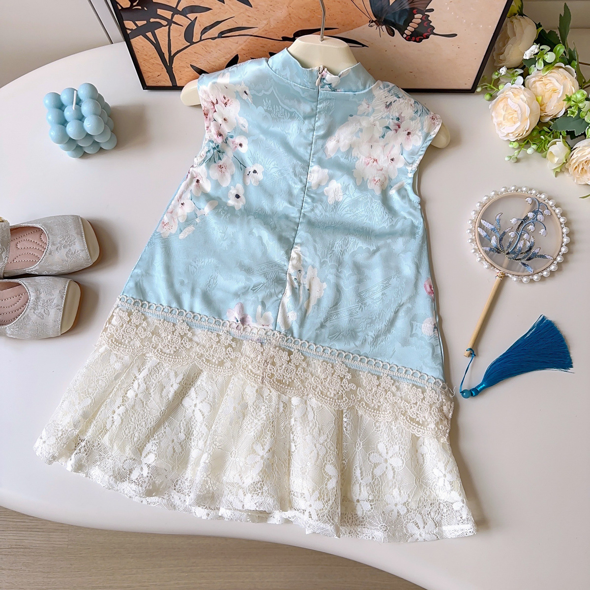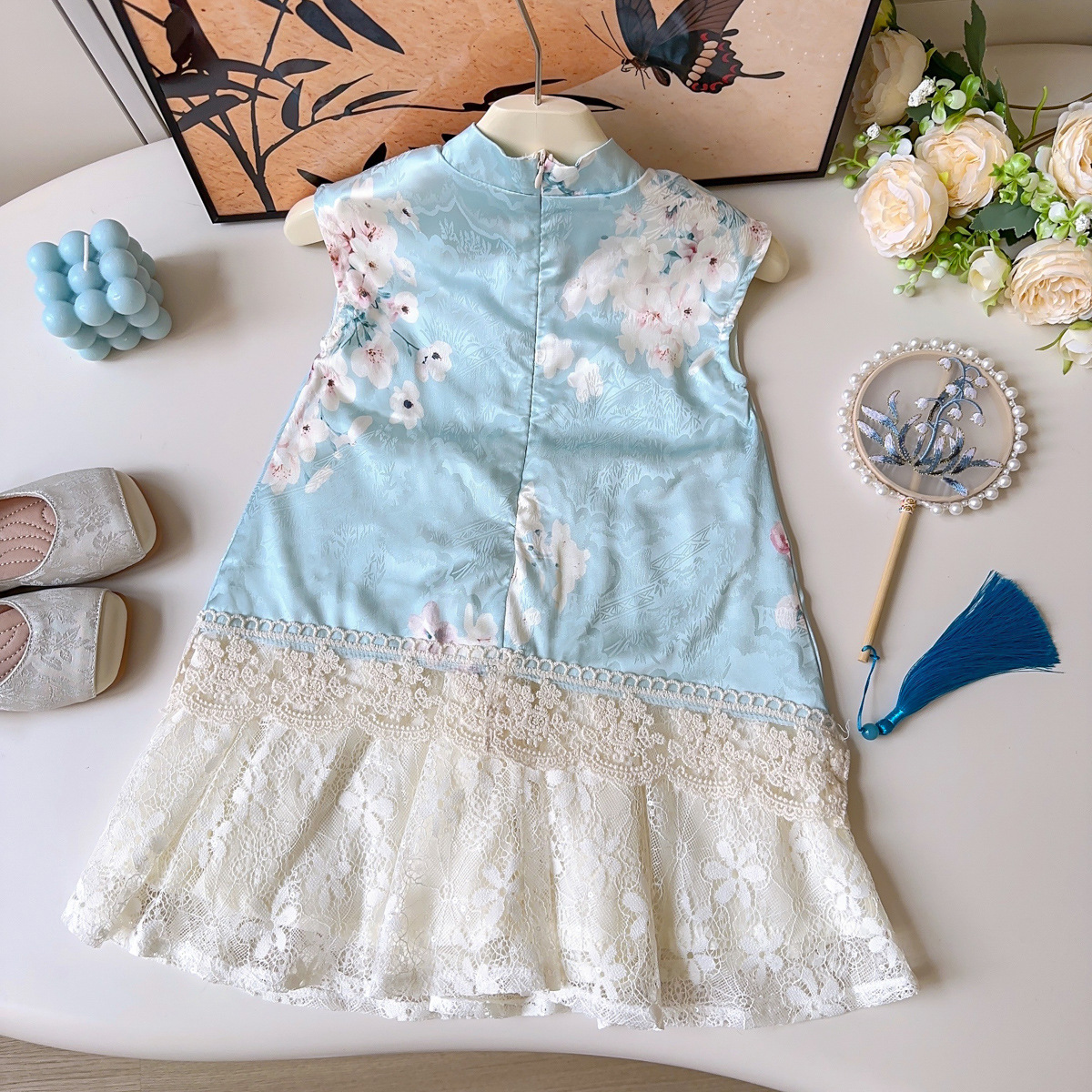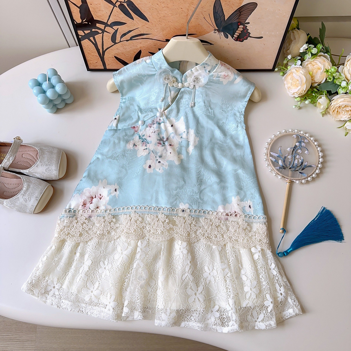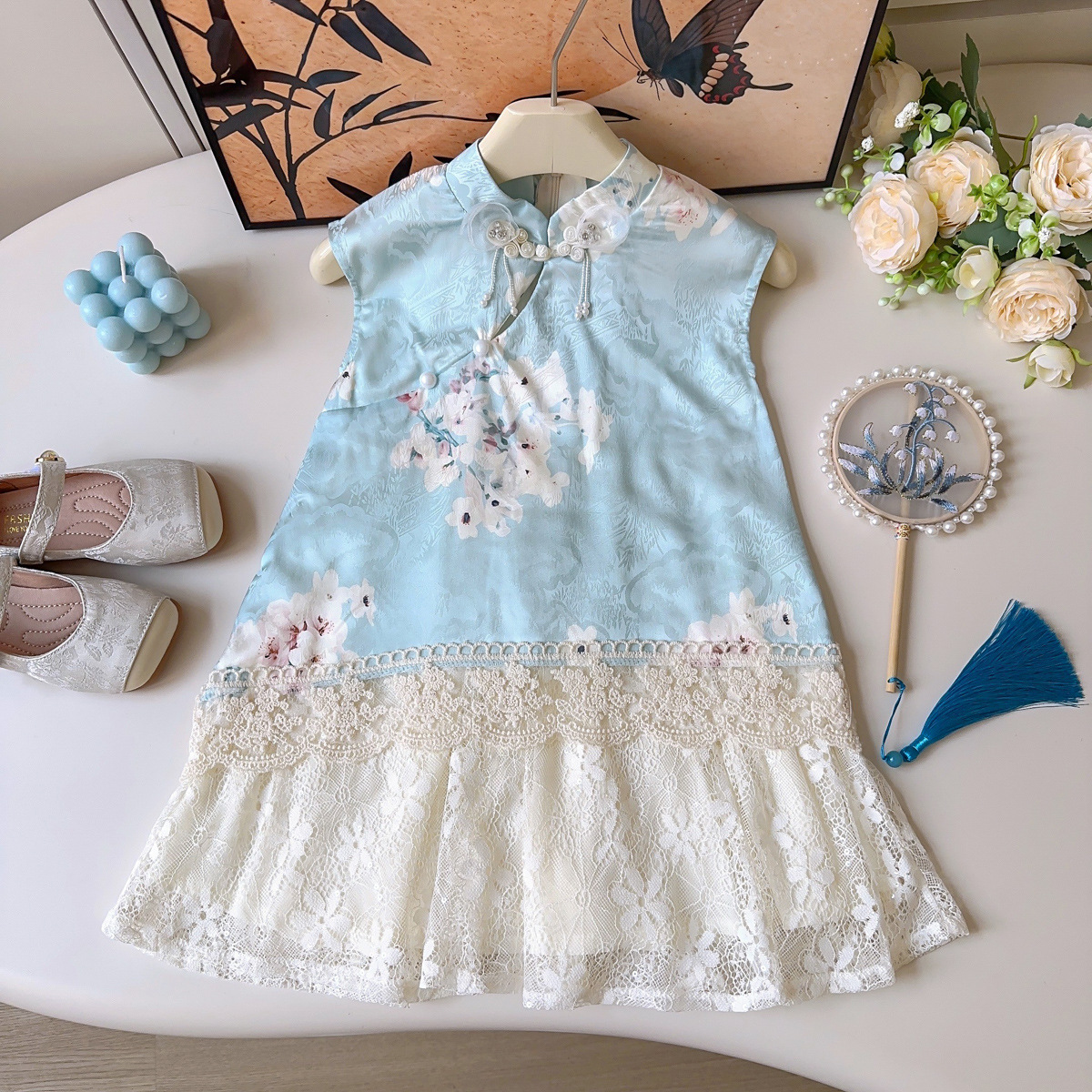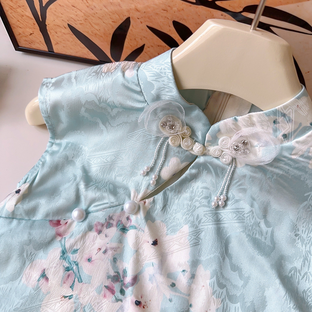 2025 새로운 여름 소녀의 새로운 중국 스타일 민소매 드레스, 서양식 어린 소녀의 고대 스타일 치파오 Hanfu 어린이 드레스