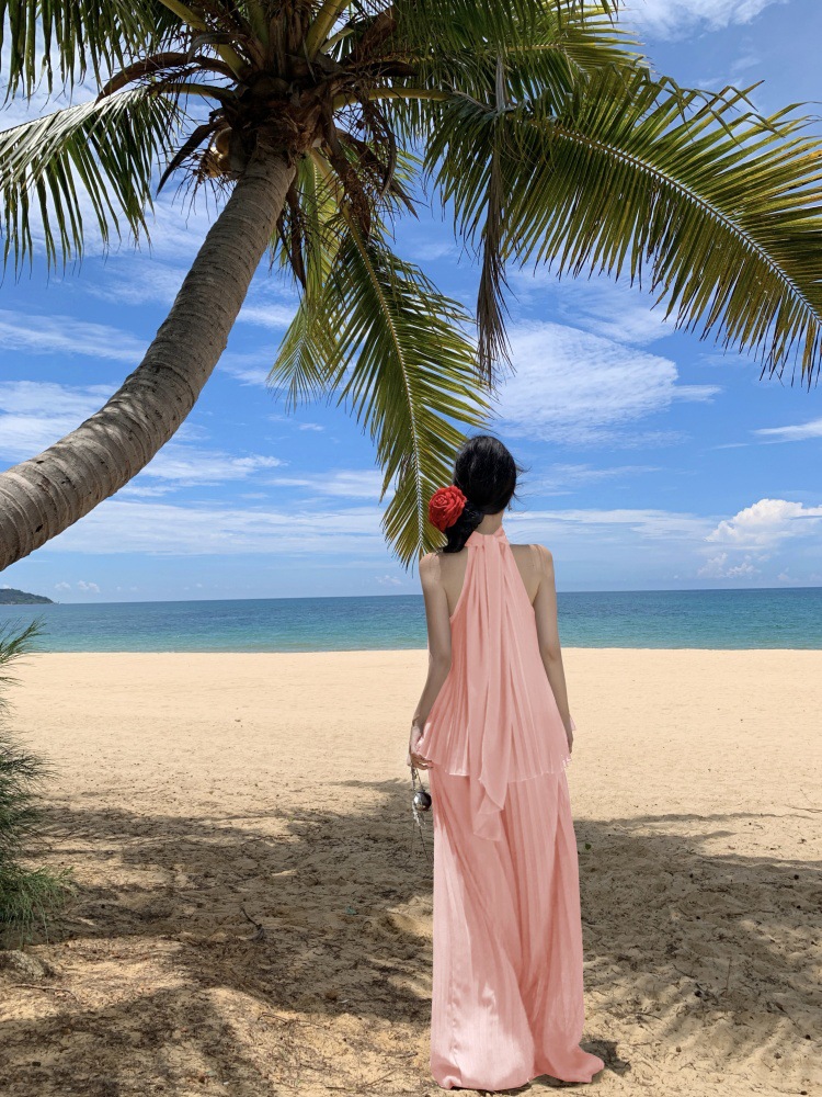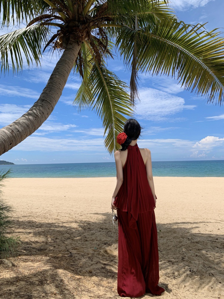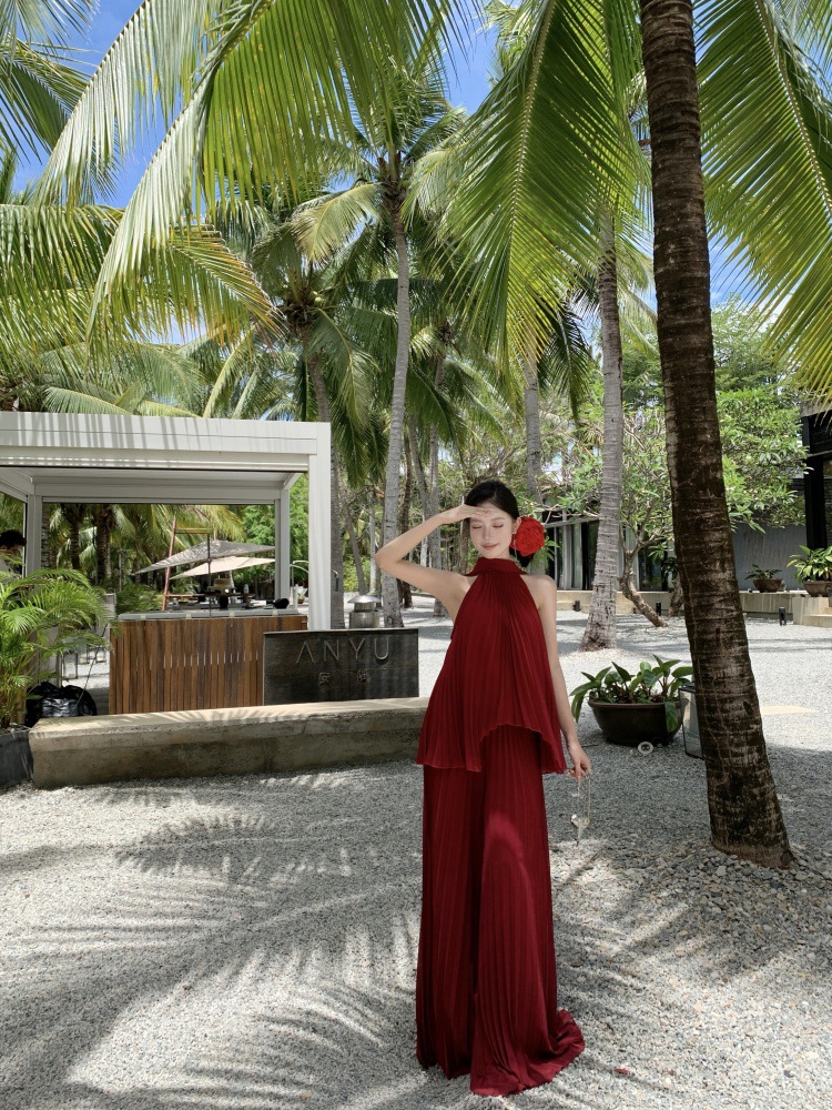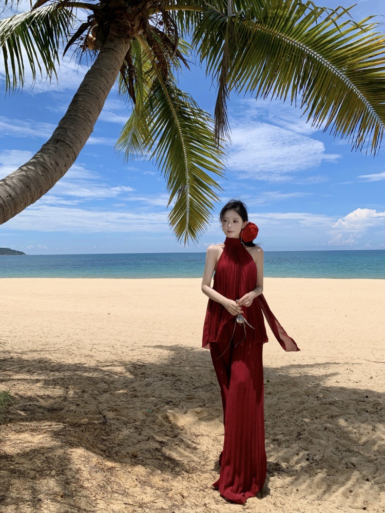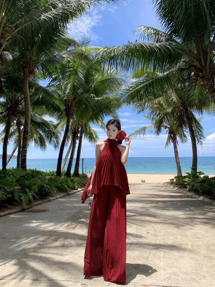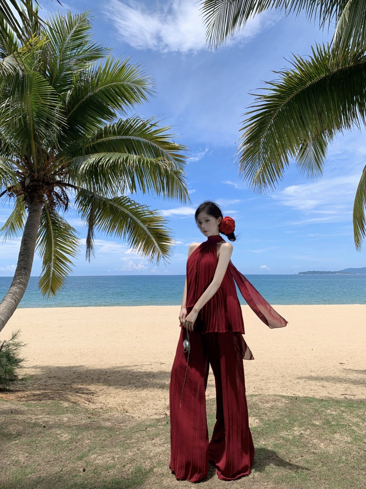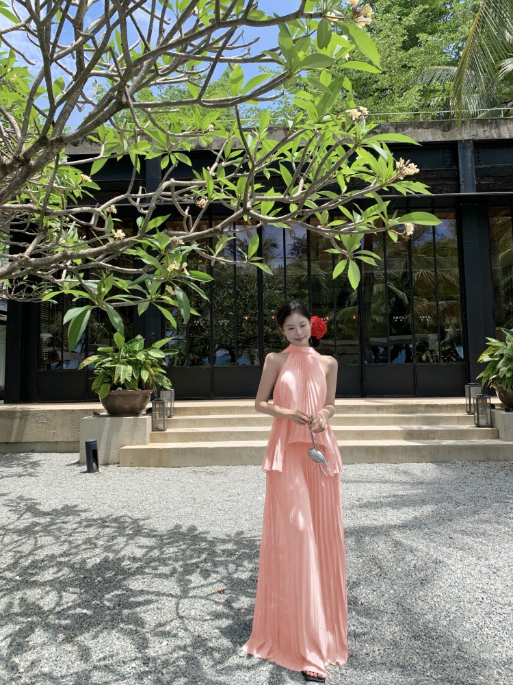 여름에 아름다운 작은 정장 스커트, 부드러운 스타일, 매우 멋진 핑크 홀터넥 탑, 여성용 와이드 레그 캐주얼 팬츠 투피스 세트