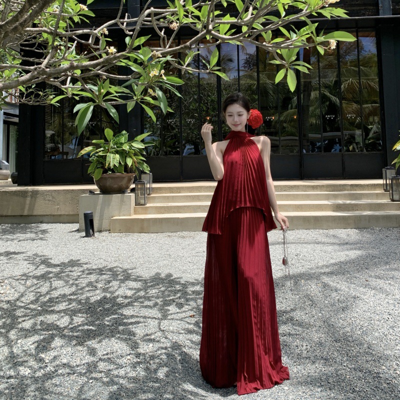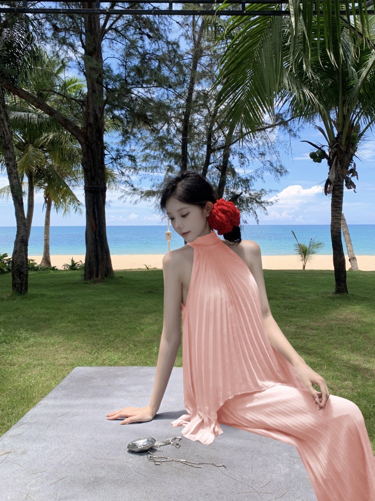 여름에 아름다운 작은 정장 스커트, 부드러운 스타일, 매우 멋진 핑크 홀터넥 탑, 여성용 와이드 레그 캐주얼 팬츠 투피스 세트스토어 가기