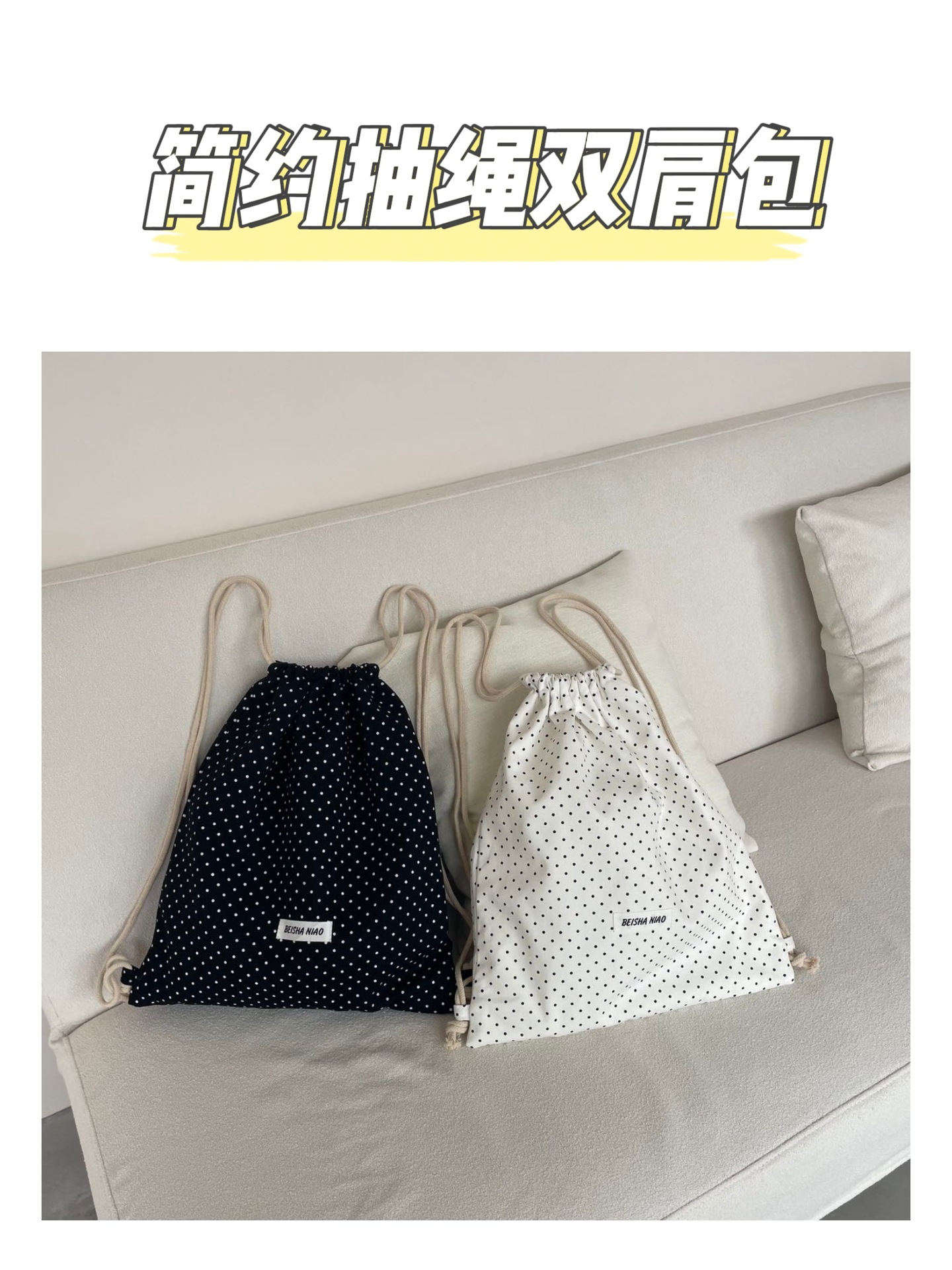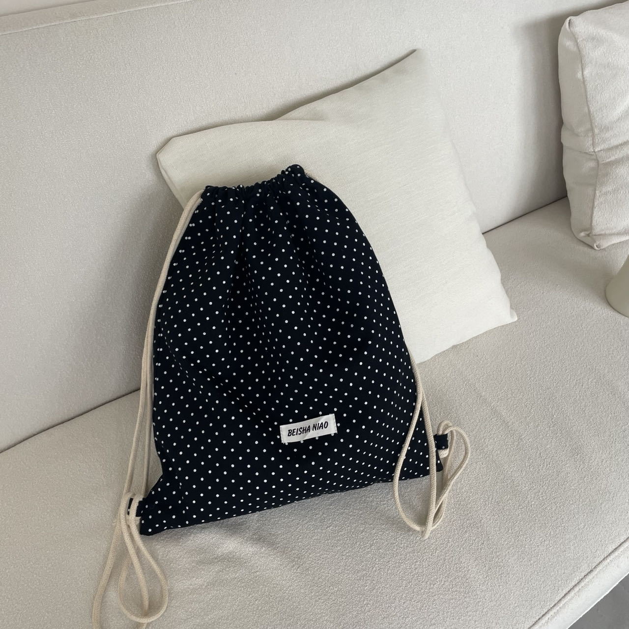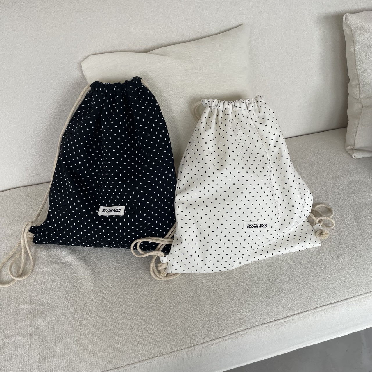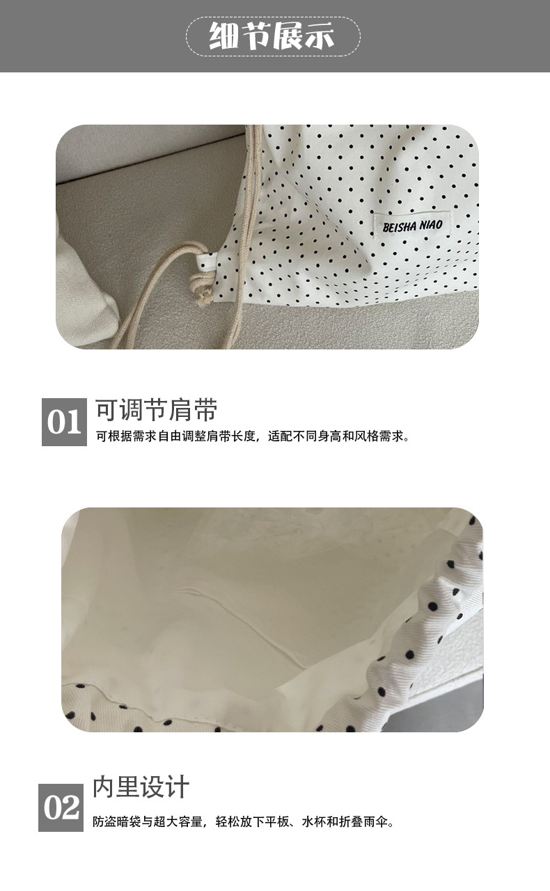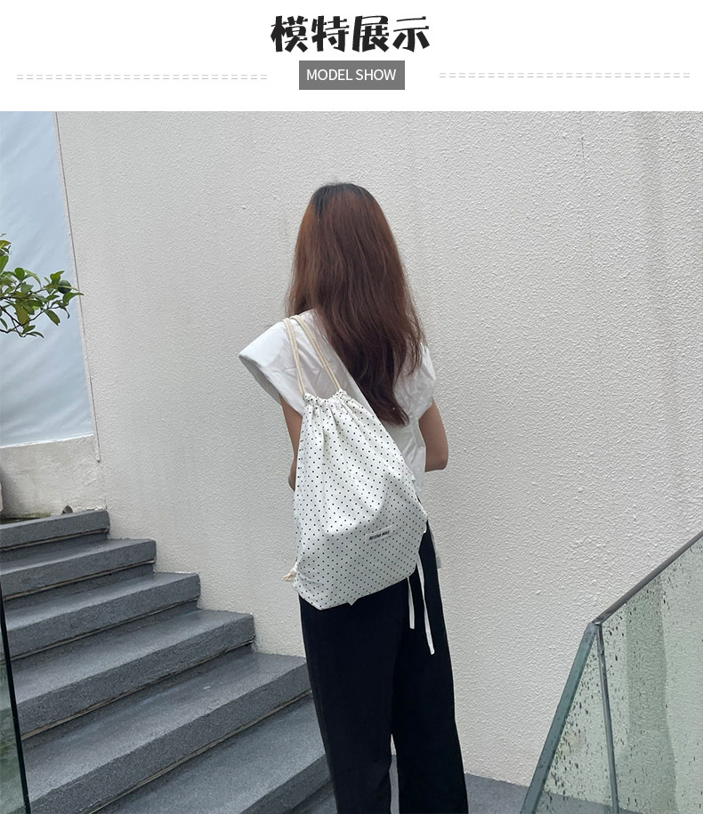 새로운 핫셀링 틈새 드로스트링 폴카 도트 백팩, 캐주얼하고 심플하며 다재다능한 대용량 여행 및 통근 백팩스토어 가기