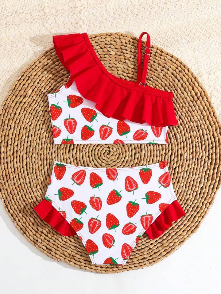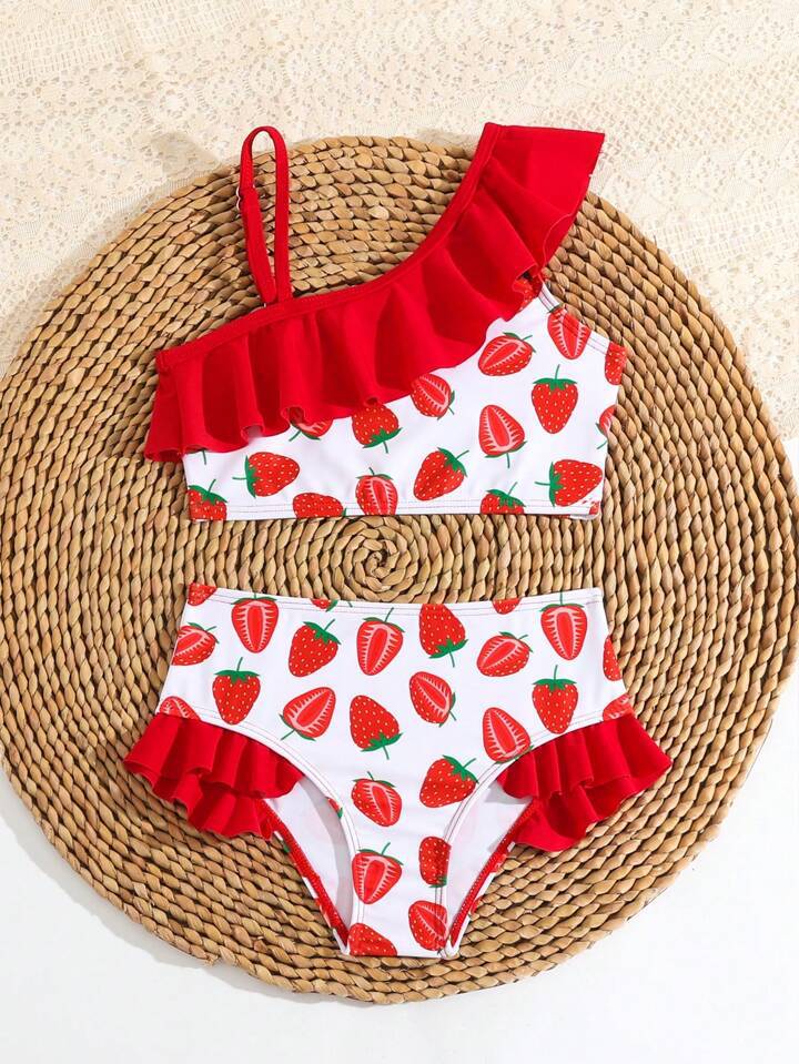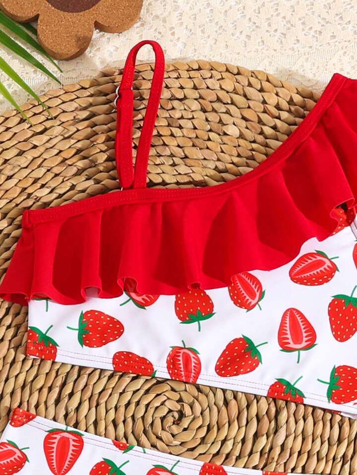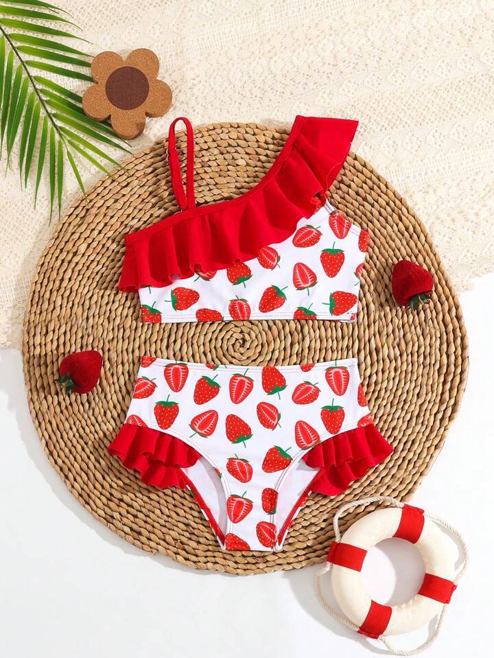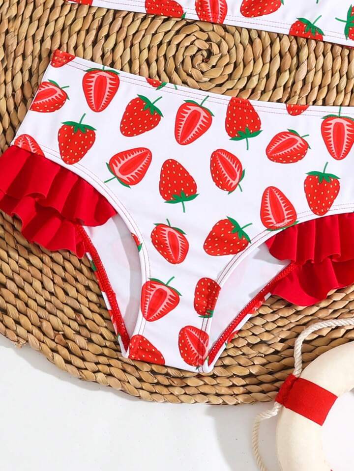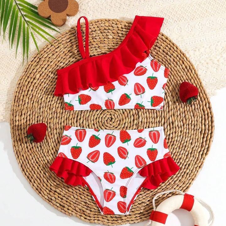 2025년 신형 여아 스플릿 수영복 3피스 레드 딸기 중대형 아동용 크로스보더 대외 무역 커버업 재킷 수영복스토어 가기