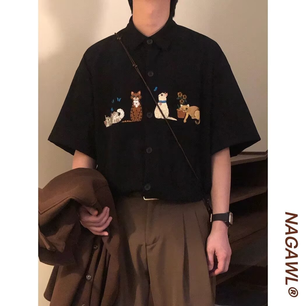 여름 미국 복고풍 대학 스타일 고양이 자수 코듀로이 반팔 셔츠 남성용 다용도 캐주얼 셔츠스토어 가기