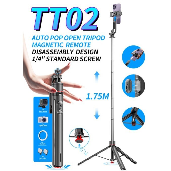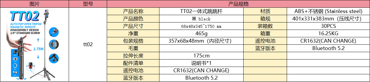 TT02 일체형 점프 폴 블루투스 원격 제어 원클릭 팝업 휴대폰 라이브 방송 셀카봉 다기능 삼각대 스탠드